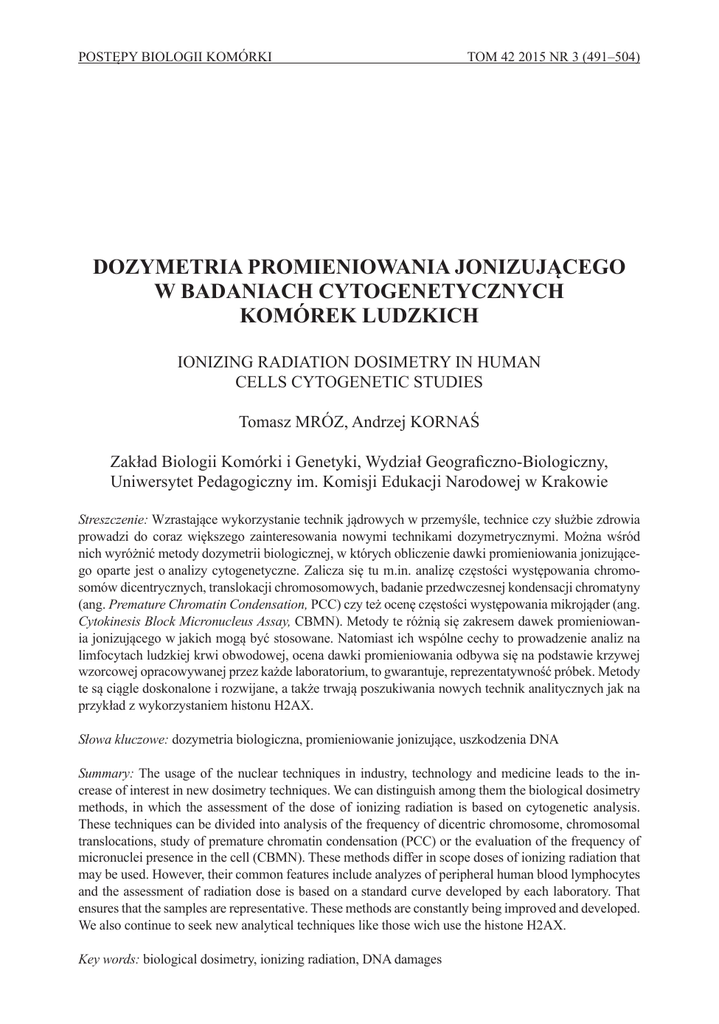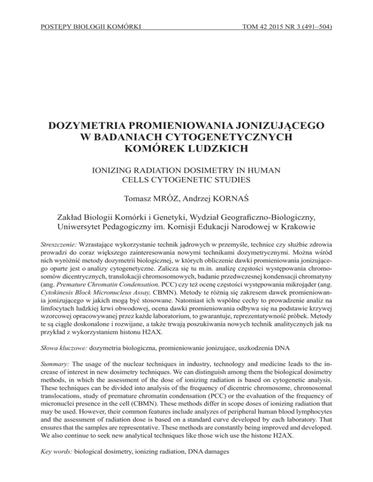 POSTĘPY BIOLOGII KOMÓRKI TOM 42 2015 NR 3 (491–504) DOZYMETRIA PROMIENIOWANIA JONIZUJĄCEGO W BADANIACH CYTOGENETYCZNYCH KOMÓREK LUDZKICH IONIZING RADIATION DOSIMETRY IN HUMAN CELLS CYTOGENETIC STUDIES Tomasz MRÓZ, Andrzej KORNAŚ Zakład Biologii Komórki i Genetyki, Wydział Geograficzno-Biologiczny, Uniwersytet Pedagogiczny im. Komisji Edukacji Narodowej w Krakowie Streszczenie: Wzrastające wykorzystanie technik jądrowych w przemyśle, technice czy służbie zdrowia prowadzi do coraz większego zainteresowania nowymi technikami dozymetrycznymi. Można wśród nich wyróżnić metody dozymetrii biologicznej, w których obliczenie dawki promieniowania jonizującego oparte jest o analizy cytogenetyczne. Zalicza się tu m.in. analizę częstości występowania chromosomów dicentrycznych, translokacji chromosomowych, badanie przedwczesnej kondensacji chromatyny (ang. Premature Chromatin Condensation, PCC) czy też ocenę częstości występowania mikrojąder (ang. Cytokinesis Block Micronucleus Assay, CBMN). Metody te różnią się zakresem dawek promieniowania jonizującego w jakich mogą być stosowane. Natomiast ich wspólne cechy to prowadzenie analiz na limfocytach ludzkiej krwi obwodowej, ocena dawki promieniowania odbywa się na podstawie krzywej wzorcowej opracowywanej przez każde laboratorium, to gwarantuje, reprezentatywność próbek. Metody te są ciągle doskonalone i rozwijane, a także trwają poszukiwania nowych technik analitycznych jak na przykład z wykorzystaniem histonu H2AX. Słowa kluczowe: dozymetria biologiczna, promieniowanie jonizujące, uszkodzenia DNA Summary: The usage of the nuclear techniques in industry, technology and medicine leads to the increase of interest in new dosimetry techniques. We can distinguish among them the biological dosimetry methods, in which the assessment of the dose of ionizing radiation is based on cytogenetic analysis. These techniques can be divided into analysis of the frequency of dicentric chromosome, chromosomal translocations, study of premature chromatin condensation (PCC) or the evaluation of the frequency of micronuclei presence in the cell (CBMN). These methods differ in scope doses of ionizing radiation that may be used. However, their common features include analyzes of peripheral human blood lymphocytes and the assessment of radiation dose is based on a standard curve developed by each laboratory. That ensures that the samples are representative. These methods are constantly being improved and developed. We also continue to seek new analytical techniques like those wich use the histone H2AX. Key words: biological dosimetry, ionizing radiation, DNA damages 492 T. MRÓZ, A. KORNAŚ WSTĘP Promieniowanie jonizujące jako stale i nieprzerwanie oddziaływujący na człowieka czynnik środowiska naturalnego, najczęściej kojarzone jest bądź to z funkcjonowaniem instalacji przemysłu jądrowego, czy też wykorzystaniem militarnym. Ten popularny pogląd sprawia, iż promieniotwórczość wydaje się być zjawiskiem odległym i dla wielu z nas dość zagadkowym. Jednakże z zastosowaniami zjawiska promieniotwórczości spotykamy się na co dzień, w takich dziedzinach życia jak ochrona zdrowia i diagnostyka medyczna [27], ochrona przeciwpożarowa, czy różne gałęzie przemysłu pozornie niezwiązane z wykorzystaniem promieniowania jonizującego [34]. Ponieważ organizm człowieka nie posiada narządów zmysłów pozwalających na detekcję promieniowania jonizującego, niezbędne okazało się opracowanie technik pozwalających na oszacowanie dawek, jakie otrzymują osoby narażone z racji wykonywanego zawodu, bądź przypadkowego z nim kontaktu. Dozymetria, jako gałąź fizyki jądrowej zajmująca się pomiarami dawek promieniowania jonizującego, posługuje się trzema podstawowymi pojęciami: • dawka pochłonięta – wyrażona jest ona w grejach [Gy]. Definiowana jest ona jako ilość energii pochłoniętej przez jednostkę masy: Ponieważ energię emitowanych cząstek lub kwantów promieniowania jonizującego opisuje się w kiloelektronowoltach należy przeliczyć ją na energię w dżulach. • dawka równoważna – jest to wielkość uwzględniająca nie tylko energię zdeponowaną w jednostce masy ale również rodzaj promieniowania. Obliczana jest ona przez pomnożenie dawki pochłoniętej przez współczynnik wagowy promieniowania (WR). Wartości współczynnika WR wahają się w zakresie od 1 do 20 i zostały zawarte w tab. 1. Jednostką dawki równoważnej jest siwert [Sv]. • dawka skuteczna – parametr uwzględniający oprócz rodzaju promieniowania jonizującego także radiowrażliwość różnych tkanek i narządów. Wielkość ta obliczana jest jako iloczyn dawki równoważnej oraz współczynnika wagowego tkanki (WT). Wartości współczynnika WT wahają się w zakresie od 0,01 dla skóry do 0,2 dla gonad. Wartości współczynnika wagowego tkanki podano w tab. 2. Jednostką dawki skutecznej podobnie jak w przypadku dawki równoważnej jest siwert [Sv]. Do oszacowania powyżej zdefiniowanych wielkości można posłużyć się różnymi metodami. Najprostszą metodą obliczenia dawek promieniowania jest ich obliczenie na podstawie rodzaju źródła promieniotwórczego, jego aktywności oraz czasu i odległości przebywania w zasięgu promieniowania przez to źródło wysy- DOZYMETRIA PROMIENIOWANIA JONIZUJĄCEGO W BADANIACH... 493 łanego. Innym sposobem jest określenie otrzymanej dawki przy użyciu filmów radiochromowych lub dawkomierzy termoluminescencyjnych1. Wszystkie te metody nie dają jednak bezpośredniego obrazu zmian, jakie powodować może promieniowanie jonizujące w organizmie człowieka. Taką możliwość oferują natomiast metody dozymetrii biologicznej. TABLELA 1. Wartości współczynników wagowych promieniowania jonizującego [28] TABLE 1. Values of Radiation Weighting Factors [28] Rodzaj promieniowania Współczynnik wagowy fotony 1 elektrony, pozytony, miony 1 neutro