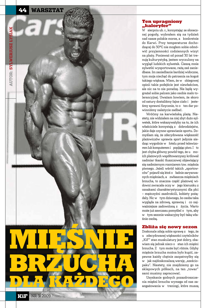 44 warsztat AUTOR: SYLWERIUSZ ŁYSIAK Ten upragniony „kaloryfer” W sierpniu ub. r., korzystając ze słonecznej pogody, wybrałem się na tydzień nad nasze polskie morze, a konkretnie do Karwi. Przy temperaturze dochodzącej do 30°C nie mogłem sobie odmówić przyjemności codziennych wizyt na plaży. Ponieważ od ponad 30 lat trenuję kulturystykę, jestem wyczulony na wygląd ludzkich sylwetek. Cieszą mnie sylwetki wysportowane, rażą zaś zaniedbane. Im zaniedbanie bardziej widoczne, tym moja niechęć do patrzenia na kogoś takiego większa. Wiem, że w obiegowej opinii takie podejście jest niewłaściwe, ale nic na to nie poradzę. Nie będę wygrażał sobie palcem jako osobie mało tolerancyjnej. Uważam bowiem, że skoro od natury dostaliśmy fajne ciało i jesteśmy sprawni fizycznie, to o ten dar powinniśmy należycie zadbać. Wróćmy na karwieńską plażę. Niestety, nie widziałem na niej zbyt dużo sylwetek, które wskazywałyby na to, że ich właściciele korzystają z dobrodziejstw, jakie daje czynne uprawianie sportu. Domyślam się, że zdecydowana większość plażowiczów uprawia sport jedynie siedząc wygodnie w fotelu przed telewizorem lub komputerem i popijając piwo. I to jest chyba główny powód tego, że u moich plażowych współtowarzyszy królował nadmiar tkanki tłuszczowej objawiający się nadmiernym rozmiarem tzw. mięśnia piwnego. Jeżeli wśród takich „sportowców” pojawił się ktoś o ładnie zarysowanych mięśniach, a zwłaszcza mięśniach brzucha, to znaczna część plażowej widowni zwracała oczy w jego kierunku z oznakami charakterystycznymi dla płci – mężczyźni zazdrościli, kobiety pożądały. Nic w tym dziwnego, bo osoba taka wygląda na zdrową, sprawną i co najważniejsze zadowoloną z życia. Warto może już zawczasu pomyśleć o tym, aby w tym sezonie wakacyjny być taką właśnie osobą. Mięśnie brzucha dla każdego KiF nr 3/ 2009 Zbliża się nowy sezon Doskonale zdaję sobie sprawę z tego, że u zdecydowanej większości czytelników „KiF” stan muskulatury jest dobry, obawiam się jednak nieco o stan ich mięśni brzucha. Z tym może być różnie. Gdyby mięśnie brzucha można było kupić, zapewne każdy chętnie zaopatrzyłby się w jak najdoskonalszą wersję „sześciopaku”. Niestety, nie znajdziemy go na sklepowych półkach, na ten „towar” sami musimy zapracować. Uzyskanie godnych pozazdroszczenia mięśni brzucha wymaga od nas zaangażowania w treningi, które muszą warsztat 45 Ćwiczenia na górną część mięśni prostych brzucha Skłony tułowia na ławce skośnej; Skłony tułowia leżąc na materacu; Ściąganie linki wyciągu w klęku; Skłony tułowia leżąc na materacu, podudzia oparte o ławkę poziomą. • • • • Mięśnie brzucha mogą mieć różne kształty – od wytrenowanego sześciopaku, po piwny „bebech” zawierać w sobie sporą porcje ćwiczeń aerobowych. Wymagają też diety o odpowiednim stopniu kaloryczności. To wszystko jest trochę trudne do złożenia w jedną całość. I dlatego sądzę, że tylko u niewielkiego procenta ćwiczących, mięśnie brzucha są dobrze „wycięte” i dobrze widoczne. Na pewno są one takie jak trzeba u takich mistrzów jak: Robert Piotrkowicz, Radek Słodkiewicz, czy Arek Szyderski. Poznajmy ich opinie. Robert Piotrkowicz Bez odpowiedniego stopnia odtłuszczenia nie mamy co marzyć o tym, aby kogokolwiek zaszokować mięśniami brzucha. Ich po prostu nie będzie widać, a jedyne co może być w takiej sytuacji widać, to tylko mniej lub bardziej tłusty brzuch. W takim wypadku na plażę lepiej wychodzić w koszulce, chyba że wokół nas są osoby z tak samo „dotrenowanymi” mięśniami brzucha, jak my. W treningu na mięśnie brzucha nie stosuję jakichś specjalnych metod treningowych, ani też tajemniczych ćwiczeń. Mój trening jest prosty. Mięśnie brzucha ćwiczę 2 razy w tygodniu, każdorazowo po około 15 minut. Jest to jedna duża 15 minutowa gigant seria (ćwiczenia wykonuję kolejno po sobie, bez przerw na odpoczynek). To z ilu składa się ćwiczeń, zależy od mojego samopoczucia i predyspozycji tego dnia. Zazwyczaj dobieram 4 ćwiczenia na dolną i 4 na górną część mięśni prostych brzucha. Cały trening mam ułożony tak, że ćwiczenia na dolną część przeplatają się z ćwiczeniami na część górną. Po wykonaniu całego kompletu ćwiczeń wykonuję go następny raz i jeszcze następny raz. Każdą serię robię do załamania ruchu, tzn. dotąd, dokąd tylko mogę. Przeważnie seria zawiera od 20 do 40 powtórzeń. Uważam, że do ćwiczeń nie powinno się używać dużych cię- żarów, bo tylko wyrobimy sobie siłę mięśni brzucha, a nie o to chodzi. Oczywiście siła też jest ważna, ale bez przesady. Priorytetem są dobrze dorzeźbione mięśnie brzucha – to jest kulturystyka! Wykonując ćwiczenia na mięśnie brzucha zwracam uwagę na to, aby zakres ruchu nie był zbyt duży. Często na salach treningowych widywałem osoby, które wykonując np. unoszenie tułowia na ławce skośnej, robiły bardzo długi zamaszysty ruch tułowiem, zupełnie niepotrzebnie zwiększając zaangażowanie mięśni zginaczy stawów biodrowych i osłabiając pracę mięśni brzucha. Oprócz mięśni prostych brzucha są jeszcze mięśnie skośne (wewnętrzne i zewnętrzne) znajdujące się po bokach. Dla ćwiczących, którzy nie planują startów w zawodach kulturystycznych, rozwój mięśni skośnych brzucha jest niepotrzebny, a czasami nawet wręcz niewskazany. Gdy ćwiczymy te mięśnie, rzeczą Ćwiczenia na dolną część mięśni prostych brzucha Unoszenie nóg w zwisie na drążku; Unoszenie nóg na poręczach; Unoszenie nóg na ławce skośnej; Unoszenie nóg leżąc plecami na materacu; Przemienne unoszenie kolan do klatki piersiowej leżąc plecami na materacu; • • • • • naturalną jest to, że się rozwijają, a co za tym idzie – zwiększa się szerokość w