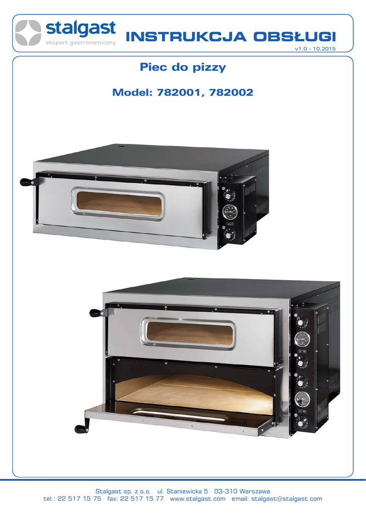 INSTRUKCJA OBSŁUGI v1.0 - 10.2015 Piec do pizzy Model: 782001, 782002 Stalgast sp. z o.o. ul. Staniewicka 5 03-310 Warszawa tel.: 22 517 15 75 fax: 22 517 15 77 www.stalgast.com email: [email protected] SPIS TREŚCI 1. INSTRUKCJE BEZPIECZEŃSTWA............................................................................................................................................. 3 2. BUDOWA.................................................................................................................................................................................................. 3 2.1. Przeznaczenie urządzenia............................................................................................................................................................ 3 3. PANEL STEROWANIA....................................................................................................................................................................... 4 4. DANE TECHNICZNE ........................................................................................................................................................................ 5 4.1. Wymiary............................................................................................................................................................................................... 5 5. MONTAŻ................................................................................................................................................................................................... 5 5.1. Podłączenie odprowadzenia spalin............................................................................................................................................ 6 5.2. Podłączenie urządzenia do sieci zasilającej w energię elektryczną.............................................................................. 6 6. OBSŁUGA................................................................................................................................................................................................. 7 6.1. Pierwsze uruchomienie urządzenia........................................................................................................................................... 7 6.2. Włączanie pieca................................................................................................................................................................................ 7 6.3. Wyłączanie pieca.............................................................................................................................................................................. 7 7. CZYSZCZENIE I KONSERWACJA.............................................................................................................................................. 8 7.1. Rutynowa konserwacja urządzenia............................................................................................................................................ 8 7.2. Nadprogramowa konserwacja urządzenia............................................................................................................................. 8 7.3. Konserwacja komponentów elektrycznych............................................................................................................................ 8 7.4. Wymiana lampy w komorze pieczenia...................................................................................................................................... 8 8. USUWANIE ZUŻYTYCH URZĄDZEŃ.................................................................................................................................... 8 9. GWARANCJA.......................................................................................................................................................................................... 8 -2- Dziękujemy Państwu za zakup naszego produktu. Przed pierwszym użyciem prosimy dokładnie zapoznać się z niniejszą instrukcją obsługi. Kopiowanie niniejszej instrukcji bez zgody producenta jest zabronione. Zdjęcia oraz rysunki mają charakter poglądowy i mogą różnić się od zakupionego urządzenia. UWAGA: Instrukcję należy przechowywać w bezpiecznym oraz dostępnym dla personelu miejscu. Producent zastrzega sobie prawo do zmiany parametrów technicznych urządzeń bez zapowiedzi. 1. INSTRUKCJE BEZPIECZEŃSTWA •• Nieprawidłowa obsługa i niewłaściwe użytkowanie może spowodować poważne uszkodzenie urządzenia lub zranienie osób. •• Urządzenie może być stosowane wyłącznie w celu, do którego zostało zaprojektowane. •• Producent nie ponosi żadnej odpowiedzialności za szkody spowodowane nieprawidłową obsługą i niewłaściwym użytkowaniem urządzenia. •• W czasie użytkowania zabezpiecz urządzenie i wtyczkę kabla zasilającego przed kontaktem z wodą lub innymi płynami. W przypadku, gdyby przez nieuwagę urządzenie wpadło do wody, należy natychmiast wyciągnąć wtyczkę z kontaktu, a następnie zlecić kontrolę urządzenia specjaliście. Nieprzestrzeganie tej instrukcji może spowodować zagrożenie życia. •• •• •• •• •• •• •• •• •• •• •• •• •• •• •• Nigdy nie otwieraj samodzielnie obudowy urządzenia. Nie wtykaj żadnych przedmiotów w obudowę urządzenia. Nie dotykaj wtyczki kabla zasilającego wilgotnymi rękami. Regularnie kontroluj stan wtyczki i kabla. W przypadku wykrycia uszkodzenia wtyczki lub kabla, zleć naprawę w wyspecjalizowanym punkcie naprawczym. W przypadku, gdy urządzenie spadnie lub ulegnie uszkodzeniu w inny sposób, przed dalszym użytkowaniem zawsze zleć przeprowadzenie kontroli i ewentualną naprawę w wyspecjalizowanym punkcie naprawczym. Nigdy nie naprawiaj urządzenia samodzielnie - może to spowodować zagrożenie życia. Chroń kabel zasilający przed kontaktem z ostrymi lub