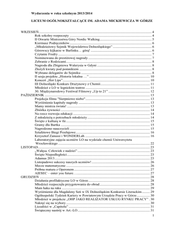 Wydarzenia w roku szkolnym 2013/2014 LICEUM OGÓLNOKSZTAŁCĄCE IM. ADAMA MICKIEWICZA W GÓRZE WRZESIEŃ................................................................................................................................ 4 Rok szkolny rozpoczęty ............................................................................................. 4 II Otwarte Mistrzostwa Góry Nordic Walking........................................................... 5 Kiermasz Podręczników............................................................................................. 6 „Młodzieżowy Sejmik Województwa Dolnośląskiego” ............................................ 6 Górowscy kijkarze w Barlinku… górą! ..................................................................... 6 Czytanie Fredry .......................................................................................................... 7 Nominowana do prestiżowej nagrody ........................................................................ 7 Zebranie z Rodzicami................................................................................................. 8 Nagroda dla Zbigniewa Walerysia w Gdyni .............................................................. 8 Złożyli kwiaty pod pomnikiem .................................................................................. 8 Wybrano delegatów do Sejmiku ................................................................................ 8 II sesja projektu „Historia lokalna …” ..................................................................... 10 Koncert „Hot Lips”................................................................................................... 10 III Dolnośląski Konkurs Drużynowy z Chemii........................................................ 11 Młodzież z LO w legnickim teatrze ......................................................................... 11 30. Międzynarodowy Festiwal Filmowy „Up to 21” ............................................... 12 PAŹDZIERNIK ....................................................................................................................... 13 Projekcja filmu "Sierpniowe niebo" ......................................................................... 13 Wyróżnienie kapituły nagrody ................................................................................. 13 Mamy mistrza świata! .............................................................................................. 13 Zbiórka żywności ..................................................................................................... 14 Na rzecz rozwoju edukacji ....................................................................................... 14 Z młodzieżą o potrzebach młodzieży....................................................................... 14 Święto z kulturą w tle ............................................................................................... 15 Gramy dla Bartka ..................................................................................................... 15 Nagrodzono nauczycieli ........................................................................................... 15 Sztafetowe Biegi Przełajowe.................................................................................... 16 Krzysztof Zanussi i WONDERLab. ......................................................................... 16 Laboratoryjne zajęcia uczniów LO na wydziale chemii Uniwersytetu Wrocławskiego ........................................................................................................ 22 LISTOPAD............................................................................................................................... 23 „Wałęsa. Człowiek z nadziei” .................................................................................. 23 Święto Niepodległości.............................................................................................. 23 Adamus 2013............................................................................................................ 23 Listopadowe sukcesy naszych uczniów! .................................................................. 26 Mecze matematyczne ............................................................................................... 26 Próbna matura z Operonem ...................................................................................... 27 AIESEC – enter you future…................................................................................... 27 GRUDZIEŃ ............................................................................................................................. 28 Działania profilaktyczne LO w Górze...................................................................... 28 Młodzież rozpoczęła przygotowania do obrad......................................................... 28 Mam haka na raka .................................................................................................... 29 Wyróżnienie dla Magdaleny Seń w IX Dolnośląskim Konkursie Literackim ......... 29 Ogólnopolski Tydzień Kariery w Powiatowym Urzędzie Pracy w Górze............... 30 Młodzież w projekcie „OHP JAKO REALIZATOR USŁUG RYNKU PRACY” . 30 Nakręć się na wybory ............................................................................................... 30 Licealiści w „Capitolu” ............................................................................................ 31 Świąteczny nastrój w Art.-LO.................................................................................. 31 1 Spotkanie z zawodnikami Nordic Walking.............................................................. 31 Pierwsze posiedzenie Młodzieżowego Sejmiku....................................................... 32 Laureatki konkursu literackiego ..................................