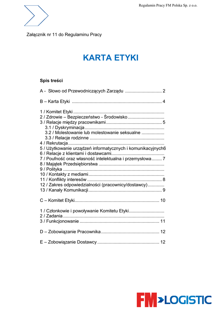 Regulamin Pracy FM Polska Sp. z o.o. Załącznik nr 11 do Regulaminu Pracy KARTA ETYKI Spis treści A - Słowo od Przewodniczących Zarządu ............................. 2 B – Karta Etyki ....................................................................... 4 1 / Komitet Etyki ........................................................................ 2 / Zdrowie – Bezpieczeństwo - Środowisko ............................. 3 / Relacje między pracownikami ............................................ 5 3.1 / Dyskryminacja ............................................................... 3.2 / Molestowanie lub molestowanie seksualne .................. 3.3 / Relacje rodzinne ........................................................... 4 / Rekrutacja ............................................................................ 5 / UŜytkowanie urządzeń informatycznych i komunikacyjnych6 6 / Relacje z klientami i dostawcami.......................................... 7 / Poufność oraz własność intelektualna i przemysłowa ........ 7 8 / Majątek Przedsiębiorstwa .................................................... 9 / Polityka ................................................................................ 10 / Kontakty z mediami ............................................................ 11 / Konflikty interesów ........................................................... 8 12 / Zakres odpowiedzialności (pracownicy/dostawcy) ............. 13 / Kanały Komunikacji .......................................................... 9 C – Komitet Etyki................................................................... 10 1 / Członkowie i powoływanie Komitetu Etyki ............................ 2 / Zadania ................................................................................ 3 / Funkcjonowanie ............................................................... 11 D – Zobowiązanie Pracownika .............................................. 12 E – Zobowiązanie Dostawcy ................................................. 12 Regulamin Pracy FM Polska Sp. z o.o. Słowo od Przewodniczących Zarządu : Grupa FM LOGISTIC1 jest wiodącą firmą o międzynarodowym zasięgu, która działa w ponad 12 krajach i zatrudnia niemal 14.000 pracowników, reprezentujących równie liczne jak i zróŜnicowane regiony i specjalności. Dlatego teŜ, nasz rozwój i trwałość muszą opierać się na wspólnym przestrzeganiu zasad etycznych wypływających z naszych wartości i naszej kultury przedsiębiorstwa. Zasady te muszą inspirować i na co dzień wskazywać drogę działania wszystkim kobietom i męŜczyznom w Przedsiębiorstwie. Jest to fundament sukcesu Przedsiebiorstwa tak spójnego jak nasze a takŜe racja istnienia dla naszej Karty Etyki. Cztery główne wartości, z Kultury Naszej Organizacji i Zasad MenedŜera, leŜą u podstaw naszego zobowiązania etycznego: • • • • PRACA ZESPOŁOWA: Lojalność – Solidarność – Przejrzystość, razem gwarantują wiarygodność naszych działań wewnątrz i na zewnątrz firmy. ODPOWIEDZIALNOŚĆ: niech się przejawia w solidarności z naszymi decyzjami i działaniami oraz profesjonalizmie. POSZANOWANIE: dowód zaufania i wytrwałości w naszych działaniach i kontaktach. KONTROLA: spoiwo zaufania, gwarancja bezpieczeństwa i zabezpieczenia Przedsiębiorstwa i kaŜdego pracownika. Aby te wartości etyczne miały sens, muszą się one wyraŜać w pewnej liczbie zasad postępowania dotyczących naszej sfery działalności: przestrzeganie Praw Człowieka, stała troska o bezpieczeństwo i ochronę środowiska, szacunek kaŜdego z nas wobec swoich rozmówców; prawość tak wobec firmy jak i w naszych relacjach biznesowych, nieingerowanie w Ŝycie polityczne, nie zapominając jednak o obowiązku solidarności wewnętrznej czy teŜ wobec wspólnot lub firm powiązanych z naszą działalnością. Rozpowszechnianie tych wartości etycznych oraz przestrzeganie zasad, które z nich wynikają, naleŜą oczywiście do obowiązków Dyrekcji wszystkich jednostek naszego Przedsiębiorstwa. 1 FM LOGISTIC : reprezentowane w Polsce przez podmiot FM Polska sp. z o.o. Regulamin Pracy FM Polska Sp. z o.o. Komitet Etyczny jest niezaleŜny i pozostaje do Waszej dyspozycji w razie jakichkolwiek pytań dotyczących zastosowania niniejszej Karty, zwłaszcza w zakresie pomocy przy podejmowaniu delikatnych decyzji na Waszym stanowisku pracy. Na tych właśnie fundamentalnych podstawach będziemy mogli opierać naszą ambicję stałego i zdrowego wzrostu oraz rzetelnie i uczciwie traktować pięciu uczestników organizacji: klientów, pracowników, akcjonariuszy, partnerów i środowisko. Liczymy na kaŜdą i na kaŜdego z Was w przykładnym, codziennym wypełnianiu zasad naszej Karty Etyki, która dotyczy Wszystkich niezaleŜnie od stanowiska zajmowanego w Przedsiębiorstwie. Karta ta jest dyrektywą w Przedsiębiorstwie, jej naruszenie moŜe pociągnąć za sobą konsekwencje dyscyplinarne, w tym równieŜ rozwiązanie umowy o pracę i zwolnienie z pracy w trybie dyscyplinarnym. Przedsiębiorstwo to wielka wartość, a powinnością kaŜdego pracownika jest jej strzec i przyczyniać się do jej wzrostu. Jacky GERVIS i Jean-Christophe MACHET Przewodniczący Zarządu Regulamin Pracy FM Polska Sp. z o.o. Karta Etyki : Harmonijny rozwój FM LOGISTIC opiera się na zaufaniu i przejrzystości, które muszą funkcjonować zarówno w relacjach Przedsiębiorstwa z jej pracownikami jak i pomiędzy samymi pracownikami. Istnienie i utrzymanie tego zaufania wymaga – na wszystkich szczeblach – przestrzegania określonych zasad postępowania w niekiedy złoŜonych sytuacjach, które związane są z ryzykownymi działaniami. Nie moŜna wszystkiego przewidzieć. Nie pragniemy wszystkiego ujmować w procedury. JednakŜe, kilka jasnych i precyzyjnych zasad zawiązanych z zakresem obowiązków Pracownika, stanowi waŜny punkt odniesienia dla kaŜdego w Przedsiębiorstwie, niezaleŜnie 