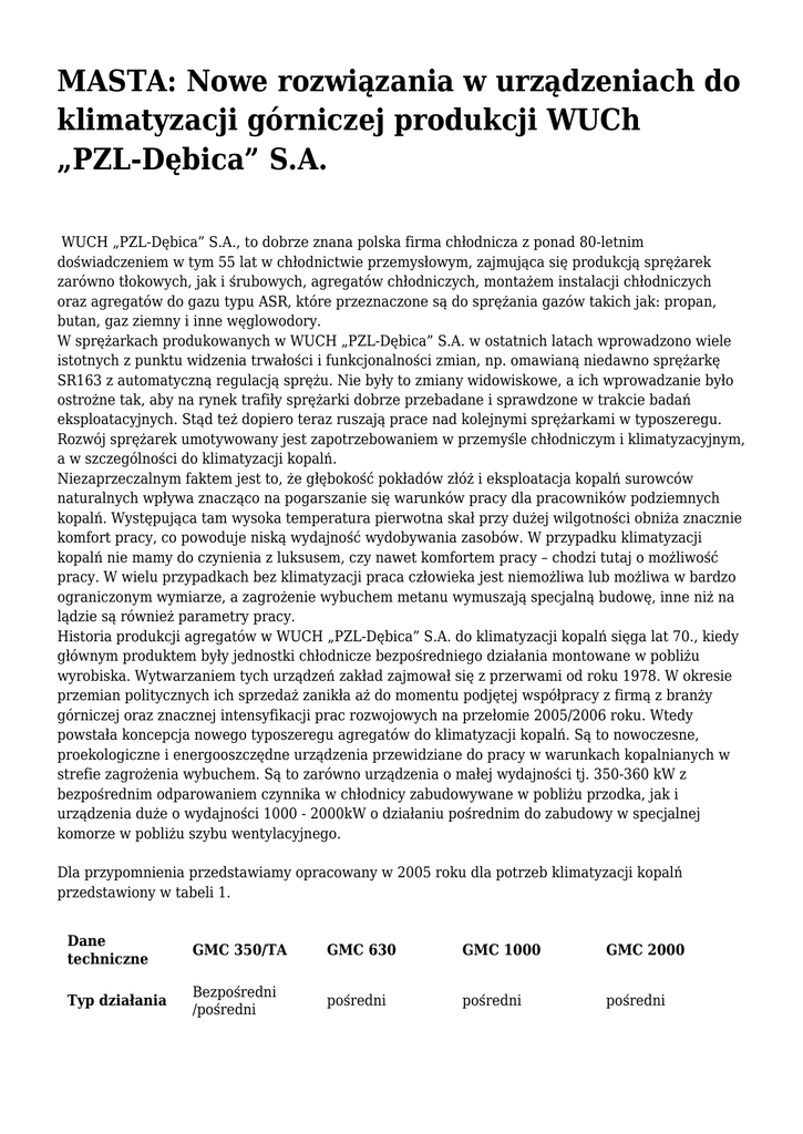 MASTA: Nowe rozwiązania w urządzeniach do klimatyzacji górniczej produkcji WUCh „PZL-Dębica” S.A. WUCH „PZL-Dębica” S.A., to dobrze znana polska firma chłodnicza z ponad 80-letnim doświadczeniem w tym 55 lat w chłodnictwie przemysłowym, zajmująca się produkcją sprężarek zarówno tłokowych, jak i śrubowych, agregatów chłodniczych, montażem instalacji chłodniczych oraz agregatów do gazu typu ASR, które przeznaczone są do sprężania gazów takich jak: propan, butan, gaz ziemny i inne węglowodory. W sprężarkach produkowanych w WUCH „PZL-Dębica” S.A. w ostatnich latach wprowadzono wiele istotnych z punktu widzenia trwałości i funkcjonalności zmian, np. omawianą niedawno sprężarkę SR163 z automatyczną regulacją sprężu. Nie były to zmiany widowiskowe, a ich wprowadzanie było ostrożne tak, aby na rynek trafiły sprężarki dobrze przebadane i sprawdzone w trakcie badań eksploatacyjnych. Stąd też dopiero teraz ruszają prace nad kolejnymi sprężarkami w typoszeregu. Rozwój sprężarek umotywowany jest zapotrzebowaniem w przemyśle chłodniczym i klimatyzacyjnym, a w szczególności do klimatyzacji kopalń. Niezaprzeczalnym faktem jest to, że głębokość pokładów złóż i eksploatacja kopalń surowców naturalnych wpływa znacząco na pogarszanie się warunków pracy dla pracowników podziemnych kopalń. Występująca tam wysoka temperatura pierwotna skał przy dużej wilgotności obniża znacznie komfort pracy, co powoduje niską wydajność wydobywania zasobów. W przypadku klimatyzacji kopalń nie mamy do czynienia z luksusem, czy nawet komfortem pracy – chodzi tutaj o możliwość pracy. W wielu przypadkach bez klimatyzacji praca człowieka jest niemożliwa lub możliwa w bardzo ograniczonym wymiarze, a zagrożenie wybuchem metanu wymuszają specjalną budowę, inne niż na lądzie są również parametry pracy. Historia produkcji agregatów w WUCH „PZL-Dębica” S.A. do klimatyzacji kopalń sięga lat 70., kiedy głównym produktem były jednostki chłodnicze bezpośredniego działania montowane w pobliżu wyrobiska. Wytwarzaniem tych urządzeń zakład zajmował się z przerwami od roku 1978. W okresie przemian politycznych ich sprzedaż zanikła aż do momentu podjętej współpracy z firmą z branży górniczej oraz znacznej intensyfikacji prac rozwojowych na przełomie 2005/2006 roku. Wtedy powstała koncepcja nowego typoszeregu agregatów do klimatyzacji kopalń. Są to nowoczesne, proekologiczne i energooszczędne urządzenia przewidziane do pracy w warunkach kopalnianych w strefie zagrożenia wybuchem. Są to zarówno urządzenia o małej wydajności tj. 350-360 kW z bezpośrednim odparowaniem czynnika w chłodnicy zabudowywane w pobliżu przodka, jak i urządzenia duże o wydajności 1000 - 2000kW o działaniu pośrednim do zabudowy w specjalnej komorze w pobliżu szybu wentylacyjnego. Dla przypomnienia przedstawiamy opracowany w 2005 roku dla potrzeb klimatyzacji kopalń przedstawiony w tabeli 1. Dane techniczne GMC 350/TA GMC 630 GMC 1000 GMC 2000 Typ działania Bezpośredni /pośredni pośredni pośredni pośredni Wydajność chłodnicza Qo= 395 kW Qo= 632 kW Qo= 1108 kW Qo= 2000 kW Czynnik chłodniczy R 407C R 134a R 134a R 134a Warunki pracy (otoczenia) +5÷+40°C +5÷+40°C +5÷+40°C +5÷+40°C Wymiary d/s/w 3400/900/1300 3600/1500/2600 4000/1500/2600 15403/1390/2960 17490/1765/2810 tłokowa śrubowa śrubowa śrubowa Moc Pn=110 kW Pn=200kW Pn=355kW Pn=630kW Obroty n=1450 obr/min n=2950 obr/min n=2950 obr/min n=2950 obr/min Napięcie zasilania Un=500/1000V Un=500/1000 V Un=6000 V Un=6000 V Un=6000 V Wydajność chłodnicza Qk= 487 kW Qo= 832 kW Qk= 1450 kW Qk= 2900 kW Przepływ wody 28 m3/h - obieg otwarty 41 m3/h - obieg zamknięty 72 m3/h 125 m3/h 250 m3/h Temp. wody wlot +20÷+26°C +28°C +28°C +28°C Temp. wody wylot +35÷+42°C +38°C +38°C +38°C Qk= 359 kW Qo= 632 kW Qk= 1108 kW Qk= 2000 kW Przepływ wody 42 m3/h 69 m3/h 127 m3/h Temp. wody wlot +16°C +16°C +16°C Temp. wody wylot +3°C +3°C +3°C SPRĘŻARKA Typ Silnik napęd. SKRAPLACZ PAROWNIK Wydajność chłodnicza Przepływ powietrza 8,3 m3/s - - - Temperatura powietrza wlotowego +31°C - - - Temperatura powietrza wylotowego +12oC - - - Uwzględniając rozwój nowoczesnych technologii, konstrukcji oraz zapotrzebowanie i wymagania klientów, po upływie kilku lat wprowadzono nowe rozwiązania. W tabeli 2 zestawiono dane techniczne zbudowanych ostatnio agregatów. Dane techniczne Typ działania RC360B bezpośredni RC360P GMC E-1000 GMC 1800 pośredni pośredni pośredni Wydajność chłodnicza Qo= 360 kW Qo= 300 kW Qo= 1000 kW Qo= 1800 kW Czynnik chłodniczy R 134a R 134a R 407C R 404A Warunki pracy (otoczenia) +5÷+40°C +5÷+40°C +5÷+40°C +5÷+40°C Wymiary d/s/w 3600/960/1295 3600/960/1295 4450/1285/2070 10915/1980/2655 śrubowa śrubowa śrubowa-semihermetyczna śrubowa Moc Pn=110 kW Pn=110kW Pn=400kW Pn=710kW Obroty n=2950 obr/min n=2950 obr/min n=2950 obr/min n=2950 obr/min Napięcie zasilania Un=500/1000V Un=6000 V Un=500/1000V Un=6000 V Un=500/1000 V Un=500/1000V Un=6000 V SPRĘŻARKA Typ Silnik napęd. SKRAPLACZ Wydajność chłodnicza Qk= 460 kW Qk=450 kW Qo= 1500 kW Qo= 2700 kW Przepływ wody 36 m3/h 36 m3/h 135 m3/h 150 m3/h Temp. wody wlot +34°C +34°C +34°C +28°C Temp. wody wylot +44°C +44°C +44°C +38°C Qk= 360 kW Qk= 300 kW Qo= 1050 kW Qo= 1800 kW Przepływ wody 20 m3/h 70 m3/h 75 m3/h Temp. wody wlot +16,5°C +18°C +18°C Temp. wody wylot +3°C +6°C +3°C PAROWNIK Wydajność chłodnicza Przepływ powietrza 11,2 m3/s - - - Temperatura powietrza wlotowego +32°C - - - Temperatura powietrza wylotowego +19oC - - - W niniejszej publikacji ograniczono się do omówienia agregatów bezpośredniego działania (RC360B), tzn. urządzenia do bezpośredniego ochładzania powietrza kopalnianego przepływającego przez te urządzenia i pośredniego do chłodzenia wody lodowej (GMC1800, GMC-E 1000 i RC360P). Budowa i działanie 