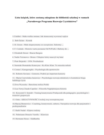 Lista książek, które zostaną zakupione do biblioteki szkolnej w ramach „Narodowego Programu Rozwoju Czytelnictwa” 1.Cialdini - Mała wielka zmiana. Jak skuteczniej wywierać wpływ 2. Bob Dylan – Kronik 3. H. Groen - Małe eksperymenty ze szczęściem. Sekretny ... 4. F. Czekała - Historie warte poznania Od PeWuKi i Baltony do ... 5. Elizabeth Strout - Bracia Burgess 6. Nadia Terranova - Bruno. Chłopiec który nauczył się latać 7. Piotr Bojarski - 1956. Przebudzeni 8. Surmiak-Domańska Katarzyna - Ku Klux Klan. Tu mieszka miłość 9. Costas I. Karageorghis - Psychologia dla sportowców 10. Roberto Saviano - Gomorra. Podróż po imperium kamorry 11. Maria Czerwińska-Jasiewicz - Psychologia rozwoju młodzieży w kontekście biegu ludzkiego życia 12.Ewa Wysocka - Barcelona stolica Polski 13.Luc Ferry,Claude Capelier - Filozofia Najpiękniejsza historia 14. Krzysztof J. Szmidt - Trening kreatywności Podręcznik dla pedagogów, psychologów i trenerów grupowych 15. Osho - KREATYWNOŚĆ Uwolnij swą wewnętrzną moc 16.Maciej Bennewicz - Coaching, kreatywność, zabawa. Narzędzia rozwoju dla pasjonatów i profesjonalistów 17. Rafel Nadal - Klątwa rodziny 18. Palmisano Drauzio Varella – Klawisze 19. Hermann Hesse - Siddhartha 20. Katarzyna Wolnik-Vera - Przystanek Barcelona Manana, fiesta i herbata po obiedzie, czyli Polka w Hiszpanii 21.Alain Mabanckou - Papryczka 22. Jayne Ann Krentz - Miedziana plaża 23. Ljubow Orłowa - Kochałam Stalina. Spowiedź gwiazdy sowieckiego kina 24. Bronisława Danuta Ciebiera - Pamiętnik z Sybiru 25. Karen Foxlee - Sukienka w kolorze nocnego nieba 26. Ron Fry - Jak się uczyć 27. Katarzyna Piętka - Gry i zabawy z dawnych lat 28. Tana French - Ściana sekretów. Wiem, kto go zabił 29. Marek Krajewski – MOCK 30. Nora Roberts - Obsesja Joanna Podsadecka, 31. ks. Jan Kaczkowski - Dasz radę. Ostatnia rozmowa 32. Olga Rudnicka - Granat poproszę 33. Leigh Bardugo - Szóstka wron 34.Joanne K. Rowling,John Tiffany 35. Jack Thorne - Harry Potter i przeklęte dziecko 36. Remigiusz Mróz - Behawiorysta 37. Magdalena Witkiewicz - Pracownia dobrych myśli 38. Peter Wohlleben - Sekretne życie drzew 39. Adam Forman - Sługi boże 40. Magda Stachula - Idealna 41. Aleksandra Chrobak - Beduinki na Instagramie. Moje życie w Emiratach 42. Remigiusz Mróz – Immunitet 43. Edyta Świętek - Miód na serce 44. Paul Kalanithi - Jeszcze jeden oddech 45. Nicholas Sparks - Spójrz na mnie 46. Remigiusz Piotrowski - Absurdy i kurioza przedwojennej Polski 47. Dominik Formanowicz - Mężczyzna w chwili gdy zostaje sam 48. Hans Fallada - Zmora Dorota Schrammek - Dom którego nie było 49. Frederic Lenoir - O SZCZĘŚCIU podróż filozoficzna 50. Osho - Spotkania z niezwykłymi ludźmi 51. Jerzy Bralczyk,Jan Miodek,Andrzej Markowski - Trzy po 33 52. PRACA ZBIOROWA - MÓJ PARYŻ. Słynni paryżanie opowiadają o swoim mieście 53. Bartosz Michalak - WAJDA Kronika wypadków filmowych 54. Jojo Moyes - Kiedy odzedłeś 55. Katarzyna Kubisiowska - Pilch w sensie ścisłym. Biografia 56. Andrzej Pilipiuk - Litr ciekłego ołowiu 57. Kinga Dębska - Moje córki krowy 58. Wojciszke - Psychologia miłości 59. Sylwia Mróz - Pejzaż bez kolców. Meksyk słońcem malowany 60. David Evanier - Woody Allen. Biografia 61. PRACA ZBIOROWA - Wołyń. Bez komentarza 62. Marek Hłasko - Najlepsze lata naszego życia 63.Maria Janion - Niesamowita słowiańszczyzna 64.Zemme Verena - Pułapki 65.Paweł Huelle - Ulica Świętego Ducha i inne historie 66.Izabela Sowa – Tymczasem 67. Eduardo Mendoza - Tajemnica zaginionej ślicznotki 68.Andrzej Klim - Tak się kręciło. Na planie 10 kultowych filmów PRL 69. Henning Mankell - Szwedzkie kalosze 70.Jacques Aumont,Michel Marie - Analiza filmu 71. Karolina Kubilus - Szczęście w kolorze burgunda 72.Klaus W. Vopel - Warsztaty skuteczna forma nauki 73.Antonina Kłoskowska - Kultura masowa. Krytyka i obrona 74.Simon Singh - Simpsonowie i ich matematyczne sekrety 75.Henryk Sienkiewicz - Listy z Afryk 76.i Klaus W. Vopel - Kompas uczuć 77. Joanna Bogusławska - Popkultura Pop czy kultura 78. Rafał Syska,Joanna Wojnicka - Historia filmu. Od Edisona do Nolana 79. Rafał Rosół - Potrawa osłów greckich czyli literatura nieco na opak 80.Jan Bober - Za drutami obozów sowieckich. Wspomnienia 81.Adam Cash,Dummies Press - Psychologia dla bystrzaków 82.Beata Lewandowska-Kaftan - Afryka jest kobietą 83. Piotr Żak - O chłopcu, który przestał się bać i inne niezwykłe eksperymenty svoir vivre`u 84. Helen Fielding - Dziennik Bridget Jones. Dziecko 85. Emma Donoghue - Pokój 86.Maria Barbasiewicz - W kuchni jak na wojnie 87.Agnieszka Kozdroń - Zespół Aspergera. Zrozumieć, aby pomóc 88.Sławomir Shuty - Dziewięćdziesiąte 89.Ziemowit Szczerek - Przyjdzie Mordor i nas zje, czyli tajna historia Słowian 90.Bill Bryson - Herbatka o piątej! 91. Anne-Marie O`Connor - Złota dama 92. Michael Haag - Inferno rozszyfrowane 93.Krystyna Kaplan - Londyn w czasach Sherlocka Holmesa 94. Bernd Ingmar Gutberlet - Jak było naprawdę? 50 nieporozumień na temat historii 95. Paul Heiney - Czy krowy mogą schodzić po schodach? 96.Lois Lowry, Syn 97. Eve Aihsworth, 7 dni 98. Ktoś mnie pokocha 99.Rainbow Rowell, Fangirl 100. Rainbow Rowell, Rozkaz zagłady 101. Rainbow Rowell, Ponad wszystko 102. Nicola Yoon, Ponad wszystko 103. Matthew Quick, Wszystko to co wyjątkowe 104. Emily Lockhart, Byliśmy łgarzami 105.Jennifer Niven, Wszystkie jasne miejsca 106. Becca Fitzpatrick, Black Ice 107. Cassandra Clare, Kroniki Bane’a 108.Cassandra Clare, Diabelskie maszyny (trylogia) 109.Cassandra Clare, Mroczne intrygi 110.Jennifer Lynn Barnes, Naznaczeni 111.Sandy Hall, Daj mi odpowiedź 112.C.J. Daugherty, Carina Rozenfeld, Tajemny ogień 113.Jojo Moyes, Razem będzie lepiej 114.Regina Brett, Bóg zawsze znajdzie ci pracę 115. Colleen Houck, Klątwa tygrysa. Przeznaczenie 116.Colleen Houck, Klątwa tygrysa. Wyprawa 117.James Frey, Klucz niebios 118.Joanna 