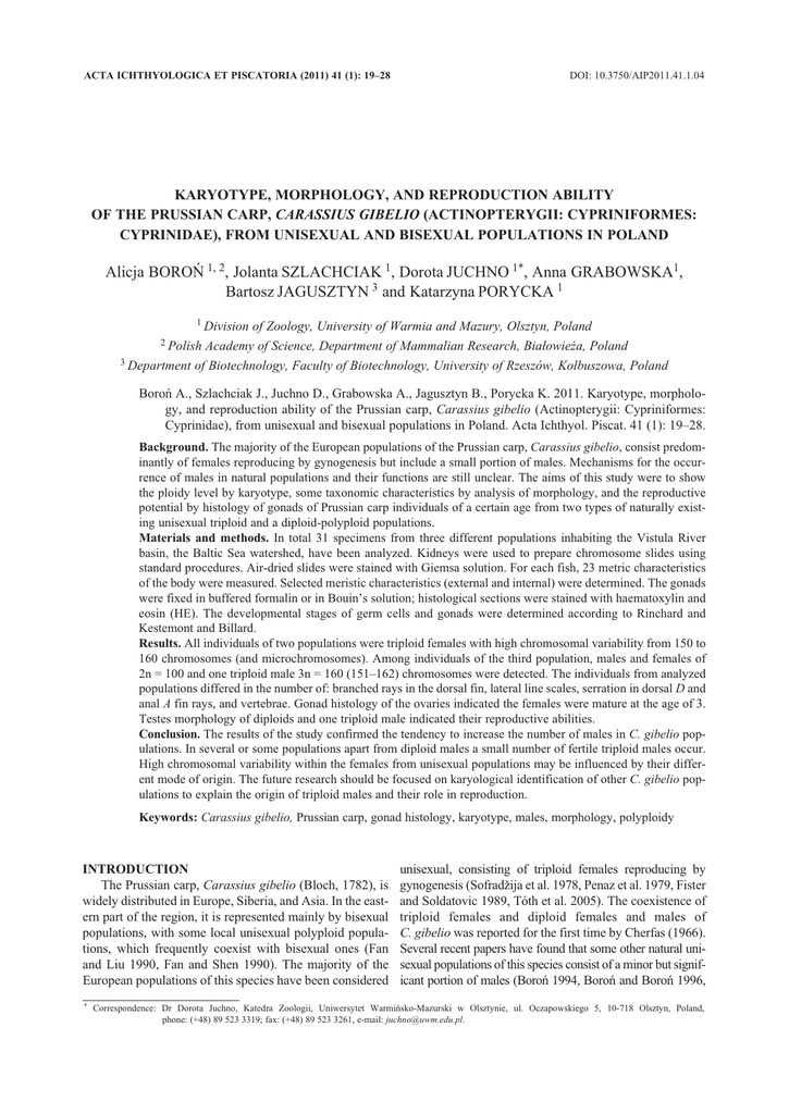 ACTA ICHTHYOLOGICA ET PISCATORIA (2011) 41 (1): 19–28 DOI: 10.3750/AIP2011.41.1.04 KARYOTYPE, MORPHOLOGY, AND REPRODUCTION ABILITY OF THE PRUSSIAN CARP, CARASSIUS GIBELIO (ACTINOPTERYGII: CYPRINIFORMES: CYPRINIDAE), FROM UNISEXUAL AND BISEXUAL POPULATIONS IN POLAND Alicja BOROŃ 1, 2, Jolanta SZLACHCIAK 1, Dorota JUCHNO 1*, Anna GRABOWSKA1, Bartosz JAGUSZTYN 3 and Katarzyna PORYCKA 1 1 Division of Zoology, University of Warmia and Mazury, Olsztyn, Poland Academy of Science, Department of Mammalian Research, Białowieża, Poland 3 Department of Biotechnology, Faculty of Biotechnology, University of Rzeszów, Kolbuszowa, Poland 2 Polish Boroń A., Szlachciak J., Juchno D., Grabowska A., Jagusztyn B., Porycka K. 2011. Karyotype, morphology, and reproduction ability of the Prussian carp, Carassius gibelio (Actinopterygii: Cypriniformes: Cyprinidae), from unisexual and bisexual populations in Poland. Acta Ichthyol. Piscat. 41 (1): 19–28. Background. The majority of the European populations of the Prussian carp, Carassius gibelio, consist predominantly of females reproducing by gynogenesis but include a small portion of males. Mechanisms for the occurrence of males in natural populations and their functions are still unclear. The aims of this study were to show the ploidy level by karyotype, some taxonomic characteristics by analysis of morphology, and the reproductive potential by histology of gonads of Prussian carp individuals of a certain age from two types of naturally existing unisexual triploid and a diploid-polyploid populations. Materials and methods. In total 31 specimens from three different populations inhabiting the Vistula River basin, the Baltic Sea watershed, have been analyzed. Kidneys were used to prepare chromosome slides using standard procedures. Air-dried slides were stained with Giemsa solution. For each fish, 23 metric characteristics of the body were measured. Selected meristic characteristics (external and internal) were determined. The gonads were fixed in buffered formalin or in Bouin’s solution; histological sections were stained with haematoxylin and eosin (HE). The developmental stages of germ cells and gonads were determined according to Rinchard and Kestemont and Billard. Results. All individuals of two populations were triploid females with high chromosomal variability from 150 to 160 chromosomes (and microchromosomes). Among individuals of the third population, males and females of 2n = 100 and one triploid male 3n = 160 (151–162) chromosomes were detected. The individuals from analyzed populations differed in the number of: branched rays in the dorsal fin, lateral line scales, serration in dorsal D and anal A fin rays, and vertebrae. Gonad histology of the ovaries indicated the females were mature at the age of 3. Testes morphology of diploids and one triploid male indicated their reproductive abilities. Conclusion. The results of the study confirmed the tendency to increase the number of males in C. gibelio populations. In several or some populations apart from diploid males a small number of fertile triploid males occur. High chromosomal variability within the females from unisexual populations may be influenced by their different mode of origin. The future research should be focused on karyological identification of other C. gibelio populations to explain the origin of triploid males and their role in reproduction. Keywords: Carassius gibelio, Prussian carp, gonad histology, karyotype, males, morphology, polyploidy INTRODUCTION The Prussian carp, Carassius gibelio (Bloch, 1782), is widely distributed in Europe, Siberia, and Asia. In the eastern part of the region, it is represented mainly by bisexual populations, with some local unisexual polyploid populations, which frequently coexist with bisexual ones (Fan and Liu 1990, Fan and Shen 1990). The majority of the European populations of this species have been considered * unisexual, consisting of triploid females reproducing by gynogenesis (Sofradžija et al. 1978, Penaz et al. 1979, Fister and Soldatovic 1989, Tóth et al. 2005). The coexistence of triploid females and diploid females and males of C. gibelio was reported for the first time by Cherfas (1966). Several recent papers have found that some other natural unisexual populations of this species consist of a minor but significant portion of males (Boroń 1994, Boroń and Boroń 1996, Correspondence: Dr Dorota Juchno, Katedra Zoologii, Uniwersytet Warmińsko-Mazurski w Olsztynie, ul. Oczapowskiego 5, 10-718 Olsztyn, Poland, phone: (+48) 89 523 3319; fax: (+48) 89 523 3261, e-mail: [email protected]. 20 Boroń et al. Zhou et al. 2000, Devlin and Nagahama 2002, Tóth et al. 2005). Mechanisms for the occurrence of a small and variable proportion of males in natural populations are still unclear. All the eggs of the triploid Prussian carp developed gynogenetically into females when stimulated by sperm from other species. A small proportion of eggs developed into males when ‘fertilized’ with sperm from the male of the same species (Shen et al. 1983). Heterologous sperm of other fish species apart from activating eggs into embryological development was able to contribute to the phenotype of the gynogenetic offspring of triploid females of C. gibelio (see Yi et al. 2003). This type of gynogenesis has been referred to as allogynogenesis. Diploid individuals of Prussian carp were reported to have varying numbers of chromosomes, ranging from 2n = 94 to 2n = 100, whereas in triploid representatives the chromosome number ranged from 3n = 141 to 3n = 160 (Cherfas 1966, Penaz et al. 1979, Fister and Soldatovic 1989, Fan and Shen 1990, Boroń 1994, Tóth et al. 2005). The Prussian carp was introduced to Europe and to Poland from China and the Amur River (Sakai et al. 2009) at the beginning of the 20th century and now is widely distributed across lakes and rivers. Apart from two reports of an incidental occurrence of males within female populations (Skó