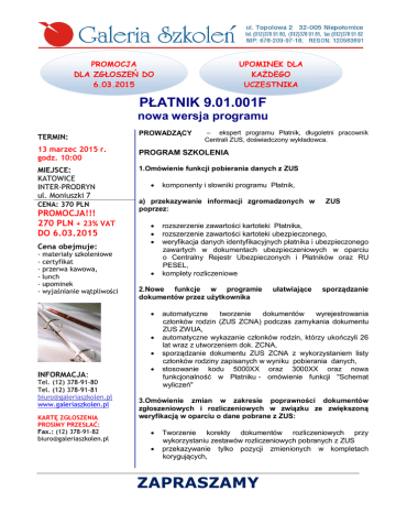 PROMOCJA DLA ZGŁOSZEŃ DO 6.03.2015 UPOMINEK DLA KAŻDEGO UCZESTNIKA PŁATNIK 9.01.001F nowa wersja programu TERMIN: 13 marzec 2015 r. godz. 10:00 MIEJSCE: KATOWICE INTER-PRODRYN ul. Moniuszki 7 CENA: 370 PLN PROMOCJA!!! 270 PLN + 23% VAT DO 6.03.2015 Cena obejmuje: - materiały szkoleniowe - certyfikat - przerwa kawowa, - lunch - upominek - wyjaśnianie wątpliwości PROWADZĄCY PROGRAM SZKOLENIA 1.Omówienie funkcji pobierania danych z ZUS KARTĘ ZGŁOSZENIA PROSIMY PRZESŁAĆ: Fax.: (12) 378-91-82 [email protected] ZUS rozszerzenie zawartości kartoteki Płatnika, rozszerzenie zawartości kartoteki ubezpieczonego, weryfikacja danych identyfikacyjnych płatnika i ubezpieczonego zawartych w dokumentach ubezpieczeniowych w oparciu o Centralny Rejestr Ubezpieczonych i Płatników oraz RU PESEL, komplety rozliczeniowe 2.Nowe funkcje w programie dokumentów przez użytkownika Tel. (12) 378-91-80 Tel. (12) 378-91-81 [email protected] www.galeriaszkolen.pl komponenty i słowniki programu Płatnik, a) przekazywanie informacji zgromadzonych w poprzez: INFORMACJA: – ekspert programu Płatnik, długoletni pracownik Centrali ZUS, doświadczony wykładowca. ułatwiające sporządzanie automatyczne tworzenie dokumentów wyrejestrowania członków rodzin (ZUS ZCNA) podczas zamykania dokumentu ZUS ZWUA, automatyczne wykazanie członków rodzin, którzy ukończyli 26 lat wraz z utworzeniem dok. ZCNA, sporządzanie dokumentu ZUS ZCNA z wykorzystaniem listy członków rodziny zapisanych w wyniku pobierania danych, stosowanie kodu 5000XX oraz 3000XX oraz nowa funkcjonalność w Płatniku - omówienie funkcji "Schemat wyliczeń" 3.Omówienie zmian w zakresie poprawności dokumentów zgłoszeniowych i rozliczeniowych w związku ze zwiększoną weryfikacją w oparciu o dane pobrane z ZUS: Tworzenie korekty dokumentów rozliczeniowych przy wykorzystaniu zestawów rozliczeniowych pobranych z ZUS przekazywanie tylko pozycji zmienionych w kompletach korygujących, ZAPRASZAMY wymuszenie korekty raportów ZUS RCA w przypadku zmiany stopy procentowej na ubezpieczenie wypadkowe w ZUS DRA, dodanie nowej funkcjonalności wspierającej użytkowników podczas sporządzania dokumentów ZUS RCA/ZUS RZA, składanych za ubezpieczonych nie wcześniej niż za następny m-c po ustaniu tytułu do ubezpieczeń. sporządzanie dokumentów rozliczeniowych uwzględniających zgłoszenia do ubezpieczeń oraz poprawności składania raportów z danym kodem tytułu ubezpieczenia, poprawność wykazywanych podstaw wymiaru składek w dokumentach rozliczeniowych, w szczególności - kodów, dla których w obowiązujących przepisach została określona dolna lub górna wysokość, poprawne wyliczania kwot składek na poszczególne ubezpieczenia w oparciu o wskaźniki ZUS poprawność składanych wyrejestrowań z ubezpieczeń w oparciu o zgłoszone wcześniej kody tytułu do ubezpieczenia, weryfikacja danych identyfikacyjnych płatnika i ubezpieczonego zawartych w dokumentach ubezpieczeniowych w oparciu o CRU i CRP oraz RU pesel, 4.Tworzenie korekty dokumentów rozliczeniowych wykorzystaniu zestawów rozliczeniowych pobranych z ZUS przy przekazywanie tylko pozycji zmienionych w kompletach korygujących, wymuszenie korekty raportów ZUS RCA w przypadku zmiany stopy procentowej na ZUS DRA. 5. Kontrolowanie stanu przetworzenia wysłanych dokumentów do ZUS poprzez: aktualizację stanu przetworzenia lub odrzucenia dokumentów przez ZUS, zmiana algorytmu oznaczania statusów przetworzenia dokumentów w ZUS oraz poprawa algorytmu generowania raportu z wysyłki i potwierdzenia 6.Omówienie zmian w zakresie ubezpieczeniowych do ZUS: wysyłania dokumentów blokowanie wysyłki zestawu dokumentów w przypadku braku potwierdzenia danych płatnika i ubezpieczonych w ZUS, 7.Możliwość oznaczania kolejności przetwarzania dokumentów w zestawie: ZUS ZUA, ZUS ZZA, ZUS ZWUA, w przypadku wysyłki do ZUSu wielu dokumentów dla jednej osoby ubezpieczonej, ZAPRASZAMY 8.Tworzenie informacji ubezpieczonego/ubezpieczonych pobranych z ZUS: miesięcznej/rocznej na podstawie dla danych poprawiono algorytm generowania Informacji Rocznej i Informacji Miesięcznej w przypadku braku wypełnionego pola "Nazwa skrócona". 9. Druk KOA - jako przydatne narzędzie w korygowaniu dokumentów ZUS 10.Platforma Usług Elektronicznych - praktyczne narzędzie pomocne w korygowaniu dokumentów ZUS 11.Swobodna wymiana doświadczeń oraz konsultacje Powyższy temat możemy również zrealizować w formie szkolenia zamkniętego ZAPRASZAMY
