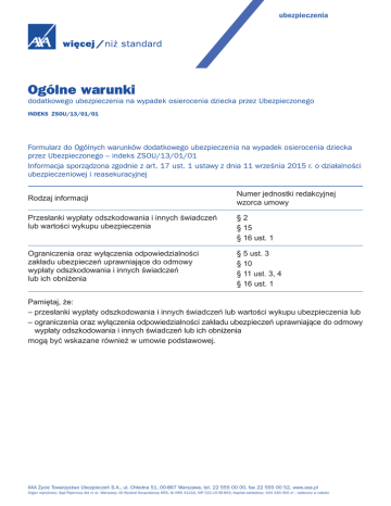 ubezpieczenia Ogólne warunki dodatkowego ubezpieczenia na wypadek osierocenia dziecka przez Ubezpieczonego INDEKS ZSOU/13/01/01 Formularz do Ogólnych warunków dodatkowego ubezpieczenia na wypadek osierocenia dziecka przez Ubezpieczonego – indeks ZSOU/13/01/01 Informacja sporządzona zgodnie z art. 17 ust. 1 ustawy z dnia 11 września 2015 r. o działalności ubezpieczeniowej i reasekuracyjnej Rodzaj informacji Numer jednostki redakcyjnej wzorca umowy Przesłanki wypłaty odszkodowania i innych świadczeń lub wartości wykupu ubezpieczenia §2 § 15 § 16 ust. 1 Ograniczenia oraz wyłączenia odpowiedzialności zakładu ubezpieczeń uprawniające do odmowy wypłaty odszkodowania i innych świadczeń lub ich obniżenia § 5 ust. 3 § 10 § 11 ust. 3, 4 § 16 ust. 1 Pamiętaj, że: – przesłanki wypłaty odszkodowania i innych świadczeń lub wartości wykupu ubezpieczenia lub – ograniczenia oraz wyłączenia odpowiedzialności zakładu ubezpieczeń uprawniające do odmowy wypłaty odszkodowania i innych świadczeń lub ich obniżenia mogą być wskazane również w umowie podstawowej. AXA Życie Towarzystwo Ubezpieczeń S.A., ul. Chłodna 51, 00-867 Warszawa, tel. 22 555 00 00, fax 22 555 00 52, www.axa.pl Organ rejestrowy: Sąd Rejonowy dla m.st. Warszawy, XII Wydział Gospodarczy KRS, Nr KRS 41216, NIP 521-10-36-859, Kapitał zakładowy: 444 440 000 zł – wpłacony w całości Ogólne warunki dodatkowego ubezpieczenia na wypadek osierocenia dziecka przez Ubezpieczonego INDEKS ZSOU/13/01/01 I. TWOJE UBEZPIECZENIE Ogólne warunki dodatkowego ubezpieczenia na wypadek osierocenia dziecka przez Ubezpieczonego (OWUD) Co to dla Ciebie oznacza? Kto może zostać ubezpieczony w ramach umowy dodatkowej? Ubezpieczenie przeznaczone jest dla osób pomiędzy 18. a 61. rokiem życia. Pamiętaj, że Twój wiek w ramach umowy dodatkowej jest równy wiekowi ustalonemu na zasadach określonych w umowie podstawowej. W związku z tym, jest on liczony na dzień podpisania wniosku o zawarcie umowy podstawowej jako liczba ukończonych przez Ciebie pełnych lat życia. W każdą rocznicę polisy wartość ta zwiększana jest o jeden. §1 1. Ubezpieczonym w rozumieniu niniejszych OWUD może być wyłącznie Ubezpieczony w rozumieniu OWU, który w dniu podpisania wniosku o zawarcie umowy dodatkowej spełnia łącznie następujące warunki: 1) ma ukończony 18. rok życia; 2) nie ukończył 61. roku życia. 2. Na potrzeby OWUD wiek Ubezpieczonego jest równy wiekowi ustalonemu na zasadach określonych w OWU. Przykład: Wniosek o zawarcie umowy podstawowej został podpisany 10 marca 2010 r. Jako Ubezpieczony została w nim wskazana osoba urodzona 26 marca 1980 r. Osoba ta miała na dzień podpisania wniosku 29 lat. Umowa ubezpieczenia została zawarta 1 kwietnia 2010 r. Pomimo faktu, że zgodnie z kalendarzem osoba wskazana w przykładzie kończy 30 lat w marcu, dla celów umowy podstawowej i umowy dodatkowej (nawet w przypadku gdy umowa dodatkowa została zawarta w terminie późniejszym) skończy ona 30 lat dopiero w pierwszą rocznicę polisy, tj. 1 kwietnia 2011 r., 31 lat – 1 kwietnia 2012 r. etc. Co AXA ubezpiecza i za co odpowiada? Ubezpieczenie ma na celu wesprzeć Twoje Dziecko w przypadku Twojej śmierci wskutek nieszczęśliwego wypadku, jeżeli nastąpiła ona w ciągu 6 miesięcy od zajścia tego wypadku. §2 1. Przedmiotem ubezpieczenia jest życie Ubezpieczonego. 2. Zakres ubezpieczenia obejmuje osierocenie Dziecka przez Ubezpieczonego w okresie odpowiedzialności AXA z tytułu umowy dodatkowej. W jaki sposób zawierana jest umowa dodatkowa? Umowę dodatkową możesz kupić razem z umową podstawową lub – począwszy od pierwszej rocznicy polisy – w terminach wymagalności składki regularnej. Możesz być poproszony o przedstawienie dokumentacji medycznej lub zostać skierowany na badania medyczne. Koszt badań pokryje AXA. 2 §3 1. Umowa dodatkowa może być zawarta wyłącznie jako rozszerzenie zakresu umowy podstawowej: – jednocześnie z umową podstawową, lub – p ocząwszy od pierwszej rocznicy polisy – w terminach wymagalności składki regularnej. 2. Umowa dodatkowa zawierana jest w tym samym trybie co umowa podstawowa, na zasadach określonych w umowie podstawowej, z zastrzeżeniem postanowień ust. 3–6. 3. Przed zawarciem umowy dodatkowej AXA może zażądać, aby Ubezpieczony: – poddał się badaniu medycznemu, z wyłączeniem badań genetycznych, lub – przedstawił dokumentację medyczną stwierdzającą stan jego zdrowia. O powyższym wymogu AXA zawiadomi Właściciela polisy w terminie 30 dni od dnia przedstawienia przez niego oświadczenia o stanie zdrowia Ubezpieczonego. 4. Badanie medyczne przeprowadzane jest przez wskazanego przez AXA lekarza lub zakład opieki zdrowotnej. Koszt badań medycznych ponosi AXA. 5. Badanie medyczne jest wykonywane wyłącznie w celu oceny ryzyka ubezpieczeniowego. Ogólne warunki dodatkowego ubezpieczenia na wypadek osierocenia dziecka przez Ubezpieczonego (OWUD) Co to dla Ciebie oznacza? Jeżeli wyniki badań będą odbiegały od normy, zaproponujemy Ci inne warunki umowy dodatkowej, a w skrajnych przypadkach będziemy zmuszeni do odmówienia zawarcia umowy. 6. Po dokonaniu analizy ryzyka ubezpieczeniowego, przeprowadzonej na podstawie danych zawartych we wniosku ubezpieczeniowym, dokumentacji medycznej, badań medycznych oraz innych elementów ryzyka, AXA może podjąć decyzję: 1) o zawarciu umowy dodatkowej na warunkach zawartych we wniosku ubezpieczeniowym i OWUD, albo 2) o odmowie zawarcia umowy dodatkowej, albo 3) może zaproponować Właścicielowi polisy zawarcie umowy dodatkowej na warunkach odmiennych od zawartych we wniosku ubezpieczeniowym lub w OWUD. Na jaki czas zawierana jest umowa dodatkowa? Umowa dodatkowa zawierana jest na czas określony – minimum 5 lat. Jeżeli umowa dodatkowa zostanie zawarta pomiędzy rocznicami polisy, minimalny okres ubezpieczenia zostaje wydłużony o liczbę pełnych miesięcy p