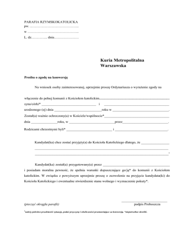 PARAFIA RZYMSKOKATOLICKA pw. .………………………………….. w …………………………………….. L. dz………….. dnia………………… Kuria Metropolitalna Warszawska Prośba o zgodę na konwersję Na wniosek osoby zainteresowanej, uprzejmie proszę Ordynariusza o wyrażenie zgody na włączenie do pełnej komunii z Kościołem katolickim…………………………………………………… syna/córki* _______________________________ i _____________________________________ urodzonego (ej) dnia ___________________________roku w ________________________________. Został(a) ważnie ochrzczony(a) w Kościele/wspólnocie*_____________________________________ dnia _______________roku, w __________________________przez__________________________. Rodzicami chrzestnymi byli* __________________________ i ______________________________. Kandydat(ka) chce zostać przyjęty(a) do Kościoła Katolickiego dlatego, że ________________ ____________________________________________________________________________ ____________________________________________________________________________¹ Kandydat(ka) został(a) przygotowany(a) przez ______________________________________ i posiadam moralna pewność, że spełnia warunki dopuszczające go/ją* do komunii z Kościołem katolickim. W związku z powyższym uprzejmie proszę o zezwolenie na przyjęcie kandydata(ki) do Kościoła Katolickiego i ewentualne stwierdzenie stanu wolnego i wyznaczenie pokuty*. (pieczęć okrągła parafii) __________________________ podpis Proboszcza ¹należy pokrótce przedstawić sytuację, podać przyczynę i okoliczności przemawiające za konwersją. *niepotrzebne skreślić. Załączniki: - Metryka chrztu lub akty znania o chrzcie świętym 2 świadków i ewentualnie konwertyty (jeśli nie jest możliwe uzyskać metryką Chrztu),ewentualnie inne dokumenty stwierdzające przyjęcie sakramentów (Komunia św., Bierzmowanie) 1. Przy osobie pełnoletniej: - dokumenty związane ze stanem cywilny, dot. związków w jakich była (jest) osoba – akt związku cywilnego, małżeństwa, dok. rozwodowa, etc… - akt znania osoby o swoim stanie wolnym, której dotyczy konwersja. - akty znania o stanie wolnym dwóch wiarygodnych świadków znających kandydata(tkę) na konwertytę, co najmniej od pełnoletności. - prośba kandydata o przyjęcie do Kościoła katolickiego, wyrażające wolę, podające motywy i pokrótce opisujące historię i okoliczności konwersji. W przypadku osób, które popadły w kary kanoniczne, przedstawienie okoliczności apostazji, schizmy (wiek, stopień świadomości) oraz wyrażenie gotowości do przyjęcia nałożonej na nich pokuty. 2. Przy osobie nieletniej: - do 7 roku życia umotywowana prośba pisemna co najmniej jednego rodzica wyznania rzymskokatolickiego. - Między 7 a 14 rokiem życia prośba samego kandydata pisemna, bądź ustna (wyrażona pozytywną wolą wobec księdza) i z prośbą co najmniej jednego rodzica. - od 14 roku życia umotywowana prośba pisemna kandydata, z aprobatą co najmniej jednego rodzica. Uwaga! Przy dzieciach z domu dziecka należy upewnić się, co do woli opiekuna prawnego, z uwzględnieniem zdania rodziców biologicznych.
