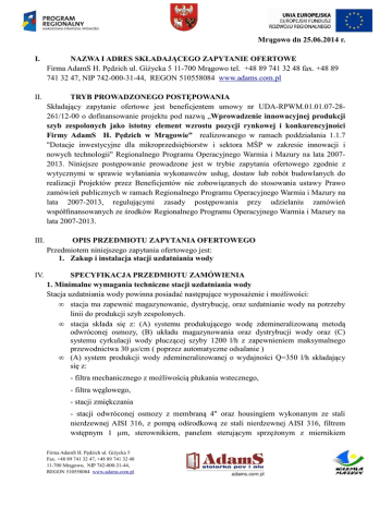 Mrągowo dn 25.06.2014 r. I. NAZWA I ADRES SKŁADAJĄCEGO ZAPYTANIE OFERTOWE Firma AdamS H. Pędzich ul. Giżycka 5 11-700 Mrągowo tel. +48 89 741 32 48 fax. +48 89 741 32 47, NIP 742-000-31-44, REGON 510558084 www.adams.com.pl II. TRYB PROWADZONEGO POSTĘPOWANIA Składający zapytanie ofertowe jest beneficjentem umowy nr UDA-RPWM.01.01.07-28261/12-00 o dofinansowanie projektu pod nazwą „Wprowadzenie innowacyjnej produkcji szyb zespolonych jako istotny element wzrostu pozycji rynkowej i konkurencyjności Firmy AdamS H. Pędzich w Mrągowie” realizowanego w ramach poddziałania 1.1.7 "Dotacje inwestycyjne dla mikroprzedsiębiorstw i sektora MŚP w zakresie innowacji i nowych technologii" Regionalnego Programu Operacyjnego Warmia i Mazury na lata 20072013. Niniejsze postępowanie prowadzone jest w trybie zapytania ofertowego zgodnie z wytycznymi w sprawie wyłaniania wykonawców usług, dostaw lub robót budowlanych do realizacji Projektów przez Beneficjentów nie zobowiązanych do stosowania ustawy Prawo zamówień publicznych w ramach Regionalnego Programu Operacyjnego Warmia i Mazury na lata 2007-2013, regulującymi zasady postępowania przy udzielaniu zamówień współfinansowanych ze środków Regionalnego Programu Operacyjnego Warmia i Mazury na lata 2007-2013. III. OPIS PRZEDMIOTU ZAPYTANIA OFERTOWEGO Przedmiotem niniejszego zapytania ofertowego jest: 1. Zakup i instalacja stacji uzdatniania wody IV. SPECYFIKACJA PRZEDMIOTU ZAMÓWIENIA 1. Minimalne wymagania techniczne stacji uzdatniania wody Stacja uzdatniania wody powinna posiadać następujące wyposażenie i możliwości: • stacja ma zapewnić magazynowanie, dystrybucję, oraz uzdatnianie wody na potrzeby linii do produkcji szyb zespolonych. • stacja składa się z: (A) systemu produkującego wodę zdemineralizowaną metodą odwróconej osmozy, (B) układu magazynowania oraz dystrybucji wody oraz (C) systemu cyrkulacji wody płuczącej szyby 1200 l/h z zapewnieniem maksymalnego przewodnictwa 30 µs/cm ( poprzez automatyczne odsalanie ) • (A) system produkcji wody zdemineralizowanej o wydajności Q=350 l/h składający się z: - filtra mechanicznego z możliwością płukania wstecznego, - filtra węglowego, - stacji zmiękczania - stacji odwróconej osmozy z membraną 4" oraz housingiem wykonanym ze stali nierdzewnej AISI 316, z pompą odśrodkową ze stali nierdzewnej AISI 316, filtrem wstępnym 1 µm, sterownikiem, panelem sterującym sprzężonym z miernikiem Firma AdamS H. Pędzich ul. Giżycka 5 Fax. +48 89 741 32 47, +48 89 741 32 48 11-700 Mrągowo, NIP 742-000-31-44, REGON 510558084 www.adams.com.pl przewodności i automatycznym monitoringiem jakości wody, przepływomierzem i zaworem płukania jakościowego. • (B) system cyrkulacji wody płuczącej szyby o przepływie Q=1200 l/h składający się z: - automatycznego wielowarstwowego filtru piaskowego do usuwania zawiesiny w obiegu zamkniętym. Filtr powinien mieć możliwość automatycznego płukania strumieniem sprężonego powietrza i wodą demineralizowaną w przeciwprądzie oraz zaprogramowaną częstotliwość płukania. Polipropylenowy zbiornik filtracyjny z otwartą komorą przelewową połączoną z odpływem do ścieku. Filtr wyposażony w zawór jednokierunkowy, zawory płukania wstecznego, zegar elektroniczny sterujący czasem płukania - automatyczny filtr z węglem aktywnym do pochłaniania tłuszczu i oleju z wody obiegowej pochodzącej z tafli szklanej. Filtr wyposażony w elektroniczny zegar do przeprowadzenia koniecznej liczby płukań. Wypełnienie filtra składa się ze żwiru oraz min. 50 litrów węgla aktywnego. Zbiornik filtracyjny stalowy obustronnie pokryty polietylenem z wbudowanym systemem rozprowadzającym wodę, z zaworem pięciocyklowym. System cyrkulacji wyposażony w przepływomierz, zawory zamykające, zawór magnetyczny. - w układ cyrkulacji wbudowany automatyczny system odsalania wody. - pompy podnoszącej ciśnienie robocze o mocy 0,75 kW o wydajności 1200 l/h i ciśnieniu roboczym 3,5 bara, pompującą wodę z filtra pisakowego przez filtr z węglem aktywnym do zbiornika 3000 litrów gromadzącego wodę zdemineralizowaną. • • (C) układ magazynowania i dystrybucji wody składającego się z czarnego zbiornika magazynowego z PE o pojemności min. V=3000 l, pompy dystrybucyjnej wraz ze sterownikiem, o wydajności 3m3/h o mocy 1,4 kW. system automatyki sterującej stacją sprzężony z układem automatycznego odsalania wody cyrkulacyjnej dla zapewnienia przewodności wody płuczącej max. 30 µs/cm V. TERMIN REALIZACJI Termin realizacji przedmiotu niniejszego zapytania ofertowego – do dnia 15.12.2014 r VI. OPIS WARUNKÓW UDZIAŁU W POSTĘPOWANIU O udzielenie zamówienia mogą ubiegać się oferenci, którzy spełniają następujące warunki: • są uprawnieni do wykonywania określonej działalności, • posiadają niezbędną wiedzę i doświadczenie w zakresie planowanej inwestycji • dysponuje potencjałem technicznym i osobami zdolnymi do wykonania zamówienia • znajdują się w sytuacji ekonomicznej i finansowej gwarantującej prawidłowe i terminowe wykonanie zamówienia. • deklaruje przygotowanie i przekazanie niezbędnych dokumentów do rozliczenia inwestycji. Firma AdamS H. Pędzich ul. Giżycka 5 Fax. +48 89 741 32 47, +48 89 741 32 48 11-700 Mrągowo, NIP 742-000-31-44, REGON 510558084 www.adams.com.pl • • • • Zamawiający odrzuci ofertę w przypadku gdy: jej treść nie odpowiada treści warunków zapytania, a w szczególności nie spełnia wszystkich wymogów przedmiotu zamówienia, jej złożenie stanowi czyn nieuczciwej konkurencji w rozumieniu przepisów o zwalczaniu nieuczciwej konkurencji, zawiera rażąco niską cenę w stosunku do przedmiotu zamówienia, zawiera błędy w obliczeniu ceny. VII. OPIS SPOSOBU OBLICZENIA CENY • Oferent poda cenę netto maszyny z instalacją w sposób wskazany w formularzu ofertowym stanowiącym załącznik nr 1 do niniejszego zapytania ofertoweg