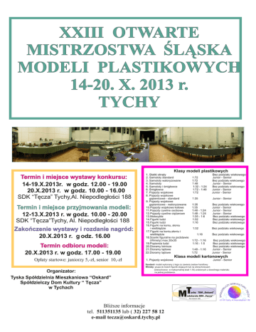 XXIII OTWARTE MISTRZOSTWA ŚLĄSKA MODELI PLASTIKOWYCH 14-20. X. 2013 r. TYCHY Klasy modeli plastikowych Termin odbioru modeli: 20.X.2013 r. w godz. 17.00 - 19.00 Opłaty startowe: juniorzy 5,-zł, senior 10,-zł 1:35 Junior - Senior 1:35 1:35 1:48 - 1:24 1:48 - 1:24 1:35 - 1:6 1:32 1:16 Bez podziału wiekowego Junior - Senior Junior - Senior Junior - Senior Bez podziału wiekowego Bez podziału wiekowego Bez podziału wiekowego 1:32 Bez podziału wiekowego 1:16 Bez podziału wiekowego 1:72 - 1:16 1:16 - 1:5 Bez podziału wiekowego Bez podziału wiekowego Bez podziału wiekowego Junior - Senior Junior - Senior 1:48 - 1:16 1:72 Klasa modeli kartonowych 1. Pojazdy wojskowe Junior - Senior Sandard- model wykonany z tego co zawiera zestaw handlowy Winiety- grupa do trzech figurek stojących lub na wierzchowcach (wierzchowce w maksymalnej skali 1:16) zrobionych z dowolnego materiału na jednej podstawce. odelarnia SDK „Tecza” CZA” ychy TSM „Oskard” „TĘ MT DOM KULT UR ZY LC Y Organizator: Tyska Spółdzielnia Mieszkaniowa “Oskard” Spółdzielczy Dom Kultury “ Tęcza” w Tychach Bez podziału wiekowego Junior - Senior Bez podziału wiekowego Junior - Senior Bez podziału wiekowego Junior - Senior Junior - Senior ZI E Termin i miejsce przyjmowania modeli: 12-13.X.2013 r. w godz. 10.00 - 20.00 SDK “Tęcza”Tychy, Al. Niepodległości 188 Zakończenie wystawy i rozdanie nagród: 20.X.2013 r. g odz. 16.00 1:72 1:72 1:48 1:32 - 1:24 1:72 - 1:48 1:72 SPÓŁD Termin i miejsce wystawy konkursu: 14-19.X.2013r. w godz. 12.00 - 19.00 20.X.2013 r. w godz. 10.00 - 16.00 SDK “Tęcza” Tychy,Al. Niepodległości 188 1. Statki okręty 2. Samoloty standard 3. Samoloty waloryzowane 4. Samoloty 5. Samoloty i śmigłowce 6. Śmigłowce 7. Pojazdy wojskowe 8. Pojazdy wojskowe gąsienicowe - standard 9. Pojazdy wojskowe gąsienicowe - waloryzowane 10.Pojazdy wojskowe kołowe 11.Pojazdy cywilne osobowe 12.Pojazdy cywilne ciężarowe 13.Motocykle 14.Figurki ludzi 15.Figurki ludzi 16.Figurki na koniu, słoniu i wielbłądzie 17.Figurki na koniu,słoniu i wielbłądzie 18.Scenki figuralne na podstawie (Winiety) max.30x35 19.Popiersia ludzi 20.Dioramy lotnicze 21.Dioramy lądowe 22.Dioramy lądowe Rok założenia 1968 43-100 Tychy, Al.Niepodległości 188 Bliższe informacje tel. 511351135 lub ( 32) 227 58 12 e-mail [email protected]