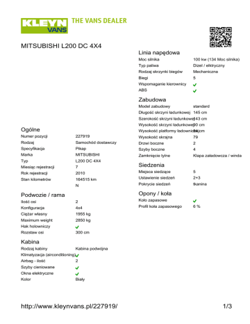 MITSUBISHI L200 DC 4X4 Linia napędowa Moc silnika 100 kw (134 Moc silnika) Typ paliwa Dizel / elktryczny Rodzaj skrzynki biegów Mechaniczna Biegi 5 Wspomaganie kierownicy ABS Zabudowa Model zabudowy standard Długość skrzyni ładunkowej 145 cm Szerokość skrzyni ładunkowej143 cm Wysokość skrzyni ładunkowej90 cm Ogólne Wysokość platformy ładowniczej 84 cm Numer pozycji 227919 Wysokość skrajna 79 Rodzaj Samochód dostawczy Drzwi boczne 2 Specyfikacja Pikap Szyby boczne 4 Marka MITSUBISHI Zamknięcie tylne Klapa załadowcza / winda Typ L200 DC 4X4 Miesiąc rejestracji 7 Siedzenia Rok rejestracji 2010 Miejsca siedzące 5 Stan kilometrów 164515 km Ustawienie siedzeń 2+3 N Pokrycie siedzeń tkanina Opony / koła Podwozie / rama Ilość osi 2 Koło zapasowe Konfiguracja 4x4 Profil koła zapasowego Ciężar własny 1955 kg Maximum weight 2850 kg 6% Hak holowniczy Rozstaw osi 300 cm Kabina Rodzaj kabiny Kabina podwójna Klimatyzacja (airconditioning) Airbag - ilość 2 Szyby cieniowane Okna elektryczne Kolor Biały http://www.kleynvans.pl/227919/ 1/3 MITSUBISHI L200 DC 4X4 Ilość osi mm mm Hamulce tarczowe Rodzaj osi skrętnej Mechaniczne Wymiar opony 205/80R16,0 Oś skrętna Raport inspekcji Kody wyświetlacza Elektryczny Kolumna kierownicу mm mm Typ zawieszenia Zawieszenie resorowe Wymiar opony 205/80R16,0 Resory Idealny/nowy Rama Bardzo dobry Hamulce Rozsądny Stan Silnik - całość Akceptowalny Układ chłodzenia Nie spełnia wymagań Układ paliwowy Układ wydechowy Układ smarowania Skrzynka biegów Sprzęgło Napęd Opony http://www.kleynvans.pl/227919/ 2/3 MITSUBISHI L200 DC 4X4 http://www.kleynvans.pl/227919/ 3/3