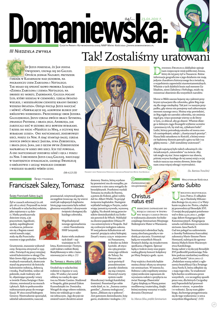 04/2011 23.01.2011 r. Gazeta Parafii Rzymskokatolickiej NMP Matki Kościoła //www.domaniewska.pl III Niedziela zwykła dy Jezus posłyszał, że Jan został uwięziony, usunął się do Galilei. Opuścił jednak Nazaret, przyszedł i osiadł w Kafarnaum nad jeziorem, na pograniczu ziem Zabulona i Neftalego. Tak miało się spełnić słowo proroka Izajasza: «Ziemia Zabulona i ziemia Neftalego, na drodze ku morzu, Zajordanie, Galilea pogan! Lud, który siedział w ciemności, ujrzał światło wielkie, i mieszkańcom cienistej krainy śmierci wzeszło światło». Odtąd począł Jezus nauczać i mówić: «Nawracajcie się, albowiem bliskie jest królestwo niebieskie». Przechodząc obok Jeziora Galilejskiego, Jezus ujrzał dwóch braci: Szymona, zwanego Piotrem, i brata jego, Andrzeja, jak zarzucali sieć w jezioro; byli bowiem rybakami. I rzekł do nich: «Pójdźcie za Mną, a uczynię was rybakami ludzi». Oni natychmiast, zostawiwszy sieci, poszli za Nim. A idąc stamtąd dalej, ujrzał innych dwóch braci: Jakuba, syna Zebedeusza, i brata jego, Jana, jak z ojcem swym Zebedeuszem naprawiali w łodzi swe sieci. Ich też powołał. A oni natychmiast zostawili łódź i ojca i poszli za Nim. I obchodził Jezus całą Galileę, nauczając w tamtejszych synagogach, głosząc Ewangelię o królestwie i lecząc wszelkie choroby i wszelkie słabości wśród ludu. (Mt 4,12-23) Tak! Zostaliśmy uratowani D zisiejsza Ewangelia dokładnie opisuje nam rozpoczęcie misji publicznej Jezusa, który do tej pory żył w Nazarecie. Różne informacje geograficzne o jego działaniu nie mają jedynie charakteru historycznego lecz świadczą o wypełnieniu zapowiedzi starotestamentalnych. Właśnie z tych dalekich krain nad morzem Galilejskim, ziemi Zabulona i Neftalego, miało się rozszerzać zbawienie dla wszystkich narodów. Morze w Biblii zawsze kojarzy się z jakimiś przykrymi sytuacjami dla człowieka, gdzie Bóg staje się dla niego niezbędny. Tak jest i w naszym przypadku, gdy nieraz nie panujemy nad zaburzonym morzem naszego serca. Można więc powiedzieć, że Bóg nigdy nie zawodzi człowieka, nie zmienia reguł gry, wręcz pozostaje wierny co do litery w tym, co obiecał, aby go zbawić. Właśnie dlatego w dalszym ciągu Ewangelii wybierze uczniów i przeznaczy ich, by stali się „rybakami ludzi“. Ludzi, którzy potrzebują ratunku od morza swoich zaniepokojeń, udręk i „chaotycznych przeżyć“. Nasza łódź ratunkowa to Kościół, z której wreszcie będziemy dumnie patrzyli z góry na fale i na głębię morza – „Tak! zostaliśmy uratowani!“. Oby jak najwięcej było takich odważnych i doświadczonych „ratowników“ na świecie. Aby tak mogło się stać Jezus najpierw nas zbawia, później wzywa każdego do tej samej misji a w jej trakcie naucza nas swoim słowem, które daje nam coraz więcej odwagi i wytrwalości. Święci tygodnia Franciszek Salezy, Tomasz Święty Franciszek Salezy (24/1) Żył w czasach reformacji (21.08. 567-28.12.1622). Przyszedł na świat w Sabaudii w szlacheckiej rodzinie, jako najstarszy z 13 dzieci. Matka przekazywała dzieciom wiarę, a jej pracowitość, łagodność, spokój, zapobiegliwość a zwłaszcza, jednoczenie się z Bogiem nawet wśród nawału zajęć, stały się dla Franciszka wzorem w jego posłudze. Gruntownie, starannie wykształcony. Święcenia otrzymał w 1593 roku. Poświęcił się pracy misyjnej wśród kalwinistów w okręgi Chablais (teren Alp); pracując w bardzo trudnych warunkach, skutecznie starał się przywrócić do kościoła kalwinistów miłością, dobrocią i troską. Pisał krótkie, wolne od polemiki, małe traktaty-ulotki, objaśniające prawdy i wiary w świetle Pisma Świętego i Katechizmu, rozwieszał je na murach i płotach. Było to prekursorskie wykorzystanie prasy do ewangelizacji. W 1602 został biskupem Genewy. Niestrudzenie spowiadał, udzielał sakramentów, nauczał, (ks. Battista Tronchin) Fragment ikony Przeminienia Pańskiego z seminarium Redemptoris Mater. Kiko Argüello przemawiał, wizytował parafie, szczególnie troszcząc się, by wierni mieli jak najlepszych kapłanów. Istotą jego nauczania była miłość głoszona wszystkim i ukazywanie świętości dostępnej dla każdego człowieka. Współzałożyciel nowego zgromadzenia – sióstr Nawiedzenia NMP (wizytek). Autor wielu znakomitych dzieł – najważniejsze to: Filotea, Kontrowersje i Teotym, czyli traktat o miłości Bożej. Beatyfikowany w 1661 r. kanonizowany już w 1665 r. (IS) Św. Tomasz z Akwinu (28/1) Urodził się w szlacheckiej rodzinie w Aquino w 1225 roku. W wieku 5 lat został oddany na naukę do opactwa na Monte Cassino. Studiował w Neapolu, gdzie poznał Zakon Kaznodziejski św. Dominika. Wstąpił do niego wbrew rodzinie, która nie widziała go w zakonie żebraczym. Jego decyzji nie zmienił nawet dwuletni areszt domowy. Siostra, którą wysłano by przemówić mu do rozsądku, po rozmowie z nim sama wstąpiła do benedyktynek. Przełożeni wysłali Tomasza na studia do Rzymu, a potem do Kolonii, gdzie wykładał św. Albert Wielki. Tu przyjął święcenia kapłańskie. Następnie wykładał teologię w Paryżu, zadziwiając jasnością wywodu, wymową i głębią. Na skutek intryg przeciwników dominikańskich na Sorbonie powrócił do Włoch. Wykładał na dworze papieskim Urbana IV i na uniwersytecie w Neapolu. Stał się czołowym teologiem zakonu. W swej pokorze kilkakrotnie odmawiał przyjęcia sakry biskupiej. Zmarł 7 marca 1274 w miejscowości Fossanuova, w drodze na Sobór Lyoński. 28 stycznia 1369 przeniesiono jego relikwie do Tuluzy. Św. Tomasz całe życie poświęcił poszukiwaniom prawdy i dzieleniu się nią z innymi. Stworzył zwarty system nauki filozoficznej i teologii katolickiej (tomizm). Pozostawił po sobie wiele dzieł, m. in. „Summa contra gentiles”, „Summa teologiczna”, hymn „Zbliżam się w pokorze”. Jest patronem dominikanów, księgarni, studentów i t