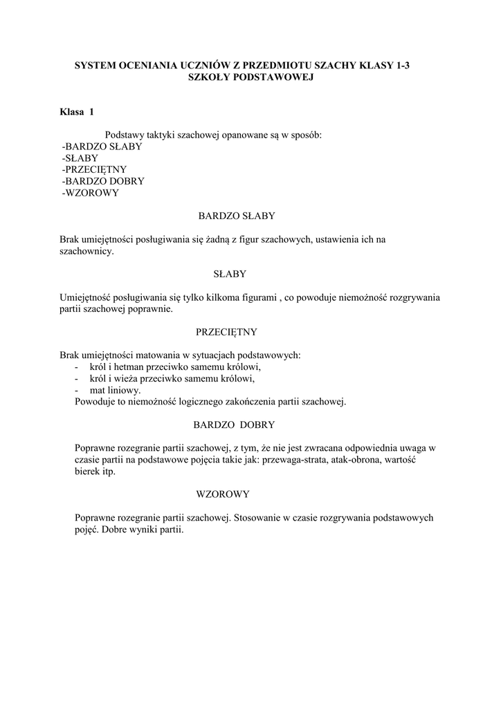 SYSTEM OCENIANIA UCZNIÓW Z PRZEDMIOTU SZACHY KLASY 1-3 SZKOŁY PODSTAWOWEJ Klasa 1 Podstawy taktyki szachowej opanowane są w sposób: -BARDZO SŁABY -SŁABY -PRZECIĘTNY -BARDZO DOBRY -WZOROWY BARDZO SŁABY Brak umiejętności posługiwania się żadną z figur szachowych, ustawienia ich na szachownicy. SŁABY Umiejętność posługiwania się tylko kilkoma figurami , co powoduje niemożność rozgrywania partii szachowej poprawnie. PRZECIĘTNY Brak umiejętności matowania w sytuacjach podstawowych: - król i hetman przeciwko samemu królowi, - król i wieża przeciwko samemu królowi, - mat liniowy. Powoduje to niemożność logicznego zakończenia partii szachowej. BARDZO DOBRY Poprawne rozegranie partii szachowej, z tym, że nie jest zwracana odpowiednia uwaga w czasie partii na podstawowe pojęcia takie jak: przewaga-strata, atak-obrona, wartość bierek itp. WZOROWY Poprawne rozegranie partii szachowej. Stosowanie w czasie rozgrywania podstawowych pojęć. Dobre wyniki partii. Klasa 2 Podstawy taktyki szachowej opanowane są przez ucznia w sposób; - BARDZO SŁABY - SŁABY - PRZECIETNY - BARDZO DOBRY - WZOROWY • BARDZO SŁABY Brak umiejętności poprawnego rozgrywania partii szachowej. • SŁABY Potrafi rozegrać podstawową partię bez posiadania wiedzy na temat taktyki szachowej. • PRZECIĘTNY Zna kilka podstawowych pojęć taktycznych, ale nie potrafi zastosować ich w czasie rozgrywania partii. • BARDZO DOBRY Zna najważniejsze zagadnienia taktyczne natomiast rzadko stosuje posiadaną wiedzę w czasie rozgrywki. Udział w turniejach szkolnych. • WZOROWY Wszystkie zagadnienia taktyczne opanowane są perfekcyjnie. Stale są używane w czasie partii. Widzi groźby ze strony przeciwnika. Dobre wyniki w rozgrywanych partiach oraz turniejach. Klasa 3 - Podstawy strategii szachowej opanowane są przez ucznia w sposób; BARDZO SŁABY SŁABY PRZECIETNY BARDZO DOBRY WZOROWY • BARDZO SŁABY • Brak umiejętności poprawnego rozgrywania partii szachowej. SŁABY Potrafi rozegrać podstawową partię bez posiadania wiedzy na temat strategii szachowej. • PRZECIĘTNY Zna kilka podstawowych pojęciach strategicznych, ale nie potrafi zastosować ich w czasie rozgrywania partii. • BARDZO DOBRY Zna najważniejsze zagadnienia strategiczne natomiast rzadko stosuje posiadaną wiedzę w czasie rozgrywki. Udział w turniejach szkolnych. • WZOROWY Wszystkie zagadnienia strategiczne opanowane są perfekcyjnie. Stale są używane w czasie partii. Widzi groźby ze strony przeciwnika. Dobre wyniki w rozgrywanych partiach oraz turniejach. Imię i nazwisko Składowe oceny 1. PODSTAWY GRY SZACHOWEJ - umiejętność posługiwania się figurami , pionkami - rozgrywanie partii zgodnie z zasadami gry - mat – liniowy,hetmanem,wieżą - mat –dziecięcy,szewski - stosowanie podstawowych pojęć w czasie rozgrywania partii Umiejętności i wiadomości wykraczają poza wymagania klasy 1 2. PODSTAWY TAKTYKI SZACHOWEJ - poprawne rozgrywanie partii - podstawowe pojęcia taktyczne - użycie podstawowych pojęć taktycznych w czasie rozgrywania partii - mat 2-mia gońcami - mat Legala - udział w turniejach Umiejętności i wiadomości wykraczają poza wymagania klasy 2 3. PODSTAWY STRATEGII SZACHOWEJ - poprawne rozgrywanie partii - podstawowe pojęcia strategiczne - użycie podstawowych pojęć strategicznych w czasie rozgrywania partii - podstawowa wiedza na temat debiutów oraz końcówek - udział w turniejach Umiejętności i wiadomości wykraczają poza wymagania klasy 3 Podpis nauczyciela Podpis rodzica Postaw znak ( + ) lub ( - ) przy danej składowej Dyscyplina sportowa - SZACHY Klasa 1 Klasa 2 Semestr1 Semestr2 Semestr1 Semestr2 Klasa 3 Semestr1 Semestr2