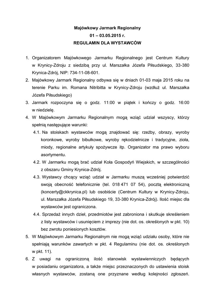 Majówkowy Jarmark Regionalny 01 – 03.05.2015 r. REGULAMIN DLA WYSTAWCÓW 1. Organizatorem Majówkowego Jarmarku Regionalnego jest Centrum Kultury w Krynicy-Zdroju z siedzibą przy ul. Marszałka Józefa Piłsudskiego, 33-380 Krynica-Zdrój, NIP: 734-11-08-601. 2. Majówkowy Jarmark Regionalny odbywa się w dniach 01-03 maja 2015 roku na terenie Parku im. Romana Nitribitta w Krynicy-Zdroju (wzdłuż ul. Marszałka Józefa Piłsudskiego) 3. Jarmark rozpoczyna się o godz. 11:00 w piątek i kończy o godz. 16:00 w niedzielę. 4. W Majówkowym Jarmarku Regionalnym mogą wziąć udział wszyscy, którzy spełnią następujące warunki: 4.1. Na stoiskach wystawców mogą znajdować się: rzeźby, obrazy, wyroby koronkowe, wyroby bibułkowe, wyroby rękodzielnicze i tradycyjne, zioła, miody, regionalne artykuły spożywcze itp. Organizator ma prawo wyboru asortymentu. 4.2. W Jarmarku mogą brać udział Koła Gospodyń Wiejskich, w szczególności z obszaru Gminy Krynica-Zdrój. 4.3. Wystawcy chcący wziąć udział w Jarmarku muszą wcześniej potwierdzić swoją obecność telefonicznie (tel. 018 471 07 54), pocztą elektroniczną ([email protected]) lub osobiście (Centrum Kultury w Krynicy-Zdroju, ul. Marszałka Józefa Piłsudskiego 19, 33-380 Krynica-Zdrój). Ilość miejsc dla wystawców jest ograniczona. 4.4. Sprzedaż innych dzieł, przedmiotów jest zabroniona i skutkuje skreśleniem z listy wystawców i usunięciem z imprezy (nie dot. os. określonych w pkt. 10) bez zwrotu poniesionych kosztów. 5. W Majówkowym Jarmarku Regionalnym nie mogą wziąć udziału osoby, które nie spełniają warunków zawartych w pkt. 4 Regulaminu (nie dot. os. określonych w pkt. 11). 6. Z uwagi na ograniczoną ilość stanowisk wystawienniczych będących w posiadaniu organizatora, a także miejsc przeznaczonych do ustawienia stoisk własnych wystawców, zostaną one przyznane według kolejności zgłoszeń. Stanowiska oraz miejsca udostępniane są według cennika stanowiącego załącznik nr 1 do niniejszego Regulaminu. Długość stoiska nie może przekraczać 2 metrów. 7. Zgłaszać należy się w dniach od 01 do 17 kwietnia 2015 roku (Koła Gospodyń Wiejskich do 15 kwietnia). Zgłoszenia osobiste i telefoniczne przyjmowane są w godzinach pracy Centrum Kultury – tj. 8:00 – 16:00 (Sb, Nd – biura nieczynne). Przy zgłoszeniu stoiska należy przedstawić Organizatorowi zdjęcie stoiska (namiotu lub innej konstrukcji). Organizator zastrzega sobie prawo wyboru stoisk. Z uwagi na wyrównanie szans na zgłoszenie się wystawców, zgłoszenia przed wyżej wymienionym terminem nie będą uwzględniane. 8. Stanowiska zostaną ponumerowane i przypisane do wystawców w momencie zgłoszenia się liczby osób równej liczbie stanowisk. Informacje na temat numeru przypisanego stanowiska będą udostępniane przez koordynatora imprezy nie wcześniej niż 24 kwietnia 2015 r. Wystawcy posiadający własne stoiska będą informowani i lokalizowani w dniu rozpoczęcia imprezy. 9. Organizator udostępnia tylko i wyłącznie własne stanowiska oraz miejsca przeznaczone do ustawienia własnych stoisk przez wystawców (krzesła, stoliki, regały wystawowe, itp. zapewniają sobie wystawcy we własnym zakresie). 10. Organizator wyraża zgodę na wjazd samochodami na teren Parku im. Romana Nitribitta na określonych warunkach: 10.1. Wystawcy mają prawo wjazdu na teren Parku w celu wyładowania wystawianych przedmiotów w piątek, sobotę i niedzielę w godz. 8:00 – 10:00, a także późniejszego spakowania po zakończeniu imprezy: w piątek i sobotę w godz. 18:00 – 20:00, a w niedzielę w godz. 16:00 – 18:00 (podczas rozładunku organizator może poprosić o podanie numeru rej. pojazdu). 10.2. Po wyładowaniu przedmiotów, a także po spakowaniu wystawcy zobowiązani są do niezwłocznego opuszczenia pojazdem parku (pojazdy można zaparkować na dowolnym parkingu w okolicach Parku – parkingi przy ul. Cichej oraz ul. Dąbrowskiego są bezpłatne). 10.3. Wjazd na teren Parku w godzinach innych niż podane w pkt. 10.1. może odbyć się wyłącznie po wyrażeniu zgody przez organizatora/koordynatora imprezy (należy podać okoliczności np. spóźnienie, chęć wcześniejszego opuszczenia imprezy). 10.4. Osoby które podczas trwania imprezy, pozostawią mimo wyraźnego zakazu pojazdy na terenie Parku, zostaną ukarane mandatami karnymi zgodnie z obowiązującymi przepisami na wniosek organizatora – organizator nie ponosi odpowiedzialności za pojazdy osób nie związanych z imprezą). 10.5. Wystawcy wjeżdżający na teren Parku muszą stosować się do ewentualnych uwag organizatora. 11. Poza osobami wymienionymi w pkt. 4 regulaminu organizator zastrzega sobie prawo udziału w Jarmarku Sponsorów wydarzenia, którym udostępni miejsce na własne stanowisko promocyjne. Dodatkowo organizator udostępnia maksymalnie 3 miejsca dla osób chcących wystawić się z balonami, dmuchanymi atrakcjami dla dzieci, gastronomią, itp. – organizator wyraża zgodę na obecność tych osób ze względu na odbywające się w trakcie trwania Jarmarku występy. Godziny, w których będzie się można rozstawić będą inne niż godziny podane w pkt. 10.1. i zostaną ustalone bezpośrednio z organizatorem Jarmarku. 12. Podczas Jarmarku wystawcy będą mogli korzystać z toalety w Kinie Cyfrowym 3D Jaworzyna II. Wystawcy proszeni są o dbanie o czystość i pozytywny wizerunek swoich stoisk. 13. Regulamin obowiązuje wszystkich wystawców biorących udział w Majówkowym Jarmarku Regionalnym. 14. Osoby nie przestrzegające regulaminu lub rażąco naruszające regulamin zostaną poproszone o opuszczenie imprezy bez zwrotu poniesionych kosztów. Regulamin Majówkowego Jarmarku Regionalnego został rozesłany wraz z cennikiem, jest również dostępny na internetowej stronie Centrum Kultury w Krynicy-Zdroju (www.ckkrynica.pl) Organizator zastrzega sobie prawo zmiany Regulaminu po wcześniejszym powiadomieniu Wystawców. Kry