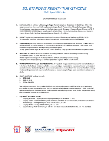 52. ETAPOWE REGATY TURYSTYCZNE 23-31 lipca 2016 roku ZAWIADOMIENIE O REGATACH 1. ZAPRASZAMY do udziału w Etapowych Regat Turystycznych w dniach od 23 do 31 lipa 2016 roku rozgrywanych na akwenach Zalewu Szczecińskiego, Zatoki Pomorskiej, Morza Bałtyckiego, Zalewu Kamieńskiego, organizowanych przez Zachodniopomorski Okręgowy Związek Żeglarski wraz z YACHT KLUBEM POLSKI SZCZECIN przy współudziale Władz Miast i Gmin: Świnoujścia, Dziwnowa, Kamienia Pomorskiego, Polic, Wolina, Nowego Warpna, Stepnicy, Trzebieży. 2. REGATY zostaną przeprowadzone zgodnie z Przepisami Regatowymi Żeglarstwa 2013 – 2016. W przypadku konfliktu między przepisami obowiązują postanowienia Instrukcji Żeglugi. 3. ZGŁOSZENIA oraz listy załogi na załączonym formularzu będą przyjmowane do środy 15 lipca 2015 r. w Biurze ZOZŻ Szczecin. Dopuszcza się uczestnictwo jachtu w dowolnie wybranej części regat pod warunkiem zgłoszenia się na 24 godziny przed wyścigiem. Jachty zgłoszone do regat w klasach ORC i KWR powinny załączyć aktualne świadectwo pomiarowe.* 4. WPISOWE DO REGAT * wynosi 200 PLN za każdy jacht oraz 20 PLN za każdego członka załogi. Po terminie opłata za jacht wzrasta o 100 %. Udział w jednym wyścigu 50 PLN za jacht oraz 20 PLN za każdego członka załogi. Przygotowanie miejsc postoju w portach pozostaje w gestii Władz Miast i Gmin. 5. WYMAGANIA DOTYCZĄCE BEZPIECZEŃSTWA W regatach mogą uczestniczyć jachty jednokadłubowe balastowe i balastowo- mieczowe, kabinowe, posiadające wyposażenie wyszczególnione w niniejszym zawiadomieniu. Na każdym jachcie powinien znajdować się radiotelefon UKF oraz telefon komórkowy. Ponieważ Organizator nie zapewnia holowania na żadnym etapie Regat jacht powinien mieć sprawny silnik. 6. KLASY JACHTÓW według formuły: 1. ORC CLUB 2. KWR: I, II, III 3. OPEN: ZAŁOGI Warunkiem rozegrania Regat w każdej klasie jest zgłoszenie co najmniej 5 jachtów, w przeciwnym przypadku grupy zostaną połączone. Jacht posiadający świadectwo pomiarowe ORC i KWR może być zgłoszony wyłącznie do jednej klasy. Do klasy OPEN może być zgłaszany jacht, które nie posiada wyżej wymienionych świadectw pomiarowych. 7. ŁĄCZNOŚĆ W CZASIE REGAT 1. Między jachtami, Organizatorem i Sędzią Głównym służy kanał 77 UKF, 2. Między Traffic Szczecin i Świnoujście, Dziwnów, Trzebież oraz Bosmanami portu Wolin, Kamienia Pomorskiego i Nowego Warpna służy kanały 69,12,10 UKF, 3. Między służbą SAR a jachtami kanały 16 i 11 UKF. 4. Organizatorzy: Piotr Stelmarczyk, tel. 887 166 316, Sędzia: Izabella Kidacka, tel. 781 514 121, 52. ETAPOWE REGATY TURYSTYCZNE 23-31 lipca 2016 roku 8. PROGRAM 52. Etapowych Regat Turystycznych PIĄTEK 22 lipca SOBOTA 23 lipca NIEDZIELA 24 lipca PONIEDZIAŁEK 25 lipca WTOREK 26 lipca ŚRODA 27 lipca CZWARTEK 28 lipca PIĄTEK 29 lipca SOBOTA 30 lipca NIEDZIELA 31 lipca 9. 17: 00 - 19: 00 Przyjmowanie zgłoszeń w Biurze Regat Portu Trzebież 08.00 Odprawa kapitanów 10: 00 Uroczyste otwarcie regat 11: 30 Start do I etapu na trasie Trzebież – Świnoujście 08.00 Odprawa kapitanów 10: 00 Start do II etapu na trasie Świnoujście-Świnoujście Wyścig o Błękitną Wstęgę Zatoki Pomorskiej 19: 00 Spotkanie żeglarskie organizowane przez Miasto Świnoujście 08.00 Odprawa kapitanów 10: 00 Start do III etapu wyścigu na trasie Świnoujście-Dziwnów Wyścig o Puchar Mikołajka Nadmorskiego 19: 00 spotkanie żeglarskie organizowane przez Miasto Dziwnów 08.00 Odprawa kapitanów 10.00 Przejście do Mariny Kamień Pomorski 14: 00 Start do IV etapu na trasie Kamień Pomorski-Kamień Pomorski Wyścig o Błękitną Wstęgę Zalewu Kamieńskiego 19: 00 Spotkanie żeglarskie organizowane przez Miasto Kamień Pomorski 08.00 Odprawa kapitanów 10: 00 -16: 00 Przejście do Wolina 19: 00 Spotkanie żeglarskie organizowane przez Miasto Wolin 08.00 Odprawa kapitanów 10: 00 Start do V etapu na trasie Wolin - Nowe Warpno Wyścig o Puchar Burmistrza Nowego Warpna 19: 00 Spotkanie żeglarskie organizowane przez Gminę Nowe Warpno 08.00 Odprawa kapitanów 10: 00 Start do VI etapu na trasie Nowe Warpno – Stepnica jednocześnie Wyścig o Błękitną Wstęgę Zalewu Szczecińskiego 19: 00 Spotkanie żeglarskie organizowane przez władze Gminy Stepnica 08.00 Odprawa kapitanów 10: 00 Opuszczenie portu i przejście turystyczne na trasie Stepnica – Szczecin 11: 00 Wręczenie nagród i uroczyste zakończenie Regat w Szczecinie w Marinie Nord – E. Spotkanie organizowane przez władze Miasta Szczecin NAGRODY 1. Puchary dla zwycięskich jachtów grupy ORC, KWR, OPEN 2. Puchar dla jachtu, który całą trasę Regat przepłynie w bezwzględnie w najkrótszym czasie 3. Błękitna Wstęga Zatoki Pomorskiej – Świnoujście 4. Puchar Mikołajka Nadmorskiego – Dziwnów 5. Błękitna Wstęga Zalewu Kamieńskiego – Kamień Pomorski 6. Błękitna Wstęga Zalewu Szczecińskiego – Stepnica 7. Puchar Burmistrza Nowego Warpna 8. Dyplomy dla wszystkich uczestników regat 9. Nagrody losowane wśród uczestników regat 10. Przyjęcie uczestników Regat w poszczególnych portach zależy od Gospodarzy Władz Miast i Gmin. 10. Załączniki: 1. Formularz Zgłoszenia do 52. ERT Zachodniopomorskiego Szlaku Żeglarskiego 2. Lista Załogi 3. Wymagania dotyczące wyposażenia jachtu