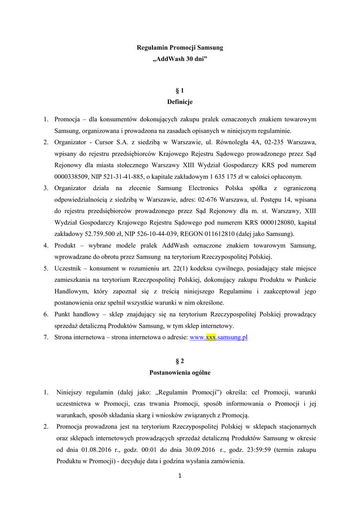 Regulamin Promocji Samsung „AddWash 30 dni” §1 Definicje 1. Promocja – dla konsumentów dokonujących zakupu pralek oznaczonych znakiem towarowym Samsung, organizowana i prowadzona na zasadach opisanych w niniejszym regulaminie. 2. Organizator - Cursor S.A. z siedzibą w Warszawie, ul. Równoległa 4A, 02-235 Warszawa, wpisany do rejestru przedsiębiorców Krajowego Rejestru Sądowego prowadzonego przez Sąd Rejonowy dla miasta stołecznego Warszawy XIII Wydział Gospodarczy KRS pod numerem 0000338509, NIP 521-31-41-885, o kapitale zakładowym 1 635 175 zł w całości opłaconym. 3. Organizator działa na zlecenie Samsung Electronics Polska spółka z ograniczoną odpowiedzialnością z siedzibą w Warszawie, adres: 02-676 Warszawa, ul. Postępu 14, wpisana do rejestru przedsiębiorców prowadzonego przez Sąd Rejonowy dla m. st. Warszawy, XIII Wydział Gospodarczy Krajowego Rejestru Sądowego pod numerem KRS 0000128080, kapitał zakładowy 52.759.500 zł, NIP 526-10-44-039, REGON 011612810 (dalej jako Samsung). 4. Produkt – wybrane modele pralek AddWash oznaczone znakiem towarowym Samsung, wprowadzane do obrotu przez Samsung na terytorium Rzeczypospolitej Polskiej. 5. Uczestnik – konsument w rozumieniu art. 22(1) kodeksu cywilnego, posiadający stałe miejsce zamieszkania na terytorium Rzeczpospolitej Polskiej, dokonujący zakupu Produktu w Punkcie Handlowym, który zapoznał się z treścią niniejszego Regulaminu i zaakceptował jego postanowienia oraz spełnił wszystkie warunki w nim określone. 6. Punkt handlowy – sklep znajdujący się na terytorium Rzeczypospolitej Polskiej prowadzący sprzedaż detaliczną Produktów Samsung, w tym sklep internetowy. 7. Strona internetowa – strona internetowa o adresie: www.xxx.samsung.pl §2 Postanowienia ogólne 1. Niniejszy regulamin (dalej jako: „Regulamin Promocji”) określa: cel Promocji, warunki uczestnictwa w Promocji, czas trwania Promocji, sposób informowania o Promocji i jej warunkach, sposób składania skarg i wniosków związanych z Promocją. 2. Promocja prowadzona jest na terytorium Rzeczypospolitej Polskiej w sklepach stacjonarnych oraz sklepach internetowych prowadzących sprzedaż detaliczną Produktów Samsung w okresie od dnia 01.08.2016 r., godz. 00:01 do dnia 30.09.2016 r., godz. 23:59:59 (termin zakupu Produktu w Promocji) - decyduje data i godzina wysłania zamówienia. 1 3. Promocja ma na celu zapewnienie Uczestnikom możliwości odprzedaży na warunkach określonych w niniejszym Regulaminie zakupionego Produktu Organizatorowi, w przypadku braku satysfakcji z jego użytkowania, a ponadto uzyskanie przez Organizatora od Uczestników informacji na temat przyczyn braku satysfakcji z Produktów. 4. W Promocji nie mogą uczestniczyć osoby będące pracownikami Organizatora oraz Samsung, a także członkowie rodzin tych pracowników. Za członków rodziny uznaje się małżonka, wstępnych, zstępnych, rodzeństwo oraz osoby pozostające w stosunku przysposobienia. 5. Promocja nie obejmuje Produktów zakupionych na podstawie umowy o kredyt konsumencki, umowy pożyczki lub umowy sprzedaży na raty. 6. Promocja nie łączy się z innymi promocjami ogłaszanymi przez Organizatora i Samsung. §3 Zasady uczestnictwa w Promocji 1. Z zastrzeżeniem dalszych postanowień Regulaminu, Organizator przyznaje Uczestnikowi Promocji, który w okresie trwania Promocji kupi jeden z Produktów, prawo do odprzedaży tegoż Produktu Organizatorowi w terminie 30 dni kalendarzowych od daty jego zakupu i otrzymania równowartości jego ceny brutto wskazanej na Dowodzie Zakupu, w razie braku satysfakcji z tego Produktu. 2. Szczegółowe zestawienie pralek Samsung objętych Promocją, poprzez wskazanie ich modeli zawiera Załącznik nr 1 do niniejszego Regulaminu. 3. Aby skorzystać z prawa, o którym mowa w pkt. 1. powyżej Uczestnik musi spełnić łącznie następujące warunki: a) zakupić dnia w sprzedaży 01.08.2016r. do detalicznej dnia w Punkcie 30.09.2016r. (okres Handlowym trwania w okresie Promocji) od jeden z Produktów; b) wypełnić, w terminie 30 dni kalendarzowych od daty zakupu Produktu (decyduje data widniejąca na dowodzie zakupu), nie później jednak niż do dnia 30.10.2016 r., Formularz zamieszczony na Stronie Internetowej: www.xxx.samsung.pl i przesłać go Organizatorowi za pośrednictwem Strony Internetowej, wraz z czytelnym skanem lub zdjęciem dowodu zakupu. 4. Prawidłowo wypełniony Formularz powinien zawierać: a) dane osobowe Uczestnika (imię, nazwisko, adres,); b) określenie zakupionego Produktu oraz miejsca jego zakupu; c) określenie przyczyny niezadowolenia z użytkowania Produktu (fakultatywne); d) czytelny skan lub zdjęcie Dowodu Zakupu wraz z wymienionym na nim modelem Produktu; e) potwierdzenie zapoznania się i akceptację Regulaminu; 2 g) numer rachunku bankowego Uczestnika, na który ma być przelana kwota z tytułu odkupu Produktu. 5. Data i godzina zakupu Produktu, widniejąca na skanie dołączonego dowodu zakupu Produktu nie może być późniejsza niż data rejestracji formularza zgłoszeniowego za pośrednictwem Strony internetowej. 6. Opisane przez Uczestnika w Formularzu przyczyny braku satysfakcji z Produktu lub brak takiego opisu nie stanowi podstawy do niewypłacenia Uczestnikowi równowartości ceny brutto Produktu. Opisy te mają jedynie walor informacyjny (informacje te posłużą do opracowywania wyrobów o coraz lepszych walorach użytkowych oraz funkcjonalnych). 7. Uznaje się, iż wypełniony przez Uczestnika Formularz zamieszczony na Stronie internetowej jest ofertą odprzedaży Produktu Organizatorowi za równowartość ceny brutto uiszczonej za ten Produkt (określonej na podstawie dowodu zakupu). 8. Dane podane przez Uczestnika w Formularzu zgłoszeniowym zostaną zweryfikowane przez Organizatora w ciągu 7 dni roboczych od dnia wysyłki Formularza (akceptacja oferty odprzedaży). O rezultacie weryfikacji Uczestnik zostanie poinformowany drogą elektroniczną (na