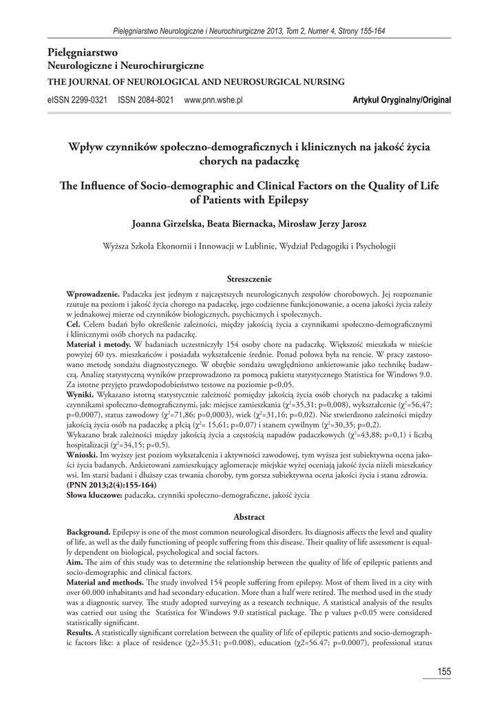 Pielęgniarstwo Neurologiczne i Neurochirurgiczne 2013, Tom 2, Numer 4, Strony 155-164 Pielęgniarstwo Neurologiczne i Neurochirurgiczne THE JOURNAL OF NEUROLOGICAL AND NEUROSURGICAL NURSING eISSN 2299-0321 ISSN 2084-8021 www.pnn.wshe.pl Artykuł Oryginalny/Original Wpływ czynników społeczno-demograficznych i klinicznych na jakość życia chorych na padaczkę The Influence of Socio-demographic and Clinical Factors on the Quality of Life of Patients with Epilepsy Joanna Girzelska, Beata Biernacka, Mirosław Jerzy Jarosz Wyższa Szkoła Ekonomii i Innowacji w Lublinie, Wydział Pedagogiki i Psychologii Streszczenie Wprowadzenie. Padaczka jest jednym z najczęstszych neurologicznych zespołów chorobowych. Jej rozpoznanie rzutuje na poziom i jakość życia chorego na padaczkę, jego codzienne funkcjonowanie, a ocena jakości życia zależy w jednakowej mierze od czynników biologicznych, psychicznych i społecznych. Cel. Celem badań było określenie zależności, między jakością życia a czynnikami społeczno-demograficznymi i klinicznymi osób chorych na padaczkę. Materiał i metody. W badaniach uczestniczyły 154 osoby chore na padaczkę. Większość mieszkała w mieście powyżej 60 tys. mieszkańców i posiadała wykształcenie średnie. Ponad połowa była na rencie. W pracy zastosowano metodę sondażu diagnostycznego. W obrębie sondażu uwzględniono ankietowanie jako technikę badawczą. Analizę statystyczną wyników przeprowadzono za pomocą pakietu statystycznego Statistica for Windows 9.0. Za istotne przyjęto prawdopodobieństwo testowe na poziomie p<0,05. Wyniki. Wykazano istotną statystycznie zależność pomiędzy jakością życia osób chorych na padaczkę a takimi czynnikami społeczno-demograficznymi, jak: miejsce zamieszkania (χ2=35,31; p=0,008), wykształcenie (χ2=56,47; p=0,0007), status zawodowy (χ2=71,86; p=0,0003), wiek (χ2=31,16; p=0,02). Nie stwierdzono zależności między jakością życia osób na padaczkę a płcią (χ2= 15,61; p=0,07) i stanem cywilnym (χ2=30,35; p=0,2). Wykazano brak zależności między jakością życia a częstością napadów padaczkowych (χ2=43,88; p=0,1) i liczbą hospitalizacji (χ2=34,15; p=0,5). Wnioski. Im wyższy jest poziom wykształcenia i aktywności zawodowej, tym wyższa jest subiektywna ocena jakości życia badanych. Ankietowani zamieszkujący aglomeracje miejskie wyżej oceniają jakość życia niżeli mieszkańcy wsi. Im starsi badani i dłuższy czas trwania choroby, tym gorsza subiektywna ocena jakości życia i stanu zdrowia. (PNN 2013;2(4):155-164) Słowa kluczowe: padaczka, czynniki społeczno-demograficzne, jakość życia Abstract Background. Epilepsy is one of the most common neurological disorders. Its diagnosis affects the level and quality of life, as well as the daily functioning of people suffering from this disease. Their quality of life assessment is equally dependent on biological, psychological and social factors. Aim. The aim of this study was to determine the relationship between the quality of life of epileptic patients and socio-demographic and clinical factors. Material and methods. The study involved 154 people suffering from epilepsy. Most of them lived in a city with over 60.000 inhabitants and had secondary education. More than a half were retired. The method used in the study was a diagnostic survey. The study adopted surveying as a research technique. A statistical analysis of the results was carried out using the Statistica for Windows 9.0 statistical package. The p values p<0.05 were considered statistically significant. Results. A statistically significant correlation between the quality of life of epileptic patients and socio-demographic factors like: a place of residence (χ2=35.31; p=0.008), education (χ2=56.47; p=0.0007), professional status 155 Girzelska i wsp. / PNN 2013, Tom 2, Numer 4, Strony 155-164 (χ2=71.86; p=0.0003), and age (χ2=31.16; p=0.02). There was no correlation between the quality of life of people with epilepsy and their sex (χ2=15.61; p=0.07) and marital status (χ2=30.35; p=0.2). The results displayed no relationship between the quality of life and seizure frequency (χ2=43.88; p=0.1) and the number of hospitalizations (χ2=34.15; p=0.5). Conclusions. The higher the level of education and professional activity, the higher the subjective assessment of the quality of life of patients. Respondents living in urban agglomerations asses their quality of life higher compared to those living in rural areas. The older the respondents and the longer disease, the worse the subjective assessment of the quality of life and health. (PNN 2013;2(4):155-164) Key words: epilepsy, socio-demographic factors, quality of life Wprowadzenie Materiał i metoda Każda choroba, bez względu na jej rodzaj, fazę procesu chorobowego czy nasilenie, wpływa na życie człowieka, prowadząc do jego dezorganizacji, ograniczenia pełnienia ról społecznych a tym samym do obniżenia poziomu i jakości życia [1]. Chociaż pojęcie jakości życia pojawia się w wielu naukach, nie ma jak dotąd modelu teoretycznego, który opisywałby jednoznacznie zagadnienie jakości życia człowieka. Gotay podaje, że jakość życia to stan dobrego samopoczucia składającego się z dwu elementów: zdolności radzenia sobie z codziennymi zadaniami, co odzwierciedla dobre samopoczucie na poziomie fizycznym, psychicznym, społecznym i satysfakcji pacjenta z jego funkcjonowania na wszystkich poziomach oraz kontroli nad chorobą i/lub objawami związanymi z zastosowaną terapią [2]. Padaczka jest jednym z najczęstszych neurologicznych zespołów chorobowych. Współcześnie definiuje się ją, jako występowanie przemijających, zsynchronizowanych, nadmiernych i niekontrolowanych wyładowań w obrębie neuronów, które muszą się powtarzać, ponieważ pojedynczego napadu nie można uznać za padaczkę [3]. Rozpoznanie padaczki rzutuje na poziom i jakość życia chorego na padaczkę, i 