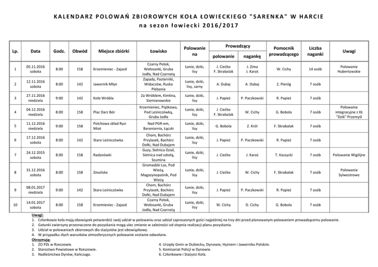 KALENDARZ POLOWAŃ ZBIOROWYCH KOŁA ŁOWIECKIEGO "SARENKA" W HARCIE na sezon łowiecki 2016/2017 Lp. Data Godz. Obwód Miejsce zbiórki 1 05.11.2016 sobota 8:00 158 Krzemieniec - Zajazd 2 12.11.2016 sobota 8:00 142 Jawornik Młyn 3 27.11.2016 niedziela 9:00 142 Koło Wróbla 4 04.12.2016 niedziela 8:00 158 Plac Darz Bór 5 11.12.2016 niedziela 9:00 158 Polchowa skład Rysi Miot 6 17.12.2016 sobota 8:00 142 Stara Leśniczówka 7 24.12.2015 sobota 8:00 158 Radanówki 8 31.12.2016 sobota 8:00 158 Zmuliska 9 08.01.2017 niedziela 9:00 142 Stara Leśniczówka 10 14.01.2017 sobota 8:00 158 Krzemieniec - Zajazd Łowisko Polowanie na Prowadzący Pomocnik prowadzącego Liczba naganki Uwagi Polowanie Hubertowskie polowanie nagankę Łanie, dziki, lisy J. Ciećko F. Skrabalak J. Zima J. Karaś W. Cichy 14 osób Łanie, dziki, lisy, sarny A. Dubaj A. Dubaj Z. Pieróg 7 osób Za Wróblem, Kimlina, Siemianowskie Łanie, dziki, lisy J. Papież P. Paczkowski R. Papież 7 osób Krzemieniec, Piątkowa, Pod Leśniczówką, Gruba Jodła Łanie, dziki, lisy J. Ciećko F. Skrabalak W. Cichy G. Bobola 7 osób Nad PGR-em, Baraniarnia, Łączki Łanie, dziki, lisy G. Bobola Z. Król F. Skrabalak 7 osób Łanie, dziki, lisy J. Papież P. Paczkowski R. Papież 7 osób Łanie, dziki, lisy J. Ciećko J. Karaś T. Kaszycki 7 osób Polowanie Wigilijne Łanie, dziki, lisy J. Ciećko W. Cichy F. Skrabalak 7 osób Polowanie Sylwestrowe Łanie, dziki, lisy J. Papież P. Paczkowski R. Papież 7 osób Łanie, dziki, lisy W. Cichy D. Cichy G. Bobola 7 osób Czarny Potok, Wołosanki, Gruba Jodła, Nad Czarnotą Zapady, Pasterniki, Widaczów, Ruska Plebania Chom, Bachórz Przylasek, Bachórz Dołki, Nad Dubajem Guzy, Sielnica Dział, Sielnica nad szkołą, Szumina Gromadzki Las, Pod Wieżą, Magazynopaśnik, Pod Wieżą Chom, Bachórz Przylasek, Bachórz Dołki, Nad Dubajem Czarny Potok, Wołosanki, Gruba Jodła, Nad Czarnotą Polowanie integracyjne z KŁ "Dzik" Przemyśl Uwagi: 1. Członkowie koła mają obowiązek potwierdzić swój udział w polowaniu oraz udział zaproszonych gości najpóźniej na trzy dni przed planowanym polowaniem prowadzącemu polowanie. 2. Gatunki zwierzyny przeznaczone do pozyskania mogą ulec zmianie w zależności od stopnia realizacji planu pozyskania. 3. Udział w polowaniach zbiorowych dla stażystów jest obowiązkowy. 4. W przypadku złych warunków atmosferycznych polowanie zostanie odwołane. Otrzymują: 1. ZO PZŁ w Rzeszowie. 4. Urzędy Gmin w Dubiecku, Dynowie, Hyżnem i Jaworniku Polskim. 2. Starostwo Powiatowe w Rzeszowie. 5. Komisariat Policji w Dynowie. 3. Nadleśnictwa Dynów, Kańczuga. 6. Członkowie i Stażyści Koła.