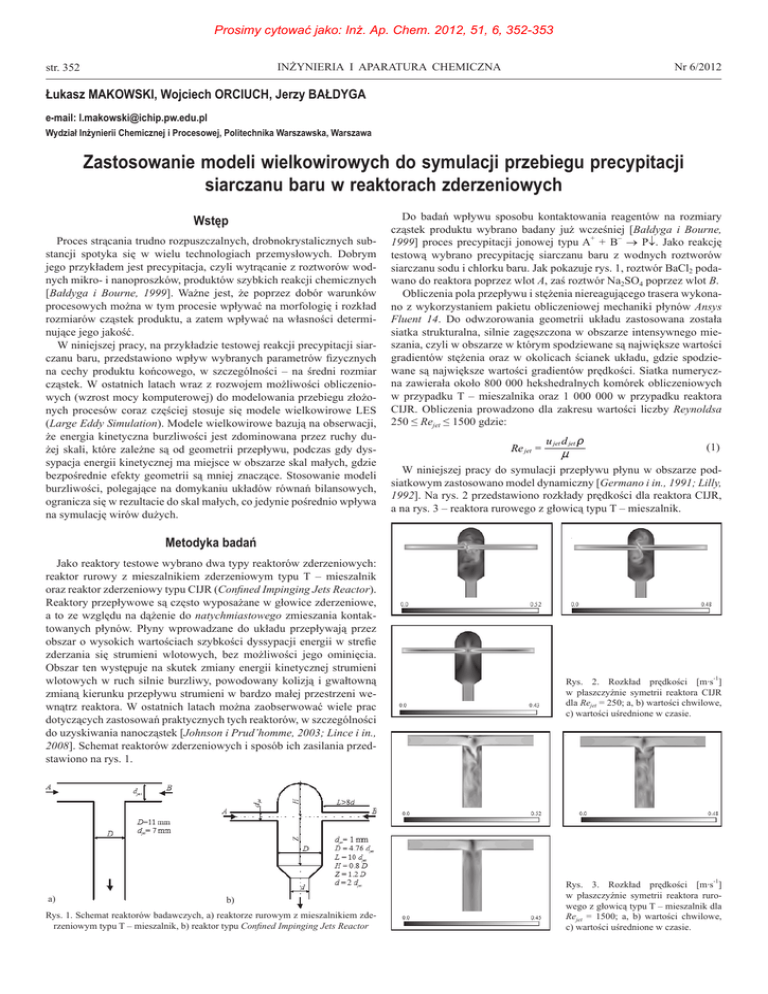 Prosimy cytować jako: Inż. Ap. Chem. 2012, 51, 6, 352-353 INŻYNIERIA I APARATURA CHEMICZNA str. 352 Nr 6/2012 Łukasz MAKOWSKI, Wojciech ORCIUCH, Jerzy BAŁDYGA e-mail: [email protected] Wydział Inżynierii Chemicznej i Procesowej, Politechnika Warszawska, Warszawa Zastosowanie modeli wielkowirowych do symulacji przebiegu precypitacji siarczanu baru w reaktorach zderzeniowych Wstęp Proces strącania trudno rozpuszczalnych, drobnokrystalicznych substancji spotyka się w wielu technologiach przemysłowych. Dobrym jego przykładem jest precypitacja, czyli wytrącanie z roztworów wodnych mikro- i nanoproszków, produktów szybkich reakcji chemicznych [Bałdyga i Bourne, 1999]. Ważne jest, że poprzez dobór warunków procesowych można w tym procesie wpływać na morfologię i rozkład rozmiarów cząstek produktu, a zatem wpływać na własności determinujące jego jakość. W niniejszej pracy, na przykładzie testowej reakcji precypitacji siarczanu baru, przedstawiono wpływ wybranych parametrów fizycznych na cechy produktu końcowego, w szczególności – na średni rozmiar cząstek. W ostatnich latach wraz z rozwojem możliwości obliczeniowych (wzrost mocy komputerowej) do modelowania przebiegu złożonych procesów coraz częściej stosuje się modele wielkowirowe LES (Large Eddy Simulation). Modele wielkowirowe bazują na obserwacji, że energia kinetyczna burzliwości jest zdominowana przez ruchy dużej skali, które zależne są od geometrii przepływu, podczas gdy dyssypacja energii kinetycznej ma miejsce w obszarze skal małych, gdzie bezpośrednie efekty geometrii są mniej znaczące. Stosowanie modeli burzliwości, polegające na domykaniu układów równań bilansowych, ogranicza się w rezultacie do skal małych, co jedynie pośrednio wpływa na symulację wirów dużych. Do badań wpływu sposobu kontaktowania reagentów na rozmiary cząstek produktu wybrano badany już wcześniej [Bałdyga i Bourne, 1999] proces precypitacji jonowej typu A+ + B− → P↓. Jako reakcję testową wybrano precypitację siarczanu baru z wodnych roztworów siarczanu sodu i chlorku baru. Jak pokazuje rys. 1, roztwór BaCl2 podawano do reaktora poprzez wlot A, zaś roztwór Na2SO4 poprzez wlot B. Obliczenia pola przepływu i stężenia niereagującego trasera wykonano z wykorzystaniem pakietu obliczeniowej mechaniki płynów Ansys Fluent 14. Do odwzorowania geometrii układu zastosowana została siatka strukturalna, silnie zagęszczona w obszarze intensywnego mieszania, czyli w obszarze w którym spodziewane są największe wartości gradientów stężenia oraz w okolicach ścianek układu, gdzie spodziewane są największe wartości gradientów prędkości. Siatka numeryczna zawierała około 800 000 hekshedralnych komórek obliczeniowych w przypadku T – mieszalnika oraz 1 000 000 w przypadku reaktora CIJR. Obliczenia prowadzono dla zakresu wartości liczby Reynoldsa 250 ≤ Rejet ≤ 1500 gdzie: u jet d jet t (1) n W niniejszej pracy do symulacji przepływu płynu w obszarze podsiatkowym zastosowano model dynamiczny [Germano i in., 1991; Lilly, 1992]. Na rys. 2 przedstawiono rozkłady prędkości dla reaktora CIJR, a na rys. 3 – reaktora rurowego z głowicą typu T – mieszalnik. Re jet = Metodyka badań Jako reaktory testowe wybrano dwa typy reaktorów zderzeniowych: reaktor rurowy z mieszalnikiem zderzeniowym typu T – mieszalnik oraz reaktor zderzeniowy typu CIJR (Confined Impinging Jets Reactor). Reaktory przepływowe są często wyposażane w głowice zderzeniowe, a to ze względu na dążenie do natychmiastowego zmieszania kontaktowanych płynów. Płyny wprowadzane do układu przepływają przez obszar o wysokich wartościach szybkości dyssypacji energii w strefie zderzania się strumieni wlotowych, bez możliwości jego ominięcia. Obszar ten występuje na skutek zmiany energii kinetycznej strumieni wlotowych w ruch silnie burzliwy, powodowany kolizją i gwałtowną zmianą kierunku przepływu strumieni w bardzo małej przestrzeni wewnątrz reaktora. W ostatnich latach można zaobserwować wiele prac dotyczących zastosowań praktycznych tych reaktorów, w szczególności do uzyskiwania nanocząstek [Johnson i Prud’homme, 2003; Lince i in., 2008]. Schemat reaktorów zderzeniowych i sposób ich zasilania przedstawiono na rys. 1. a) b) Rys. 1. Schemat reaktorów badawczych, a) reaktorze rurowym z mieszalnikiem zderzeniowym typu T – mieszalnik, b) reaktor typu Confined Impinging Jets Reactor Rys. 2. Rozkład prędkości [m·s-1] w płaszczyźnie symetrii reaktora CIJR dla Rejet = 250; a, b) wartości chwilowe, c) wartości uśrednione w czasie. Rys. 3. Rozkład prędkości [m·s-1] w płaszczyźnie symetrii reaktora rurowego z głowicą typu T – mieszalnik dla Rejet = 1500; a, b) wartości chwilowe, c) wartości uśrednione w czasie. Prosimy cytować jako: Inż. Ap. Chem. 2012, 51, 6, 352-353 INŻYNIERIA I APARATURA CHEMICZNA Nr 6/2012 Należy zauważyć, że rozkłady chwilowe prędkości nie są symetryczne. Oczywiście uśrednione w czasie wyniki obliczeń wielkowirowych pokazują symetrię przepływu uśrednionego. Efekty takie zaobserwowano zarówno w przypadku badań doświadczalnych przy zastosowaniu pomiarów laserowych, jak też w przypadku obliczeń przy użyciu modeli DNS [Schwertfirm i Manhart, 2010; Icardi i in., 2011]. Podsiatkowe modelowanie mieszania niereagującego trasera w obliczeniach wielkowirowych oparto na wykorzystaniu stałej podsiatkowej liczby Schmidta: o sgs (2) Dsgs Szybkość nukleacji siarczanu baru opisano z wykorzystaniem prostego modelu empirycznego: Scsgs = (3) n RN = kn Dc przy czym siłę napędową w powyższym równaniu zdefiniowano zależnością: (4) Dc = cA cB - KS str. 353 Wyniki i dyskusja Przedstawione na rys. 4 wyniki badania wpływu stężenia wlotowego na średni rozmiar kryształów d43 dla reaktora typu T - mieszalnik pokazują dobra zgodność wyników doświadczeń z wynikami symulacji. Więcej wyników i ich szersz
