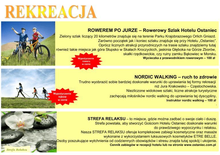 ROWEREM PO JURZE – Rowerowy Szlak Hotelu Ostaniec Zielony szlak liczący 20 kilometrów znajduje się na terenie Parku Krajobrazowego Orlich Gniazd. Zarówno początek jak i koniec szlaku znajduje się przy Hotelu „Ostaniec”. Oprócz licznych atrakcji przyrodniczych na trasie szlaku znajdziemy tutaj również takie miejsca jak góra Słupsko w Skałach Kroczyckich, jaskinia Głęboka na Górze Zborów, skałki rzędkowickie, czy ruiny zamku Bąkowiec w Morsku. Wypożyczenie roweru w cenie Wycieczka z przewodnikiem rowerowym – 100 zł NORDIC WALKING – ruch to zdrowie Wypożyczenie kijków w cenie Trudno wyobrazić sobie bardziej doskonałe warunki do uprawiania tej formy rekreacji niż Jura Krakowsko – Częstochowska. Niezliczone widokowe szlaki, liczne atrakcje turystyczne zachęcają miłośników nordic walking do uprawiania tej dyscypliny. Instruktor nordic walking – 100 zł . STREFA RELAKSU – to miejsce, gdzie można zadbać o swoje ciało i duszę. Strefa powstała, aby stworzyć Gościom Hotelu Ostaniec doskonale warunki do prawdziwego wypoczynku i relaksu. Nasza STREFA RELAKSU oferuje kompleksowe zabiegi kosmetyczne oraz masaże wykonane z wykorzystaniem luksusowych kosmetyków ETRE BELLE. Osoby poszukujące wytchnienia od codziennych obowiązków i stresu znajda tutaj spokój i ukojenie. Cennik zabiegów w recepcji hotelu lub na stronie www.ostaniec.com.pl RANCHO PASJA - położone na w Zawierciu zaprasza na profesjonalną naukę jazdy konnej. Dla osób, które zaczynają swoją przygodę z końmi proponujemy naukę jazdy konnej od podstaw. Dla bardziej zaawansowanych Gości polecamy jazdę na ujeżdżalni doskonalącą dosiad i umiejętności jeździeckie. Gości, którzy posiadają odpowiednie umiejętności jeździeckie zapraszamy na wyjazdy w teren oraz oferujemy kilka wariantów tras,o różnym stopniu trudności, Jazda dla początkujących: 30zł/30min , jazda dla zaawansowanych na maneżu: 30zł/h W terenie: 35zł/h Odległość od Hotelu: 12 km BRYCZKI - przejażdżka konnym zaprzęgiem po pięknych i ciekawych zakątkach Jury Krakowsko-Częstochowskiej. Świetna zabawa dla mały i dużych, jak i udany wypad rodzinny. Gwarantujemy świetną zabawę oraz fajny sposób na spędzenie wolnego czasu z rodziną. Koszt przejażdżki – 150 zł KORT TENISOWY I BOISKO WIELOFUNKCYJNE od kwietnia oddajemy do dyspozycji naszych Gości nowe boiska o sztucznej nawierzchni. Zwolenników gier zespołowych zapraszamy do skorzystania z naszej oferty. Nowe boisko umożliwia grę w: siatkówkę, piłkę ręczną, piłkę nożną i streetball, a na naszym nowym profesjonalnym korcie tenisowym rozegrają Państwo nie jeden zacięty pojedynek. Początkujących graczy zapraszamy na zajęcia z instruktorem. Boiska w cenie pobytu Cena instruktora: 70 zł godzina