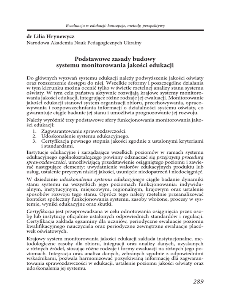 Ewaluacja w edukacji: koncepcje, metody, perspektywy dr Lilia Hrynewycz Narodowa Akademia Nauk Pedagogicznych Ukrainy Podstawowe zasady budowy systemu monitorowania jakości edukacji Do głównych wyzwań systemu edukacji należy podwyższenie jakości oświaty oraz rozszerzenie dostępu do niej. Wszelkie reformy i poszczególne działania w tym kierunku można ocenić tylko w świetle rzetelnej analizy stanu systemu oświaty. W tym celu państwa aktywnie rozwijają krajowe systemy monitorowania jakości edukacji, integrujące różne rodzaje jej ewaluacji. Monitorowanie jakości edukacji stanowi system organizacji zbioru, przechowywania, opracowywania i rozpowszechniania informacji o działalności systemu oświaty, co gwarantuje ciągłe badanie jej stanu i umożliwia prognozowanie jej rozwoju. Należy wyróżnić trzy podstawowe sfery funkcjonowania monitorowania jakości edukacji: 1. Zagwarantowanie sprawozdawczości. 2. Udoskonalenie systemu edukacyjnego. 3. Certyfikacja pewnego stopnia jakości zgodnie z ustalonymi kryteriami i standardami. Instytucje edukacyjne i zarządzające wszelkich poziomów w ramach systemu edukacyjnego ogólnokształcącego powinny odznaczać się przejrzystą procedurą sprawozdawczości, umożliwiającą przedstawienie osiągniętego poziomu i zawierać następujące elementy: uwydatnienie walorów edukacyjnych produktu lub usług, ustalenie przyczyn niskiej jakości, usunięcie niedopatrzeń i niedociągnięć. W dziedzinie udoskonalenia systemu edukacyjnego ciągłe badanie dynamiki stanu systemu na wszystkich jego poziomach funkcjonowania: indywidualnym, instytucyjnym, miejscowym, regionalnym, krajowym oraz ustalenie sposobów rozwoju tego stanu. Oprócz tego należy rzetelnie przeanalizować kontekst społeczny funkcjonowania systemu, zasoby włożone, procesy w systemie, wyniki edukacyjne oraz skutki. Certyfikacja jest przeprowadzana w celu odnotowania osiągnięcia przez osobę lub instytucję oficjalnie ustalonych odpowiednich standardów i regulacji. Certyfikacja zakłada egzaminy dla uczniów, periodyczne ewaluacje poziomu kwalifikacyjnego nauczyciela oraz periodyczne zewnętrzne ewaluacje placówek oświatowych. Krajowy system monitorowania jakości edukacji zakłada instytucjonalne, metodologiczne zasoby dla zbioru, integracji oraz analizy danych, uzyskanych z różnych źródeł, stosując różne rodzaje i formy ewaluacji na różnych jego poziomach. Integracja oraz analiza danych, zebranych zgodnie z odpowiednimi wskaźnikami, pozwala harmonizować pozyskiwaną informację dla zagwarantowania sprawozdawczości w edukacji, ustalenie poziomu jakości oświaty oraz udoskonalenia jej systemu. 289 XVII Konferencja Diagnostyki Edukacyjnej, Kraków 2011 Na Ukrainie, podobnie jak w wielu innych krajach, w procesie transformacji monitorowanie jakości edukacji odznacza się wybiórczym charakterem i do dziś nie został utworzony całościowy system. Przeprowadza się tylko niektóre elementy systemu monitorowania jakości edukacji, a mianowicie: wprowadzono egzaminy zewnętrzne; przeprowadza się badania monitorowania jakości edukacji na międzynarodowym, krajowym i regionalnym poziomie; tworzone są poszczególne systemowe bazy danych dotyczące edukacji, odgórnie oraz oddolnie; są realizowane różnorodne projekty oceny jakości oświaty placówek oświatowych. Jednak wszelkie te różne sposoby ocen jakości edukacji nie są skoordynowane ze sobą, a uzyskiwany zbiór danych zazwyczaj zatraca się i nie jest poddawany analizie systemowej. Zatem opracowanie podejścia systemowego do monitorowania jakości edukacji w kraju jest nader aktualne. Bowiem tylko dane integrowane i pozyskane z różnych źródeł, przy zastosowaniu różnych form ewaluacji, połączone w jeden System Informatyczny Zarządzania Edukacją (EMIS – Educational Menegment Information System), oraz ich analiza w czasie zgodnie z wyznaczonymi celami, uwzględniając wszystkie czynniki wpływu, może zagwarantować realizację przez krajowy system monitorowania jakości edukacji wszystkich jej zadań. Ogląd doświadczenia innych krajów świadczy o istnieniu różnych rodzajów krajowych systemów monitorowania jakości edukacji średniej. Krajowe systemy monitorowania jakości edukacji są kształtowane w pewnych kontekstach politycznych oraz ich rozwój jest uzależniony od poziomu sprawozdawczości władz wobec obywateli, wyczulenia społeczeństwa na problemy oświaty, poziom metodologii i technologii zbioru informacji, analizy i wykorzystania wyników monitorowania w celu podjęcia decyzji kierowniczych. Jednak można wyodrębnić wspólne podstawowe zasady kształtowania krajowych systemów monitorowania jakości edukacji, a mianowicie siedem następujących: 1. Stosowanie państwowych standardów edukacyjnych. Ustalone na poziomie ogólnokrajowym cele edukacji są konkretyzowane w postaci wyznaczonych krajowych standardów edukacyjnych. Właśnie standardy stanowią wyznacznik poziomu osiągniętej jakości. Monitorowanie wykazuje problemy w realizacji standardów, na podstawie czego są opracowywane sposoby ich rozwiązania oraz wysuwane propozycje dla ponowienia standardów. Zazwyczaj obowiązują trzy rodzaje standardów edukacyjnych: standardy treści (na podstawie których są opracywowane programy edukacyjne, podręczniki), standardy osiągnięć (planowanie poziomów wyników edukacyjnych uczących się, całego systemu, rynku pracy), standardy możliwości nauczania (zasoby włożone i warunki procesu edukacyjnego). 2. Stosowanie krajowego systemu wskaźników jakości edukacji na różnych poziomach zarządzania. Monitorowanie jakości edukacji nie ogranicza się wyłącznie do informacji o osiągniętych wynikach, lecz uwzględnia informację kontekstualną, dane o zasobach włożonych i procesie nauczania. Zbiór i analizę informacji przeprowadza się na podstawie opracowanego systemu wskaźników edukacyjnych. Wskaźniki edukacyjne składają się na sta