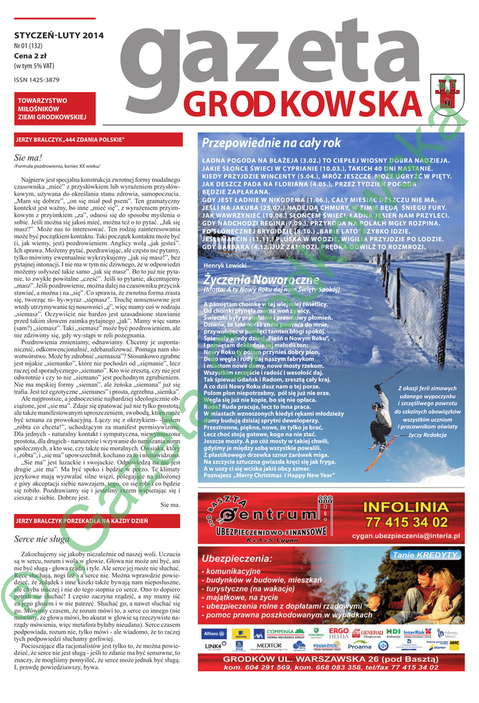 styczeń-luty 2014 Nr 01 (132) cena 2 zł (w tym 5% VAT) towarzystwo MiłoŚników zieMi grodkowskiej Przepowiednie na cały rok /Formuła pozdrowienia, koniec XX wieku/ Henryk Lewicki Życzenia Noworoczne (Motto: A ty Nowy Roku daj nam Święty Spokój) a pamiętam choinkę w tej wiejskiej świetlicy. od choinki płynęła mocna woń żywicy. Świeczki były prawdziwe i prawdziwy płomień. dziwne, że taki obraz znów powraca do mnie, przywołując w pamięci tamten błogi spokój. Śpiewały wtedy dzieci „pieśń o nowym roku”. i pamiętam dokładnie tej melodii ton: nowy roku ty polom przynieś dobry plon. dużo węgla i rudy daj naszym fabrykom i miastom nowe domy, nowe mosty rzekom. wszystkim szczęście i radość i wesołość daj. tak śpiewał gdańsk i radom, zresztą cały kraj. a co dziś nowy roku dasz nam o tej porze. polom plon niepotrzebny, pól się już nie orze. węgla się już nie kopie, bo się nie opłaca. ruda? ruda pracuje, lecz to inna praca. w miastach wznoszonych kiedyś rękami młodzieży domy budują dzisiaj sprytni deweloperzy. przestronne, piękne, nowe, że tylko je brać, lecz choć stoją gotowe, kogo na nie stać. jeszcze mosty. a po cóż mosty w takiej chwili, gdyśmy je między sobą wszystkie powalili. z plastikowego drzewka sznur żarówek miga. na szczycie sztuczna gwiazda kręci się jak fryga. a w uszy ci się wciska jakiś obcy szmer. poznajesz „Merry christmas i happy new year” az et a G Najpierw jest specjalna konstrukcja zwrotnej formy modalnego czasownika „mieć” z przysłówkiem lub wyrażeniem przysłówkowym, używana do określania stanu zdrowia, samopoczucia. „Mam się dobrze”, „on się miał pod psem”. Ten gramatyczny kontekst jest ważny, bo inne „mieć się”, z wyrażeniem przyimkowym z przyimkiem „za”, odnosi się do sposobu myślenia o sobie. Jeśli można się jakoś mieć, można też o to pytać. „Jak się masz?”. Może nas to interesować. Ten rodzaj zainteresowania może być początkiem kontaktu. Taki początek kontaktu może być (i, jak wiemy, jest) pozdrowieniem. Anglicy wolą „jak jesteś”. Ich sprawa. Możemy pytać, pozdrawiając, ale często nie pytamy, tylko mówimy ewentualnie wykrzykujemy „jak się masz!”, bez pytajnej intonacji. I nie ma w tym nic dziwnego, że w odpowiedzi możemy usłyszeć takie samo „jak się masz”. Bo to już nie pytanie, to zwykłe powitalne „cześć”. Jeśli to pytanie, akcentujemy „masz”. Jeśli pozdrowienie, można dalej na czasowniku przycisk stawiać, a można i na „się”. Co sprawia, że zwrotna forma zrasta się, tworząc ni- by-wyraz „sięmasz”. Trochę nonsensowne jest wtedy utrzymywanie tej nosowości „ę”, więc mamy coś w rodzaju „siemasz”. Oczywiście nie bardzo jest uzasadnione stawianie przed takim słowem zaimka pytajnego „jak”. Mamy więc samo (sam?) „siemasz”. Taki „siemasz” może być pozdrowieniem, ale nie zdziwimy się, gdy wy-stąpi w roli pożegnania. Pozdrowienia zmieniamy, odnawiamy. Chcemy je uspontanicznić, odkonwencjonalnić, zdebanalizować. Pomaga nam słowotwórstwo. Może by zdrobnić „siemasza”? Stosunkowo zgrabne jest nijakie „siemanko”, które nie pochodzi od „sięmanie”, lecz raczej od sporadycznego „siemano”. Kto wie zresztą, czy nie jest odwrotnie i czy to nie „siemano” jest pochodnym zgrubieniem. Nie ma męskiej formy „sieman”, ale żeńska „siemana” już się trafia. Jest też egzotyczne „siemanes” i prosta, zgrzebna „siemka”. Ale najprostsze, a jednocześnie najbardziej ideologicznie obciążone, jest „sie ma”. Zdaje się epatować już nie tylko prostotą, ale także manifestowanym uproszczeniem, swobodą, która może być uznana za prowokacyjną. Łączy się z okrzykiem- -hasłem „róbta co chceta!”, uchodzącym za manifest permisywizmu. Dla jednych - naturalny kontakt i sympatyczna, niewymuszona prostota, dla drugich - naruszenie i wzywanie do naruszania norm społecznych, a kto wie, czy także nie moralnych. Owsiaka, który i „róbta”, i „sie ma” upowszechnił, kochano za to i nienawidzono. „Sie ma” jest luzackie i swojackie. Odpowiedzą na nie jest drugie „sie ma”. Ma być spoko i będzie w porzo. Te klimaty językowe mają wyzwalać silne więzi, polegające na założonej z góry akceptacji siebie nawzajem, tego, co się robi i co będzie się robiło. Pozdrawiamy się i jesteśmy razem wspierając się i ciesząc z siebie. Dobrze jest. Sie ma. ładna pogoda na błażeja (3.02.) to ciepłej wiosny dobra nadzieja. jakie słońce Świeci w cyprianie (10.03.), takich 40 dni nastanie. kiedy przyjdzie wincenty (5.04.), Mróz jeszcze Może ugryŹĆ w pięty. jak deszcz pada na Floriana (4.05.), przez tydzień pogoda będzie zapłakana. gdy jest ładnie w nikodeMa (1.06.), cały Miesiąc deszczu nie Ma. jeŚli na jakuba (25.07.) nadejdą chMury, w ziMie będą Śniegu Fury. jak wawrzyniec (10.08.) słońceM Świeci, ładna jesień naM przyleci. gdy nadchodzi regina(7.09.), przyroda na polach Mgły rozpina. po słonecznej brygidzie (8.10.) „babie lato” szybko idzie. jeŚli Marcin (11.11.) pluska w wodzie, wigilia przyjdzie po lodzie. gdy barbara (4.12.)już zaMrozi, prędka odwilż to rozMrozi. dk ow s Sie ma! ro jerzy bralczyk „444 zdania polskie” „G jerzy bralczyk porzekadła na każdy dzień Serce nie sługa ® Zakochujemy się jakoby niezależnie od naszej woli. Uczucia są w sercu, rozum i wola w głowie. Głowa nie może ani być, ani nie być sługą - głowa rządzi i tyle. Ale serce jej może nie słuchać. Ręce słuchają, nogi też - a serce nie. Można wprawdzie powiedzieć, że żołądek i inne kiszki także bywają nam nieposłuszne, ale chyba inaczej i nie do tego stopnia co serce. Ono to dopiero potrafi nie słuchać! I często zaczyna rządzić, a my mamy iść za jego głosem i w nie patrzeć. Słuchać go, a nawet słuchać się go. Mówimy czasem, że rozum mówi to, a serce 