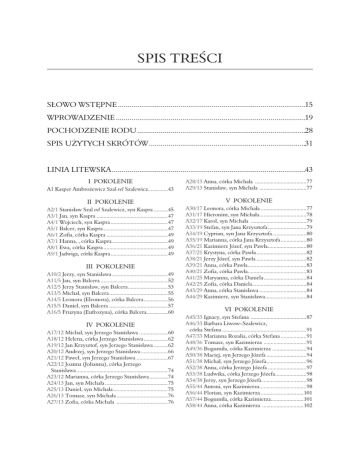 SPIS TREŒCI SPIS TREŒCI S£OWO WSTÊPNE................................................................................................15 WPROWADZENIE .................................................................................................19 POCHODZENIE RODU......................................................................................28 SPIS U¯YTYCH SKRÓTÓW................................................................................31 LINIA LITEWSKA...................................................................................................43 I POKOLENIE A1 Kasper Ambro¿ewicz Szal vel Szalewicz..............43 A28/13 Anna, córka Micha³a ....................................77 A29/13 Stanis³aw, syn Micha³a .................................77 II POKOLENIE V POKOLENIE A2/1 Stanis³aw Szal vel Szalewicz, syn Kaspra ..........45 A3/1 Jan, syn Kaspra ..................................................47 A4/1 Wojciech, syn Kaspra ........................................47 A5/1 Balcer, syn Kaspra .............................................47 A6/1 Zofia, córka Kaspra ...........................................49 A7/1 Hanna, , córka Kaspra .......................................49 A8/1 Ewa, córka Kaspra .............................................49 A9/1 Jadwiga, córki Kaspra ........................................49 A30/17 Leonora, córka Micha³a ................................77 A31/17 Hieronim, syn Micha³a.................................78 A32/17 Karol, syn Micha³a .......................................79 A33/19 Stefan, syn Jana Krzysztofa ...........................79 A34/19 Cyprian, syn Jana Krzysztofa........................80 A35/19 Marianna, córka Jana Krzysztofa ..................80 A36/21 Kazimierz Józef, syn Paw³a...........................80 A37/21 Krystyna, córka Paw³a ...................................82 A38/21 Jerzy Józef, syn Paw³a ...................................82 A39/21 Anna, córka Paw³a.........................................83 A40/21 Zofia, córka Paw³a.........................................83 A41/25 Maryanna, córka Daniela..............................84 A42/25 Zofia, córka Daniela......................................84 A43/29 Anna, córka Stanis³awa .................................84 A44/29 Kazimierz, syn Stanis³awa.............................84 III POKOLENIE A10/2 Jerzy, syn Stanis³awa .......................................49 A11/5 Jan, syn Balcera ...............................................52 A12/5 Jerzy Stanis³aw, syn Balcera............................53 A13/5 Micha³, syn Balcera .........................................55 A14/5 Leonora (Eleonora), córka Balcera.................56 A15/5 Daniel, syn Balcera .........................................57 A16/5 Fruzyna (Eufrozyna), córka Balcera...............60 IV POKOLENIE A17/12 Micha³, syn Jerzego Stanis³awa ....................60 A18/12 Helena, córka Jerzego Stanis³awa.................62 A19/12 Jan Krzysztof, syn Jerzego Stanis³awa ..........62 A20/12 Andrzej, syn Jerzego Stanis³awa ...................66 A21/12 Pawe³, syn Jerzego Stanis³awa ......................67 A22/12 Joanna (Johanna), córka Jerzego Stanis³awa ................................................................74 A23/12 Marianna, córka Jerzego Stanis³awa .............74 A24/13 Jan, syn Micha³a ............................................75 A25/13 Daniel, syn Micha³a ......................................75 A26/13 Tomasz, syn Micha³a ....................................76 A27/13 Zofia, córka Micha³a ....................................76 VI POKOLENIE A45/33 Ignacy, syn Stefana .......................................87 A46/33 Barbara Liwow–Szalewicz, córka Stefana ...........................................................91 A47/33 Marianna Rozalia, córka Stefana ..................91 A48/36 Tomasz, syn Kazimierza ..............................91 A49/36 Bogumi³a, córka Kazimierza ........................94 A50/38 Maciej, syn Jerzego Józefa ............................94 A51/38 Micha³, syn Jerzego Józefa............................96 A52/38 Anna, córka Jerzego Józefa ...........................97 A53/38 Ludwika, córka Jerzego Józefa......................98 A54/38 Jerzy, syn Jerzego Józefa ...............................98 A55/44 Antoni, syn Kazimierza.................................98 A56/44 Florian, syn Kazimierza ..............................101 A57/44 Bogumi³a, córka Kazimierza.......................101 A58/44 Anna, córka Kazimierza .............................102 6 SPIS TREŒCI A59/44 Teresa, córka Kazimierza............................102 A60/44 Katarzyna, córka Kazimierza ......................102 A103/79 Wanda, córka Kazimierza Fryderyka........135 VII POKOLENIE A104/87 Karol Tadeusz, syn Tomasza Aleksandra .............................................................135 A105/87 Leonard Eugeniusz, syn Tomasza Aleksandra .............................................................138 A106/87 Bronis³aw Józefat, syn Tomasza Aleksandra ............................................................138 A107/87 Ksawery Edward, syn Tomasza Aleksandra .............................................................138 A108/87 Zofia Helena, córka Tomasza Aleksandra .............................................................139 A109/87 Helena, córka Tomasza Aleksandra .........140 A110/87 Anna Urszula, córka Tomasza Aleksandra .............................................................140 A111/87 Ksawera, córka Tomasza Aleksandra .......141 A112/88 Aleksander (Soter), syn Józefa Wincentego Ksawerego ........................................141 A113/88 Józefa Teodozja, córka Józefa Wincentego Ksawerego ........................................142 A114/88 Ludwik Jan Antoni, syn Józefa Wincentego Ksawerego ........................................142 A115/88 Stefania Franciszka Karolina, córka Józefa Wincentego Ksawerego ...............