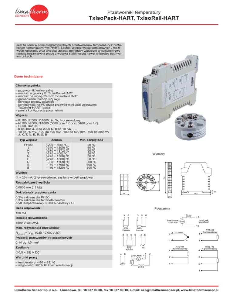 Przetworniki temperatury SENSOR TxIsoPack-HART, TxIsoRail-HART Jest to seria w pełni programowalnych przetworników temperatury z protokołem komunikacyjnym HART. Szeroki zakres wejść pomiarowych , możliwość kalibracji, oraz wysoka izolacja pomiędzy wejściem a wyjściem gwarantuje bezawaryjną pracę z wysoką stabilnością nawet w bardzo trudnych warunkach. Dane techniczne Charakterystyka – przetworniki uniwersalne – montaż w głowicy B: TxIsoPack-HART – montaż na szynę 35 mm: TxIsoRail-HART – galwaniczna izolacja wej./wyj. – korekcja błędów czujnika – konfiguracja na PC przez przewód mini USB zestawem TxConfig-HART (opcja) – prosta konfiguracja parametrów Wejście – Pt100, Pt500, Pt1000, 2-, 3-, 4-przewodowy – Ni100, Ni500, Ni1000 (5000 ppm / K oraz 6180 ppm / K) – Cu50, Cu100 – 0 do 400 Ω, 0 do 2000 Ω, 0 do 10 KΩ – 10 do 75 mV, -100 do 100 mV, -100 do 500 mV, -100 do 200 mV – J, K, T, N, E, R, S, B Typ wejścia Zakres Min. rozpiętość Pt100 J K T N E R S B (-200 ÷ 850) ºC (-210 ÷ 1200) ºC (-270 ÷ 1372) ºC (-270 ÷ 400) ºC (-270 ÷ 1300) ºC (-270 ÷ 1000) ºC (-50 ÷ 1768) ºC (-50 ÷ 1768) ºC (0 ÷ 1820) ºC 20 ºC 50 ºC 50 ºC 50 ºC 50 ºC 50 ºC 500 ºC 500 ºC 500 ºC Wymiary Wyjście (4 ÷ 20) mA, 2 -przewodowe, zasilane w pętli prądowej Rozdzielczość wyjścia 0,0003 mA (12 bit) Dokładność przetwarzania 0,2% zakresu dla Pt100 0,3% zakresu dla termoelementów dryft temperaturowy 0,003% nastawy /ºC Czas odpowiedzi Połączenia 100 ms Izolacja galwaniczna 1500 V wej./wyj. Max. rezystancja przewodów RL (max.) = (VDC-10,5) / 0,002 A [Ω] Przekrój przewodów połączeniowych 0,14 do 1,5 mm2 Zasilanie (10,5 ÷ 35) V DC Warunki pracy – temperatura: (-40 ÷ 85) oC – wilgotność: ≤90% RH bez kondensacji Limatherm Sensor Sp. z o.o. Limanowa, tel. 18 337 99 00, fax 18 337 99 10, e-mail: [email protected], www.limathermsensor.pl Przetworniki temperatury SENSOR TxIsoPack-HART, TxIsoRail-HART Kod wyrobu Wersja 1 Pack-HART wersja głowicowa Rail-HART na szynę 35 mm Zakres pomiarowy (0 ÷ 1000) °C 2 (0 ÷ 1000) °C inne parametry wg uzgodnień Typ wejścia 3 Pt100 Pt100 J J K K T T N N E E inne parametry wg uzgodnień Wyposażenie dodatkowe 4 A 2 1 TxIso z adapterem do montażu na szynę 35 mm dla TxIsoPack-HART – Przykład zamówienia: 3 – 4 – Przetwornik TxIsoPack-HART–(0 ÷ 550) ºC–S Limatherm Sensor Sp. z o.o. Limanowa, tel. 18 337 99 00, fax 18 337 99 10, e-mail: [email protected], www.limathermsensor.pl