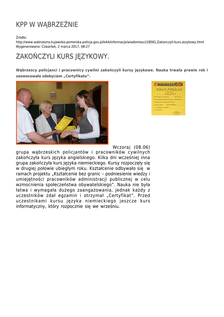 KPP W WĄBRZEŹNIE Źródło: http://www.wabrzezno.kujawsko-pomorska.policja.gov.pl/k44/informacje/wiadomosci/18581,Zakonczyli-kurs-jezykowy.html Wygenerowano: Czwartek, 2 marca 2017, 08:27 ZAKOŃCZYLI KURS JĘZYKOWY. Wąbrzescy policjanci i pracownicy cywilni zakończyli kursy językowe. Nauka trwała prawie rok i zaowocowała zdobyciem „Certyfikatu”. Wczoraj (08.06) grupa wąbrzeskich policjantów i pracowników cywilnych zakończyła kurs języka angielskiego. Kilka dni wcześniej inna grupa zakończyła kurs języka niemieckiego. Kursy rozpoczęły się w drugiej połowie ubiegłym roku. Kształcenie odbywało się w ramach projektu „Kształcenie bez granic – podniesienie wiedzy i umiejętności pracowników administracji publicznej w celu wzmocnienia społeczeństwa obywatelskiego”. Nauka nie była łatwa i wymagała dużego zaangażowania, jednak każdy z uczestników zdał egzamin i otrzymał „Certyfikat”. Przed uczestnikami kursu języka niemieckiego jeszcze kurs informatyczny, który rozpocznie się we wrześniu. st.asp. Marek Barański Oficer Prasowy Komendanta Powiatowego Policji w Wąbrzeźnie. Autor: red2.kppw Publikacja: red2.kppw Ocena: 0/5 (0) Tweetnij
