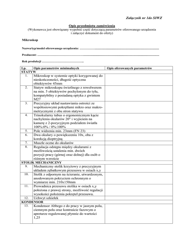 Załącznik nr 1do SIWZ Opis przedmiotu zamówienia (Wykonawca jest obowiązany wypełnić część dotyczącą parametrów oferowanego urządzenia i załączyć dokument do oferty) Mikroskop Nazwa/typ/model oferowanego urządzenia: ……………................................................................................... Producent: ……………………………………….................................................................................................. Rok produkcji ………………………………….. Lp. Opis parametrów minimalnych STATYW 1. Mikroskop w systemie optyki korygowanej do 2. 3. 4. 5. 6. 7. 8. nieskończoności, długość optyczna obiektywów 45mm Statyw mikroskopu świetlnego z rewolwerem na min. 5 obiektywów pochylonym do tyłu, kompatybilny z posiadaną optyka z gwintem M27 Precyzyjny układ nastawiania ostrości ze współosiowymi pokrętłami mikro oraz makrometrycznymi z obu stron statywu Trinokularny tubus o ergonomicznym kącie nachylenia okularów 20° i wyjściem na kamerę z 2-pozycyjnym podziałem światła 100%:0% / 0%:100% Pole widzenia min. 23mm (FN 23) Dwa okulary o powiększeniu 10x, oba z korekcją dioptryjną Muszle oczne do okularów Regulacja odstępu między okularami z możliwością ustalenia min. dwóch pozycji pracy (górnej oraz dolnej) dla osób o różnym wzroście STOLIK MECHANICZNY 9. Mechaniczny stolik krzyżowy z precyzyjnym 10. 11. układem zębatkowym przesuwu w osiach x,y Stolik z odpornym na ścieranie, utwardzonym, anodowanym pokryciem ochronnym o wymiarze min. 210x150mm Prowadnica przesuwu stolika w osiach x,y położona z prawej strony, możliwość regulacji wysokości położenia pokręteł przesuwu. Uchwyt szkiełek 12. KONDENSOR 13. Kondensor Abbego z do pracy w jasnym polu, ciemnym polu oraz kontraście fazowym o apreturze regulowanej płynnie do wartości 1,25 Opis oferowanych parametrów 14. 15. Możliwość łatwego centrowania i zmiany wysokości położenia Wbudowana, regulowana przysłona aperturowa OŚWIETLENIE DO SWIATŁA PRZECHODZĄCEGO 16. Oświetlenie halogenowe o mocy min. 35W 17. Płynna regulacja natężenia świecenia 18. Wbudowana w statyw, regulowana przysłona 19. 20. polowa Żarówka halogenowa 12V 35W Możliwość łatwej wymiany oświetlenia halogenowego na ledowe, bez konieczności używania narzędzi OBIEKTYWY 21. Obiektywy planarne, korygowane na nieskończoność do pracy w jasnym polu i kontraście fazowym z gwintem M27, o minimalnym powiększeniu/apreturze/ odległości roboczej: 10x/0,25/ WD 6,5 mm 40x/0,65/ WD 0.60 mm 100x (olejowy)/1,30/ WD 0,20 mm WYPOSAŻENIE DO DOKUMENTACJI CYFROWEJ 22. Kolorowa kamera cyfrowa z gwintem typu C 23. 24. 25. 26. 27. 28. 29. 30. ze złączem typu FireWire/IEEE1394b pracująca w trybie min. 12-bitowym Wielkość sensora min. 2/3” Min. rozdzielczość: 2450 x 2050 pikseli Min. wielkość piksela: 3,45 μm x 3,45 μm Czasy ekspozycji regulowane w zakresie: 1ms – 4s Adapter do mikroskopu Pakiet oprogramowania pochodzący od tego samego producenta co mikroskop oraz kamera, pracujący w trybie 64-bitowym Pakiet do rejestracji obrazu z możliwością podglądu obrazu w trybie „on-line” na komputerze, możliwość automatycznego wyskalowania i pomiarów w skali rzeczywistej Program do akwizycji i archiwizacji obrazu mikroskopowego, umożliwiający akwizycje obrazów, importowanie i eksportowanie obrazów w kilkunastu dostępnych formatach (min. bmp, tif, jpg, img), obróbkę obrazu (jasność, kontrast, gamma, wyostrzanie/wygładzanie, redukcja szumów, balans bieli, korekcja tła i cieni), wprowadzanie opisów do obrazów, pomiary interaktywne (długość, obszar, obwód), archiwizację obrazów. WYPASAŻENIE DODATKOWE 31. Kabel zasilający, antystatyczna osłona od kurzu, olejek imersyjny ZESTAW KOMPUTEROWY 32. Stacja robocza PC o parametrach nie gorszych 33 34 niż: 1. Oprogramowanie - Preinstalowany system operacyjny z oryginalnym nośnikiem instalacyjnym zapewniającym rejestrację konta komputera w domenie z poziomu stacji roboczej przy użyciu konta administratora domeny. Powyższe wymogi podyktowane są wykorzystaniem w sieci LAN Zamawiającego domeny. 2. Zgodność z systemami operacyjnymi i standardami -system operacyjny ma być 64 bitowy i musi być zgodny z wykorzystywanymi w Instytucie rozwiązaniami: - Domena active directory, - Serwer plików oparty na uprawnieniach użytkowników AD, - Microsoft Office 2010 Proffesional , - Symantec Desktop and Laptop Option 7.0, - Symantec Endpoint Protection. Dostawca ponosi koszty przystosowania sprzętu do wykorzystywanych rozwiązań/programów. Monitor nie mniejszy niż 24” , Full HD klawiatura bezprzewodowa i myszka bezprzewodowa. POZOSTAŁE WYMAGANIA 35. Instrukcje obsługi w języku polskim (pełne 36. 37. 38. 39. tłumaczenie wersji angielskojęzycznej) i angielskim, w formie drukowanej i na nośniku Gwarancja co najmniej 12 miesięcy Jednodniowy instruktaż dla min. trzech pracowników z obsługi mikroskopu. Zapewnienie serwisu gwarancyjnego przez autoryzowany serwis. Deklaracja zgodności CE – załączyć do oferty. ……………………….. (miejscowość, data) ……………………………….. ( podpis i pieczęć)