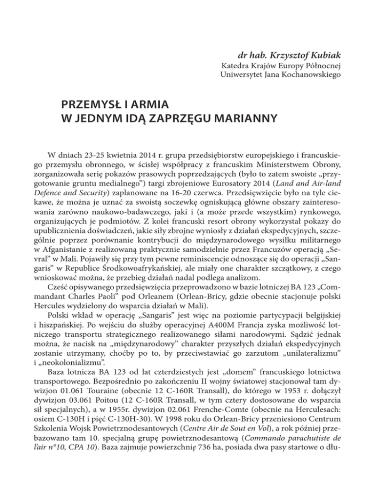 dr hab. Krzysztof Kubiak Katedra Krajów Europy Północnej Uniwersytet Jana Kochanowskiego PRZEMYSŁ I ARMIA W JEDNYM IDĄ ZAPRZĘGU MARIANNY W dniach 23-25 kwietnia 2014 r. grupa przedsiębiorstw europejskiego i francuskiego przemysłu obronnego, w ścisłej współpracy z francuskim Ministerstwem Obrony, zorganizowała serię pokazów prasowych poprzedzających (było to zatem swoiste „przygotowanie gruntu medialnego”) targi zbrojeniowe Eurosatory 2014 (Land and Air-land Defence and Security) zaplanowane na 16-20 czerwca. Przedsięwzięcie było na tyle ciekawe, że można je uznać za swoistą soczewkę ogniskującą główne obszary zainteresowania zarówno naukowo-badawczego, jaki i (a może przede wszystkim) rynkowego, organizujących je podmiotów. Z kolei francuski resort obrony wykorzystał pokazy do upublicznienia doświadczeń, jakie siły zbrojne wyniosły z działań ekspedycyjnych, szczególnie poprzez porównanie kontrybucji do międzynarodowego wysiłku militarnego w Afganistanie z realizowaną praktycznie samodzielnie przez Francuzów operacją „Sevral” w Mali. Pojawiły się przy tym pewne reminiscencje odnoszące się do operacji „Sangaris” w Republice Środkowoafrykańskiej, ale miały one charakter szczątkowy, z czego wnioskować można, że przebieg działań nadal podlega analizom. Cześć opisywanego przedsięwzięcia przeprowadzono w bazie lotniczej BA 123 „Commandant Charles Paoli” pod Orleanem (Orlean-Bricy, gdzie obecnie stacjonuje polski Hercules wydzielony do wsparcia działań w Mali). Polski wkład w operację „Sangaris” jest więc na poziomie partycypacji belgijskiej i hiszpańskiej. Po wejściu do służby operacyjnej A400M Francja zyska możliwość lotniczego transportu strategicznego realizowanego siłami narodowymi. Sądzić jednak można, że nacisk na „międzynarodowy” charakter przyszłych działań ekspedycyjnych zostanie utrzymany, choćby po to, by przeciwstawiać go zarzutom „unilateralizmu” i „neokolonializmu”. Baza lotnicza BA 123 od lat czterdziestych jest „domem” francuskiego lotnictwa transportowego. Bezpośrednio po zakończeniu II wojny światowej stacjonował tam dywizjon 01.061 Touraine (obecnie 12 C-160R Transall), do którego w 1953 r. dołączył dywizjon 03.061 Poitou (12 C-160R Transall, w tym cztery dostosowane do wsparcia sił specjalnych), a w 1955r. dywizjon 02.061 Frenche-Comte (obecnie na Herculesach: osiem C-130H i pięć C-130H-30). W 1998 roku do Orlean-Bricy przeniesiono Centrum Szkolenia Wojsk Powietrznodesantowych (Centre Air de Sout en Vol), a rok później przebazowano tam 10. specjalną grupę powietrznodesantową (Commando parachutiste de l’air n°10, CPA 10). Baza zajmuje powierzchnię 736 ha, posiada dwa pasy startowe o dłu- 302 Rocznik Bezpieczeństwa Międzynarodowego 2014, vol. 8, nr 2 Zdjęcie 1. Polski Hercules w Bazie Lotniczej „Commandant Charles Paoli” w Orlean-Bricy. Źródło: opracowanie własne. Zdjęcie 2. Samolot Airbus A400M Orlean-Bricy. Źródło: opracowanie własne. Recenzje i omówienia 303 gości 2 400 m, strefę lądowania spadochroniarzy o długości 1 000 m, 73 miejsca postojowe dla samolotów oraz łącznie 178 budynków o powierzchni 115 000 m2. Jej personel to 1 900 żołnierzy oraz pracowników wojska. W związku z przygotowaniami do wprowadzenia do operacyjnej eksploatacji samolotu Airbus A400M Orlean-Bricy wybrano na swoisty francuski „hub” nowej maszyny transportowej. Samolot A400M to nowa jakość we francuskim lotnictwie transportowym przekładająca się na skokowy wzrost zdolności Paryża do prowadzenia projekcji siły w wymiarze ponadregionalnym. Dla Francji, państwa posiadającego rozległą „strefę szczególnego zainteresowania”, jest to czynnik trudny do przecenienia. Zdjęcie ukazuje ponadto grubość betonowej nawierzchni niezbędnej do pełnego bezpieczeństwa i wysokiego poziomu komfortu przy operowaniu tą ciężką maszyną (masa własna 70 000 kg, całkowita masa startowa 141 000 kg, masa do lądowania 114 000 kg). Baza została gruntownie zmodernizowana kosztem kilkudziesięciu milionów euro. Dość powiedzieć, że tylko nowe bloki generatorów prądotwórczych oraz wymiana sieci elektrycznej kosztowały 7,3 mln euro, nowoczesna wieża kontrolna 6,9 mln euro, zaś wzmocnienie pasa i miejsc postojowych 25,9 mln euro. Najważniejszą inwestycją było jednak wzniesienie kompleksu symulatorów przeznaczonych do szkolenia zarówno pilotów, jak i mechaników oraz – co stanowi nową jakość – specjalistów załadunku (zwanych „cargo-masters”). Ów kompleks treningowy, którego „jądrem” są urządzenia produkcji Thalesa, czyni z bazy lotniczej BA 123 jeden z zasadniczych elementów wsparcia eksploatacyjnego A400M. Wizytę w Orlean-Bricy uzupełniła statyczna prezentacja nowej europejskiej maszyny transportowej. Nie ulega wątpliwości, że nowy, przeznaczony do zastosowań wojskowych, transportowy samolot Airbusa generuje nową jakość, a powodzenie jego wdrażania gruntownie zmieni sytuację użytkowników tych maszyn w kwestii lotniczego transportu strategicznego na czas co najmniej pół wieku. Francuzi nie ukrywali przy tym, że brak wystarczających zdolności w zakresie przerzutu wojsk i sprzętu drogą powietrzną na znaczne odległości stanowi istotne ograniczenie w zakresie projekcji siły w rejonach uważanych przez Paryż za swój obszar „szczególnego zainteresowania”. Dowiodły tego z całą wyrazistością operacje „Serval” i „Sangaris”, kiedy to ważne elementy działań przerzutowych realizowały C-17 w barwach amerykańskich, brytyjskich, a nawet kanadyjskich. Nie może w tym kontekście dziwić, że jednym z elementów certyfikacji A400 było lądowanie w Bamako, gdyż to działania ekspedycyjne w Afryce będą istotną częścią „operacyjnego życia” maszyn wchodzących w skład Armée de l’Air. Niejako „przy okazji”, w cieniu potężnego kadłuba A400M, go
