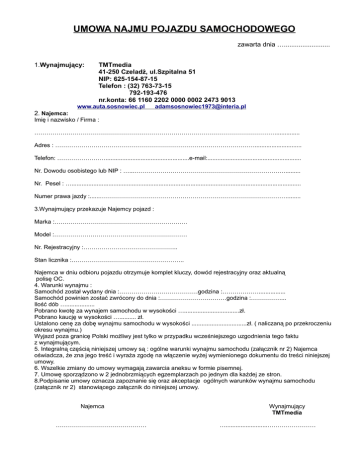 UMOWA NAJMU POJAZDU SAMOCHODOWEGO zawarta dnia …......................... 1.Wynajmujący: TMTmedia 41-250 Czeladź, ul.Szpitalna 51 NIP: 625-154-87-15 Telefon : (32) 763-73-15 792-193-476 nr.konta: 66 1160 2202 0000 0002 2473 9013 www.auta.sosnowiec.pl [email protected] 2. Najemca: Imię i nazwisko / Firma : ………………………………………………………………………………………………………….............. Adres : ………………………………………………………………………………………............................ Telefon: ……………………..................................................e-mail:........................................................ Nr. Dowodu osobistego lub NIP : …...…………………………………………………………………......... Nr. Pesel : …......................................................................................................................................... Numer prawa jazdy :......…………………………………………………………………………………........ 3.Wynajmujący przekazuje Najemcy pojazd : Marka :………………………………………………………… Model :………………………………………………………… Nr. Rejestracyjny :……………………………………….. Stan licznika :……………………………………………….. Najemca w dniu odbioru pojazdu otrzymuje komplet kluczy, dowód rejestracyjny oraz aktualną polisę OC. 4. Warunki wynajmu : Samochód został wydany dnia :…………………………………godzina :………………................ Samochód powinien zostać zwrócony do dnia :……………………………godzina :……………... Ilość dób …................. Pobrano kwotę za wynajem samochodu w wysokości ….................................zł. Pobrano kaucję w wysokości ….......... zł. Ustalono cenę za dobę wynajmu samochodu w wysokości .................................zł. ( naliczaną po przekroczeniu okresu wynajmu.) Wyjazd poza granicę Polski możliwy jest tylko w przypadku wcześniejszego uzgodnienia tego faktu z wynajmującym. 5. Integralną częścią niniejszej umowy są : ogólne warunki wynajmu samochodu (załącznik nr 2) Najemca oświadcza, że zna jego treść i wyraża zgodę na włączenie wyżej wymienionego dokumentu do treści niniejszej umowy. 6. Wszelkie zmiany do umowy wymagają zawarcia aneksu w formie pisemnej. 7. Umowę sporządzono w 2 jednobrzmiących egzemplarzach po jednym dla każdej ze stron. 8.Podpisanie umowy oznacza zapoznanie się oraz akceptacje ogólnych warunków wynajmu samochodu (załącznik nr 2) stanowiącego załącznik do niniejszej umowy. Najemca ……………………………………… Wynajmujący TMTmedia ….........................…………………… Załącznik do UMOWY NAJMU POJAZDU SAMOCHODOWEGO nr.2 REGULAMIN OGÓLNE WARUNKI WYNAJMU SAMOCHODU 1. 2. Niniejsze Ogólne Warunki Wynajmu Samochodu określają warunki oddania do używania Najemcy samochodu przez Wynajmującego. Najemca gwarantuje, że: -podane przez niego dane są zgodne z prawdą, - posiada pełną zdolność do czynności prawnych, -posiada niezbędne uprawnienia pozwalające na kierowanie pojazdem, a w szczególności, iż nie jest pozbawiony mocą orzeczenia kompetentnego organu, prawa kierowania Pojazdem Mechanicznym, -nie toczy się przeciw niemu żadne postępowanie, które mogłoby doprowadzić do pozbawienia go uprawnienia do kierowania pojazdem. 3. Czas trwania umowy : Umowa zostaje zawarta na czas określony, każdorazowo w niej wskazany. Najemca jest zobowiązany zwrócić pojazd w dniu i o godzinie określonymi w umowie. W przypadku braku zwrotu pojazdu w terminie określonym w umowie, najemca zobowiązuje się zapłacić ustalone w umowie wynagrodzenie za każdą rozpoczętą dobę wynajmu poza terminem określonym w umowie oraz karę umowną w wysokości potrójnej stawki dziennej brutto za każdy rozpoczęty dzień opóźnienia. 4. Zapłata : W dniu podpisania umowy najmu Najemca jest zobowiązany zapłacić wynagrodzenie Wynajmującemu za okres wynajmu uwidoczniony w umowie. W szczególnych przypadkach strony mogą ustalić inne zasady i terminy płatności. W przypadku długoterminowych umów płatność za każdy rozpoczęty miesiąc następuje z góry do 10 – go dnia rozpoczętego miesiąca, brak wpłaty rozwiązuje natychmiast umowę. Wynagrodzenie obejmuje należny podatek VAT. W dniu zwrotu pojazdu Najemca jest zobowiązany zapłacić ewentualne należności, wynikające z postanowień niniejszej umowy. 5. Odbiór samochodu : Najemca otrzymuje pojazd opisany w umowie najmu w dobrym stanie technicznym. Zbiornik paliwa był zatankowany do pełna i tak ma wrócić. W przypadku gdy najemca odda pojazd ze stanem paliwa innym, zobowiązuje się do zapłaty dwukrotnej wartości brakującego paliwa. 6. Obowiązki Najemcy. Najemca zobowiązuje się: -do używania pojazdu zgodnie z jego przeznaczeniem i utrzymania samochodu w czystości, -do używania pojazdu tylko na terytorium Polski, -kierować pojazdem osobiście, nie przekazywać pojazdu w podnajem lub bezpłatne użytkowanie osobom trzecim, -nie dokonywać w pojeździe żadnych zmian, -nie wykonywać samodzielnie żadnych napraw, a w przypadku awarii powiadomić niezwłocznie Wynajmującego, -niewykorzystywania pojazdu w jakichkolwiek zawodach sportowych, rajdach, ani w żadnych kampaniach wyborczych, -niezwłocznego powiadomienia Wynajmującego o każdym zdarzeniu drogowym (kolizja, wypadek, kradzież ), oraz zawiadomić na miejscu wypadku Policję w celu sporządzenia stosownego protokołu odnośnie okoliczności zajścia zdarzenia, -do wykonywania własnym kosztem i staraniem obsługi codziennej samochodu tj. sprawdzenie i uzupełnienie oleju silnikowego, płynu chłodzącego, płynu hamulcowego, sprawdzania działania świate