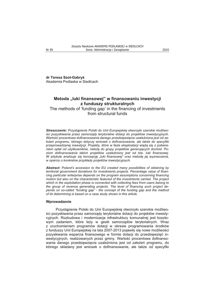 Nr 85 Zeszyty Naukowe AKADEMII PODLASKIEJ w SIEDLCACH Seria: Administracja i Zarz dzanie 2010 dr Teresa Szot-Gabry Akademia Podlaska w Siedlcach Metoda „luki finansowej” w finansowaniu inwestycji z funduszy strukturalnych The methods of ‘funding gap’ in the financing of investments from structural funds Streszczenie: Przyst pienie Polski do Unii Europejskiej otworzy!o szerokie mo"liwo#ci pozyskiwania przez samorz dy terytorialne dotacji do projektów inwestycyjnych. Warto#$ procentowa dofinansowania danego przedsi%wzi%cia uzale"niona jest od za!o"e& programu, którego dotyczy wniosek o dofinansowanie, ale tak"e do specyfiki przeprowadzanej inwestycji. Projekty, które w fazie eksploatacji wi " si% z pobieraniem op!at od u"ytkowników, nale" do grupy projektów generuj cych dochód. Poziom dofinansowania takich projektów uzale"niony jest od tzw. luki finansowej. W artykule analizuje si% koncepcj% „luki finansowej” oraz metod% jej wyznaczania, w oparciu o konkretne przyk!ady projektów inwestycyjnych. Abstract: Poland’s accession to the EU created many possibilities of obtaining by territorial government donations for investments projects. Percentage value of financing particular enterprise depends on the program assumptions concerning financing motion but also on the characteristic featured of the investments carried. The project which in the exploitation phase is connected with collecting fees from users belong to the group of revenue generating projects. The level of financing such project depends on so-called “funding gap” - the concept of the funding gap and the method of its determining is based on a case study shown in this article. Wprowadzenie Przyst pienie Polski do Unii Europejskiej otworzy!o szerokie mo"liwo#ci pozyskiwania przez samorz dy terytorialne dotacji do projektów inwestycyjnych. Rozbudowa i modernizacja infrastruktury komunalnej jest kosztowym zadaniem, które le"y w gestii samorz dów terytorialnych. Wraz z uruchomieniem programów dotacji w okresie programowania #rodków z funduszy Unii Europejskiej na lata 2007-2013 pojawi!y si$ nowe mo"liwo#ci pozyskiwania wsparcia finansowego w formie dotacji do przedsi$wzi$% inwestycyjnych, realizowanych przez gminy. Warto#% procentowa dofinansowania danego przedsi$wzi$cia uzale"niona jest od za!o"e& programu, do którego sk!adany jest wniosek o dofinansowanie, ale tak"e od specyfiki 102 T. Szot-Gabry! przeprowadzanej inwestycji. Projekty, które w fazie eksploatacji wi " si$ z pobieraniem op!at od u"ytkowników, nale" do grupy projektów generuj cych dochód. Poziom dofinansowania takich projektów uzale"niony jest od tzw. luki finansowej. W artykule analizuje si$ koncepcj$ „luki finansowej” oraz metod$ jej wyznaczania, w oparciu o konkretne przyk!ady projektów inwestycyjnych. Na tej podstawie ukazana jest mo"liwo#% kszta!towania polityki przez samorz d terytorialny w odniesieniu do struktury finansowania nak!adów inwestycyjnych, które uzale"nione s od przyj$tego modelu finansowania us!ug komunalnych, #wiadczonych poprzez wykorzystanie powsta!ej infrastruktury w okresie eksploatacyjnym. Inwestycje infrastrukturalne i rola funduszy Unii Europejskiej w ich finansowaniu Celem funkcjonowania samorz du terytorialnego jest zaspokajanie zbiorowych potrzeb wspólnoty samorz dowej. Gmina jako jednostka samorz du terytorialnego odpowiada m.in. za organizacj$ gospodarki komunalnej i budow$ odpowiedniej infrastruktury, co poci ga za sob konieczno#% budowy kosztownej infrastruktury. Szczegó!owy zakres zada& gminy okre#la artyku! 7 ustawy o samorz dzie gminnym1. W artykule tym stwierdza si$, "e Zaspokajanie zbiorowych potrzeb wspólnoty nale"y do zada& w!asnych gminy. W szczególno#ci zadania w!asne obejmuj sprawy: 1) !adu przestrzennego, gospodarki nieruchomo#ciami, ochrony #rodowiska i przyrody oraz gospodarki wodnej, 2) gminnych dróg, ulic, mostów, placów oraz organizacji ruchu drogowego, 3) wodoci gów i zaopatrzenia w wod%, kanalizacji, usuwania i oczyszczania #cieków komunalnych, utrzymania czysto#ci i porz dku oraz urz dze& sanitarnych, wysypisk i unieszkodliwiania odpadów komunalnych, zaopatrzenia w energi% elektryczn i ciepln oraz gaz, (…) 8) edukacji publicznej 9) kultury, w tym bibliotek gminnych i instytucji kultury oraz ochrony zabytków i opieki nad zabytkami 2. Zatem gmina odpowiada za szereg zada&, w tym takich, które wymagaj budowy i utrzymania odpowiedniej infrastruktury. Polityka inwestycyjna jednostki samorz du terytorialnego polega na #wiadomym i celowym wyborze przedsi$wzi$% inwestycyjnych wed!ug ustalonych kryteriów oraz odpowiednim doborze 'róde! ich sfinansowania. W zale"no#ci od przyj$tych kryteriów, mo"na wyró"ni% ró"ne kategorie projektów inwestycyjnych, np.: Projekty dotycz ce: • infrastruktury technicznej i komunalnej: drogi, oczyszczalnie #cieków, kanalizacja, wodoci gi, wysypiska #mieci; 1 2 Ustawa z dnia 8 marca 1990 roku O samorz dzie gminnym, Dz.U. 2001 nr 142 poz. 1591. W ustawie wymienia si$ 20 kategorii zada&. Seria: Administracja i Zarz dzanie (12)2010 ZN nr 85 Metoda „luki finansowej” w finansowaniu inwestycji z funduszy strukturalnych 103 • infrastruktury spo!ecznej: szko!y, sale gimnastyczne, domy kultury, domy opieki spo!ecznej, szpitale. Z uwagi na zakres rzeczowy i charakter powsta!ej infrastruktury mog by% to projekty typu: • budowa nowej infrastruktury; • rozbudowa istniej cej infrastruktury; • odtworzeniowe, modernizacyjne; • remonty, adaptacje, rewitalizacja. Jednak"e z uwagi na kryteria stosowane w programach dotacji z funduszy strukturalnych Unii Europejskiej istotny jest podzia! projektów na: • generuj ce przychody, poprzez pobieranie op!at za us!ugi od u"ytkowników; • w sferze us!ug nieodp!atnych; • generuj ce dochody – projekty, w których ma miejsce nadwy"ka przychodów nad kosztami eksploatacyjnymi. Fundusze strukturalne Unii Europejskiej s obecnie w Polsce istotnym 'ród!em przyspieszenia procesów inwestycyjnych w gm