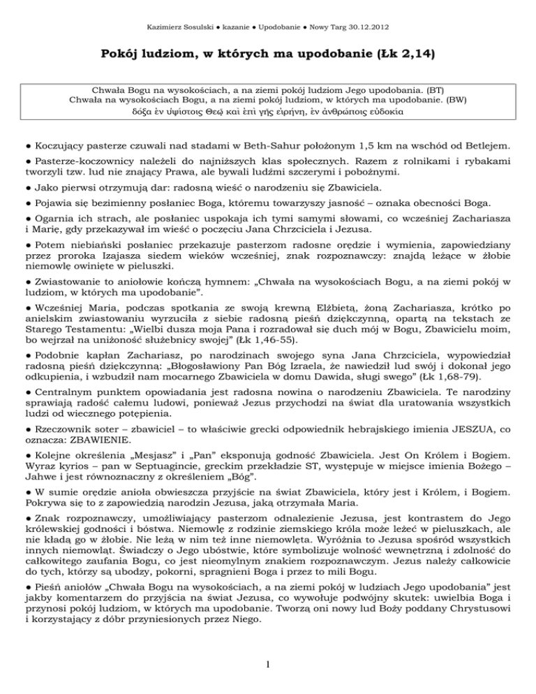 Kazimierz Sosulski ● kazanie ● Upodobanie ● Nowy Targ 30.12.2012 Pokój ludziom, w których ma upodobanie (Łk 2,14) Chwała Bogu na wysokościach, a na ziemi pokój ludziom Jego upodobania. (BT) Chwała na wysokościach Bogu, a na ziemi pokój ludziom, w których ma upodobanie. (BW) δόξα εν υψίστοις Θεω καὶ επὶ γης ειρήνη, εν ανθρώποις ευδοκία ● Koczujący pasterze czuwali nad stadami w Beth-Sahur położonym 1,5 km na wschód od Betlejem. ● Pasterze-koczownicy należeli do najniższych klas społecznych. Razem z rolnikami i rybakami tworzyli tzw. lud nie znający Prawa, ale bywali ludźmi szczerymi i pobożnymi. ● Jako pierwsi otrzymują dar: radosną wieść o narodzeniu się Zbawiciela. ● Pojawia się bezimienny posłaniec Boga, któremu towarzyszy jasność – oznaka obecności Boga. ● Ogarnia ich strach, ale posłaniec uspokaja ich tymi samymi słowami, co wcześniej Zachariasza i Marię, gdy przekazywał im wieść o poczęciu Jana Chrzciciela i Jezusa. ● Potem niebiański posłaniec przekazuje pasterzom radosne orędzie i wymienia, zapowiedziany przez proroka Izajasza siedem wieków wcześniej, znak rozpoznawczy: znajdą leżące w żłobie niemowlę owinięte w pieluszki. ● Zwiastowanie to aniołowie kończą hymnem: „Chwała na wysokościach Bogu, a na ziemi pokój w ludziom, w których ma upodobanie”. ● Wcześniej Maria, podczas spotkania ze swoją krewną Elżbietą, żoną Zachariasza, krótko po anielskim zwiastowaniu wyrzuciła z siebie radosną pieśń dziękczynną, opartą na tekstach ze Starego Testamentu: „Wielbi dusza moja Pana i rozradował się duch mój w Bogu, Zbawicielu moim, bo wejrzał na uniżoność służebnicy swojej” (Łk 1,46-55). ● Podobnie kapłan Zachariasz, po narodzinach swojego syna Jana Chrzciciela, wypowiedział radosną pieśń dziękczynną: „Błogosławiony Pan Bóg Izraela, że nawiedził lud swój i dokonał jego odkupienia, i wzbudził nam mocarnego Zbawiciela w domu Dawida, sługi swego” (Łk 1,68-79). ● Centralnym punktem opowiadania jest radosna nowina o narodzeniu Zbawiciela. Te narodziny sprawiają radość całemu ludowi, ponieważ Jezus przychodzi na świat dla uratowania wszystkich ludzi od wiecznego potępienia. ● Rzeczownik soter – zbawiciel – to właściwie grecki odpowiednik hebrajskiego imienia JESZUA, co oznacza: ZBAWIENIE. ● Kolejne określenia „Mesjasz” i „Pan” eksponują godność Zbawiciela. Jest On Królem i Bogiem. Wyraz kyrios – pan w Septuagincie, greckim przekładzie ST, występuje w miejsce imienia Bożego – Jahwe i jest równoznaczny z określeniem „Bóg”. ● W sumie orędzie anioła obwieszcza przyjście na świat Zbawiciela, który jest i Królem, i Bogiem. Pokrywa się to z zapowiedzią narodzin Jezusa, jaką otrzymała Maria. ● Znak rozpoznawczy, umożliwiający pasterzom odnalezienie Jezusa, jest kontrastem do Jego królewskiej godności i bóstwa. Niemowlę z rodzinie ziemskiego króla może leżeć w pieluszkach, ale nie kładą go w żłobie. Nie leżą w nim też inne niemowlęta. Wyróżnia to Jezusa spośród wszystkich innych niemowląt. Świadczy o Jego ubóstwie, które symbolizuje wolność wewnętrzną i zdolność do całkowitego zaufania Bogu, co jest nieomylnym znakiem rozpoznawczym. Jezus należy całkowicie do tych, którzy są ubodzy, pokorni, spragnieni Boga i przez to mili Bogu. ● Pieśń aniołów „Chwała Bogu na wysokościach, a na ziemi pokój w ludziach Jego upodobania” jest jakby komentarzem do przyjścia na świat Jezusa, co wywołuje podwójny skutek: uwielbia Boga i przynosi pokój ludziom, w których ma upodobanie. Tworzą oni nowy lud Boży poddany Chrystusowi i korzystający z dóbr przyniesionych przez Niego. 1 Kazimierz Sosulski ● kazanie ● Upodobanie ● Nowy Targ 30.12.2012 LUD ZIEMI Odpowiednik wyrażenia ʽam haʼárec, które w tekście hebrajskim występuje 75 razy. Za czasów Jezusa przywódcy religijni nadali mu pogardliwe znaczenie, lecz pierwotnie nie miało takiego wydźwięku. Termin ten „ściśle rzecz biorąc, odnosił się tylko do żonatych mężczyzn, którzy mieszkali na własnej ziemi i którym przysługiwała pełnia praw i obowiązków, w tym obowiązek służenia w wojsku, uczestniczenia w rozprawach sądowych oraz w świętach”. A zatem pierwotnie określenie to wyrażało szacunek. Wcale nie odnosiło się wyłącznie do niższych warstw społecznych czy biedoty. Kiedy Abraham ubiegał się o prawo własności do jaskini Machpela, układał się z Hetytami, nazwanymi „ludem onej ziemi” (Rdz 23,7.13 BG). Faraon, zwracając się do Mojżesza i Aarona, nazwał Izraelitów żyjących w Goszen „ludem tej ziemi” (Wj 5,5). Określenia tego użyto w odniesieniu do wszystkich mieszkańców Kanaanu (Lb 14,9). Jednak z biegiem czasu żydowscy przywódcy religijni zaczęli pogardliwie określać Żydów i nieŻydów, którzy nie byli obeznani z Prawem, a zwłaszcza nie znali lub nie przestrzegali drobiazgowych i obszernych już wtedy tradycji rabinicznych (Mt 15,1.2). O pogardliwym stosunku do takich ludzi świadczy wypowiedź faryzeuszy: „Ten tłum nie znający Prawa to ludzie przeklęci” (J 7,49). Tymczasem Jezus wyjaśnił, że ‛przyszedł wezwać grzeszników’, i szczerze interesował się ludźmi, którzy byli ‛porzuceni niczym owce bez pasterza’ (Mt 9,13.36). Dz 13,22 A gdy go odrzucił, powołał im na króla Dawida i wystawił mu świadectwo w słowach: Znalazłem Dawida, syna Jessego, męża według serca mego, który wykona całkowicie wolę moją. (BW) (BP) Znalazłem Dawida, syna Jessego, człowieka według serca mego, który spełni we wszystkim moją wolę. (BT) Znalazłem Dawida, syna Jessego, człowieka po mojej myśli, który we wszystkim wypełni moją wolę. (BWP) Znalazłem Dawida, syna Jessego; jest to człowiek, który zna moje myśli i we wszystkim będzie wypełniał moją wolę. Dz 15,8 Bóg t