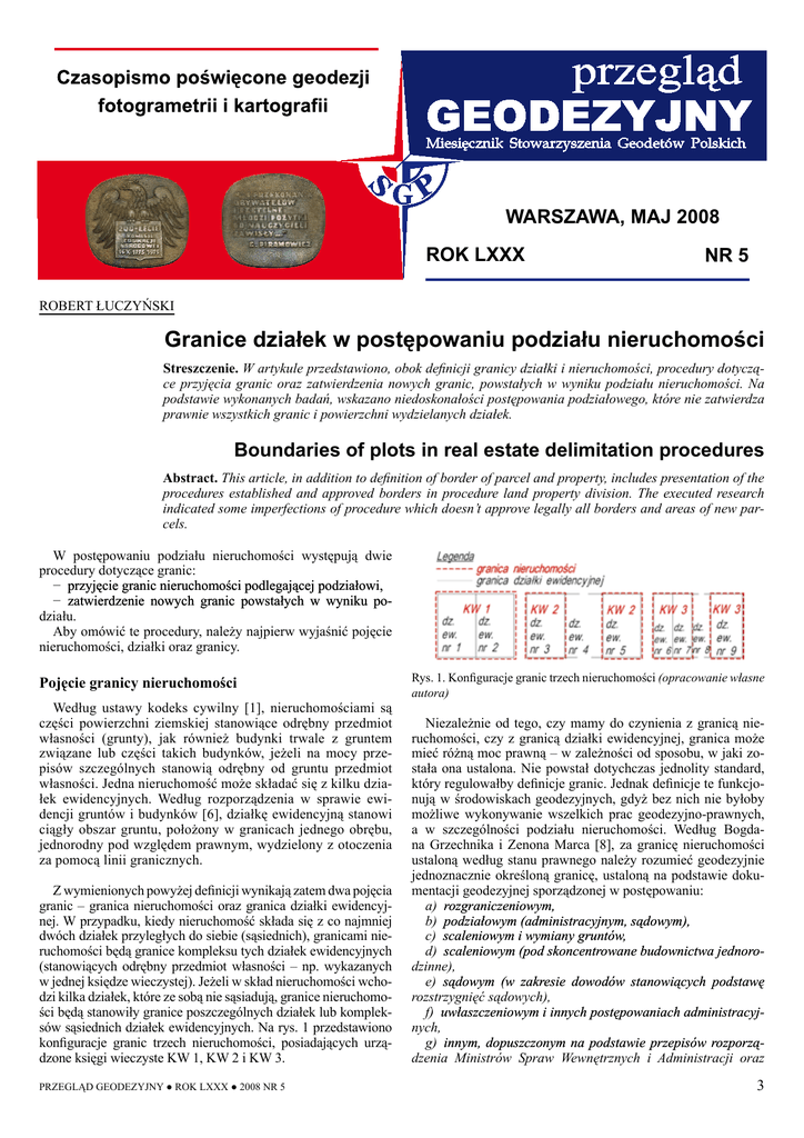 WARSZAWA, MAJ 2008 ROK LXXX NR 5 ROBERT ŁUCZYŃSKI Granice działek w postępowaniu podziału nieruchomości Streszczenie. W artykule przedstawiono, obok definicji granicy działki i nieruchomości, procedury dotyczące przyjęcia granic oraz zatwierdzenia nowych granic, powstałych w wyniku podziału nieruchomości. Na podstawie wykonanych badań, wskazano niedoskonałości postępowania podziałowego, które nie zatwierdza prawnie wszystkich granic i powierzchni wydzielanych działek. Boundaries of plots in real estate delimitation procedures Abstract. This article, in addition to definition of border of parcel and property, includes presentation of the procedures established and approved borders in procedure land property division. The executed research indicated some imperfections of procedure which doesn’t approve legally all borders and areas of new parcels. W postępowaniu podziału nieruchomości występują dwie procedury dotyczące granic: − ������������������������������������������������������� przyjęcie granic nieruchomości podlegającej podziałowi, − ��������������������������������������������������� zatwierdzenie nowych granic powstałych w wyniku podziału. Aby omówić te procedury, należy najpierw wyjaśnić pojęcie nieruchomości, działki oraz granicy. Pojęcie granicy nieruchomości Według ustawy kodeks cywilny [1], nieruchomościami są części powierzchni ziemskiej stanowiące odrębny przedmiot własności (grunty), jak również budynki trwale z gruntem związane lub części takich budynków, jeżeli na mocy przepisów szczególnych stanowią odrębny od gruntu przedmiot własności. Jedna nieruchomość może składać się z kilku działek ewidencyjnych. Według rozporządzenia w sprawie ewidencji gruntów i budynków [6], działkę ewidencyjną stanowi ciągły obszar gruntu, położony w granicach jednego obrębu, jednorodny pod względem prawnym, wydzielony z otoczenia za pomocą linii granicznych. Z wymienionych powyżej definicji wynikają zatem dwa pojęcia granic – granica nieruchomości oraz granica działki ewidencyjnej. W przypadku, kiedy nieruchomość składa się z co najmniej dwóch działek przyległych do siebie (sąsiednich), granicami nieruchomości będą granice kompleksu tych działek ewidencyjnych (stanowiących odrębny przedmiot własności – np. wykazanych w jednej księdze wieczystej). Jeżeli w skład nieruchomości wchodzi kilka działek, które ze sobą nie sąsiadują, granice nieruchomości będą stanowiły granice poszczególnych działek lub kompleksów sąsiednich działek ewidencyjnych. Na rys. 1 przedstawiono konfiguracje granic trzech nieruchomości, posiadających urządzone księgi wieczyste KW 1, KW 2 i KW 3. PRZEGLĄD GEODEZYJNY ● ROK LXXX ● 2008 NR 5 Rys. 1. Konfiguracje granic trzech nieruchomości (opracowanie własne autora) Niezależnie od tego, czy mamy do czynienia z granicą nieruchomości, czy z granicą działki ewidencyjnej, granica może mieć różną moc prawną – w zależności od sposobu, w jaki została ona ustalona. Nie powstał dotychczas jednolity standard, który regulowałby definicje granic. Jednak definicje te funkcjonują w środowiskach geodezyjnych, gdyż bez nich nie byłoby możliwe wykonywanie wszelkich prac geodezyjno-prawnych, a w szczególności podziału nieruchomości. Według Bogdana Grzechnika i Zenona Marca [8], za granicę nieruchomości ustaloną według stanu prawnego należy rozumieć geodezyjnie jednoznacznie określoną granicę, ustaloną na podstawie dokumentacji geodezyjnej sporządzonej w postępowaniu: a) ������������������ rozgraniczeniowym, b) ������������ podziałowym ���������������������������� (administracyjnym, sądowym), c) ������������������������������ scaleniowym i wymiany gruntów, d) ������������ scaleniowym ���������������������������������������� (pod skoncentrowane budownictwa jednorodzinne), e) �������� sądowym (w ������������������������������������������ zakresie dowodów stanowiących podstawę rozstrzygnięć sądowych), f) ������������������������������������������������������ uwłaszczeniowym i innych postępowaniach administracyjnych, g) ���������������������������������������������������� innym, dopuszczonym na podstawie przepisów rozporządzenia Ministrów Spraw Wewnętrznych i Administracji oraz Rolnictwa i Gospodarki Żywnościowej z 14 kwietnia 1999 r. w sprawie rozgraniczania nieruchomości, h) ������������������������������������������������������� w procesie zakładania i modernizacji ewidencji gruntów i budynków na podstawie rozporządzenia Ministrów Gospodarki Przestrzennej i Budownictwa oraz Rolnictwa i Gospodarki Żywnościowej z 17 grudnia 1996 r. w sprawie ewidencji gruntów i budynków. Można wyróżnić następujące rodzaje granic: − ��������������������������������������� granice ustalone według stanu prawnego, − ������������������������������������
