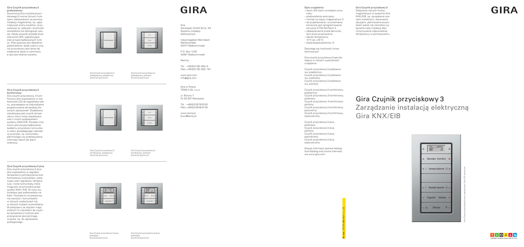 Industriegebiet Mermbach Dahlienstraße 42477 Radevormwald P.O. Box 12 20 42461 Radevormwald Niemcy Tel. +49 (0) 21 95 - 602 - 0 Faks +49 (0) 21 95 - 602 - 191 Gira Czujnik przyciskowy 3 podstawowy, pojedynczy Gira E 22 aluminium Gira Czujnik przyciskowy 3 podstawowy, potrójny Gira E 22 aluminium www.gira.com info @ gira.com Gira w Polsce TEMA 2 Sp. z.o.o. Gira Czujnik przyciskowy 3 komfortowy Gira czujnik przyciskowy 3 komfortowy jest wyposażony w trójkolorowe LED do sygnalizacji stanu, pozwalające na indywidualne programowanie do bardziej złożonych zastosowań. Dodatkowo wbudowany jest czujnik temperatury, który może współpracować z innymi podzespołami systemu KNX / EIB. Ponadto możliwym jest przyporządkowanie każdemu przyciskowi komunikatu stanu posiadającego nadrzędny priorytet, np. komunikatu alarmowego czy przekazywania informacji takich jak alarm wiatrowy. ul. Boryny 7 PL-02-257 Warszawa Tel. +48 (0) 2 28 78 03 53 Faks +48 (0) 2 28 46 47 45 www.tema.pl [email protected] Zastrzega się możliwość zmian technicznych Gira czujnik przyciskowy 3 jest dostępny w różnych wykonaniach urządzenia: Czujnik przyciskowy 3 podstawowy, pojedynczy Czujnik przyciskowy 3 podstawowy, podwójny Czujnik przyciskowy 3 podstawowy, potrójny Czujnik przyciskowy 3 komfortowy, pojedynczy Czujnik przyciskowy 3 komfortowy, podwójny Czujnik przyciskowy 3 komfortowy potrójny Czujnik przyciskowy 3 komfortowy, poczwórny Czujnik przyciskowy 3 komfortowy, sześciokrotny Czujnik przyciskowy 3 podwójny Czujnik przyciskowy 3 potrójny Czujnik przyciskowy 3 pięciokrotny Czujnik przyciskowy 3 sześciokrotny Gira Czujnik przyciskowy 3 komfortowy, pojedynczy Gira E 22 aluminium Gira Czujnik przyciskowy 3 komfortowy, potrójny Gira E 22 aluminium Gira Czujnik przyciskowy 3 plus, podwójny Gira E 22 aluminium Gira Czujnik przyciskowy 3 plus, podwójny Gira E 22 aluminium Gira Czujnik przyciskowy 3 plus Gira czujnik przyciskowy 3 plus jest wyposażony w regulator temperatury pomieszczenia oraz kontrastowy wyświetlacz, pokazujący stan regulatora, temperaturę i różne komunikaty, które mogą być otrzymywane przez system KNX / EIB. W nocy wyświetlacz jest podświetlany na biało. Pozwala on na pokazywanie wartości i komunikatów w różnych wielkościach lub w różnych trybach wyświetlania. W połączeniu ze złączem magistralnym 3 z zaciskami do czujnika temperatury możliwe jest przyłączenie zewnętrznego czujnika, np. do ogrzewania podłogowego. Gira Czujnik przyciskowy 3 Załączanie różnych funkcji magistralnych w systemie Gira KNX / EIB, np. zarządzanie scenami świetlnymi, sterowanie żaluzjami, alarmowanie przyciskiem paniki lub centralne wyłączanie całej instalacji albo utrzymywanie odpowiedniej temperatury w pomieszczeniu. Gira Czujnik przyciskowy 3 Zarządzanie instalacją elektryczną Gira KNX / EIB plus, plus, plus, plus, Więcej informacji zawiera katalog Gira Katalog oraz strona internetowa www.gira.com Gira Czujnik przyciskowy 3 plus, pięciokrotny, Gira E 22 aluminium Gira Giersiepen GmbH & Co. KG Systemy instalacji elektrycznych Opis urządzenia – dwie LED stanu na każdym przycisku – podświetlenie pola opisu – montaż na złączu magistralnym 3 – do projektowania i uruchamiania konieczne jest oprogramowanie od wersji ETS3.0d Patch A – zabezpieczenie przed demontażem przez przykręcenie – zakres temperatury: -5 °C do +45 °C – klasa bezpieczeństwa: III Nr kat. 17171 85 04/11 x. 22 Gira Czujnik przyciskowy 3 podstawowy Za pomocą Gira czujnika przyciskowego 3 można różnymi funkcjami realizowanymi za pomocą instalacji magistralnej, np. zapamiętywać sceny świetlne i przywoływać je, załączać i ściemniać oświetlenie lub obsługiwać żaluzje. Każdy przycisk posiada dwie czerwone LED, sygnalizujące stan przyporządkowanych funkcji. Pole opisowe jest delikatnie podświetlone, dzięki czemu czujnik przyciskowy jest łatwy do znalezienia także w ciemności, a opis jest dobrze czytelny. Odmiany stylistyczne System 55 Serwis wykonywania opisów Gira Dzięki serwisowi wykonywania opisów Gira można w Internecie w kilku krokach opracować opisy klawiszy czujnika przyciskowego 3 i je zamówić. Oprócz różnych typów i wielkości czcionek do wyboru są różne symbole, umożliwiające łatwe przyporządkowanie przyłączonych urządzeń. Po bezpłatnej rejestracji można zapisać projekty, aby potem je dalej edytować lub ponownie zamówić. www.marking.gira.com Gira Czujnik przyciskowy 3 potrójny, biały z połyskiem Gira E2, biały z połyskiem Gira Czujnik przyciskowy 3 potrójny, kolor aluminiowy Gira E2, kolor aluminiowy Gira Czujnik przyciskowy 3 potrójny, biały z połyskiem Gira Event Clear, zielony Gira Czujnik przyciskowy 3 potrójny, kremowy z połyskiem Gira Event Clear, piaskowy Szyldzik z opisem do klawiszy z osłoną z tworzywa sztucznego Do klawiszy z przezroczystą osłoną z termoplastu drukowane są białe szyldziki z opisem, odporne na działanie światła, nie pofałdowane i odporne na wpływy pogodowe. Można je projektować i zamawiać od razu w Internecie. Ponadto istnieje możliwość samodzielnego drukowania sporządzonych projektów. Gira Czujnik przyciskowy 3 potrójny, biały z połyskiem Gira Esprit, białe szkło Gira Czujnik przyciskowy 3 potrójny, antracytowy Gira Esprit, czarne szkło Gira Czujnik przyciskowy 3 plus, pięciokrotny, Gira E 22 stal szlachetna Odmiany wzornicze F100 Gira Czujnik przyciskowy 3 potrójny, biały z połyskiem Gira F100, biały z połyskiem Gira Czujnik przyciskowy 3 potrójny, kolor aluminiowy Gira Esprit, aluminium z drewnem orzechowym Gira Czujnik przyciskowy 3 potrójny, antracytowy Gira Esprit, aluminium czarne Gira Czujnik przyciskowy 3 potrójny, biały z połyskiem Gira Standard 55, biały z połyskiem Gira Czujnik przyciskowy 3 potrójny, kremowy z połyskiem Gira Standard 55, kremowy z połyskiem Gira Czujnik przyciskowy 3 potrójny, stal szlachetna z opisem wykonan