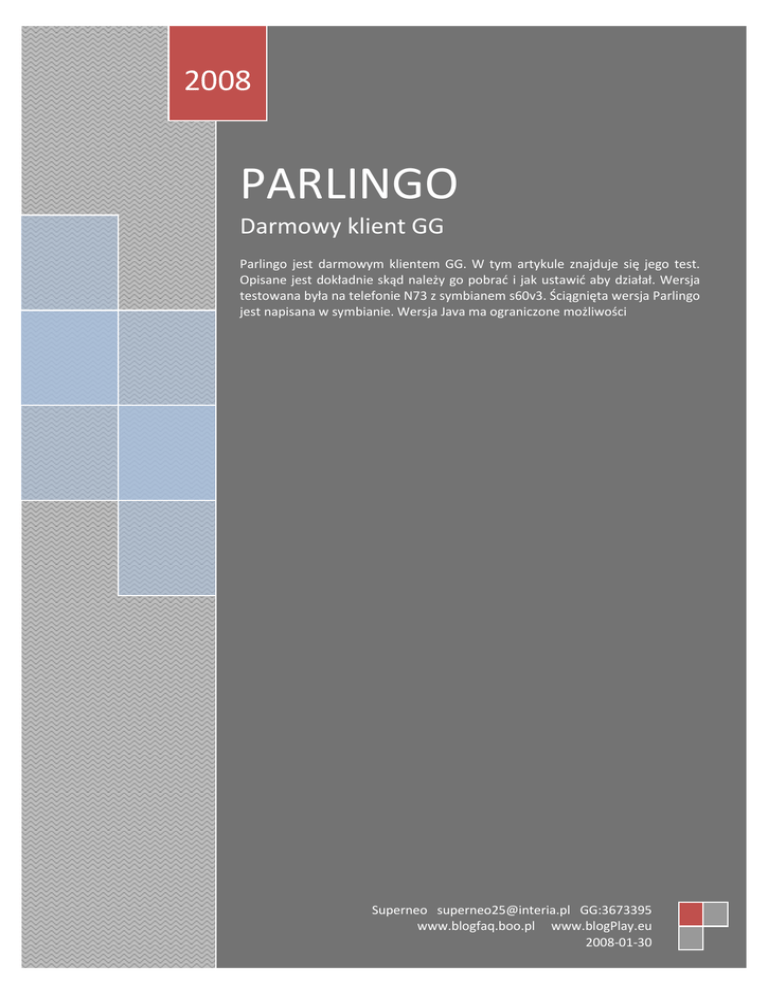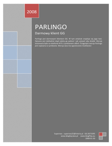 2008 PARLINGO Darmowy klient GG Parlingo jest darmowym klientem GG. W tym artykule znajduje się jego test. Opisane jest dokładnie skąd należy go pobrad i jak ustawid aby działał. Wersja testowana była na telefonie N73 z symbianem s60v3. Ściągnięta wersja Parlingo jest napisana w symbianie. Wersja Java ma ograniczone możliwości Superneo [email protected] GG:3673395 www.blogfaq.boo.pl www.blogPlay.eu 2008-01-30 STRONA DOMOWA PARLINGO Strona domowa Parlingo to www.parlingo.com Aby się zarejestrowad należy wejśd na stronę i po prawej stronie u góry nacisnąd „register”. Po naciśnięciu pojawia się okno gdzie należy wpisad mail i hasło. Nie trzeba potwierdzad to żadnym linkiem aktywacyjnym bo jak do tej pory żaden taki do mnie nie przyszedł a komunikator mi działa. Następnie wybieramy opcje „download”. Pojawia się nam kilka opcji: Windows PC download (2000 - XP - Vista) Windows Mobile download (2003 onwards) Symbian phone download (S60r3 - 9.1 - 9.2) Java download Mobile phone download (Windows - Symbian - Java) Ja wybrałem tą ostatnią opcję, ponieważ można wysład sobie ze strony smsa z linkiem do pobrania aplikacji. Wtedy urządzenie samo wybierze najlepszą dla siebie wersje programu. Link przyszedł mi od razu. Nie musiałem czekad nawet minuty. POBIERANIE I INSTALCJA Aby pobrad należy kliknąd w link, który dostało się smsem. Po zainstalowaniu w telefonie pojawi się nowa ikona. Uruchamiamy program jak każdy inny czyli naciskamy na niego. W niektórych telefonach program zapyta się z jakiego profilu internetowego ma korzystad. Należy pamiętad, że w Play komunikatory działają pod profilem „Internet” i dlatego ten należy wybrad Parlingo obsługuje kilka serwisów. Oprócz kilku zagranicznych (Windows Live Messenger, Yahoo Messenger, AOL Instant Messenger i AOL ICQ) obsługuje także polskie (Google Talk/Jabber oraz wspomniany wcześniej Gadu – Gadu). Ponieważ interesuje nas ten ostatni serwis należy najechad na niego i nacisnąd „OK.” Serwis zostanie dodany do głównego programu Parlingo. Można dodad kilka serwisów i równolegle z nich korzystad. To bardzo ułatwia. Mam nadzieje, że w przyszłości program będzie rozbudowywany i będą dodawane kolejne serwisy. W Polsce jest jeszcze dużo komunikatorów. Po wybraniu serwisu i wpisaniu danych z rejestracji łączymy się z Gadu – Gadu. Należy w opcjach wybrad status „połączony”. Jak już uda się wam połączyd z serwisem to główne okno powinno wyglądad mniej więcej tak. Oczywiście „NEO” to mój nick więc w tym miejscu może byd coś zupełnie innego. DZIAŁANIE Po zainstalowaniu i zalogowaniu się do Gadu – Gadu program zapyta się czy pobrad kontakty z serwera. Minusem jest to, że przy każdym włączeniu programu program za każdym razem pobiera kontakty. Szkoda, że program nie zapamiętuje kontaktów. Widad opis. A tak wygląda opcja rozmowy. Bez problemu można korzystad ze słownikowego pisania. Okna są czytelne i wszystko dokładnie widad Gdy jesteśmy na głównym oknie programu i ktoś do nas napisze to dostaniemy informacje dźwiękiem (głośnośd możemy ustawid w opcjach) oraz informacje, że ktoś napisał. Ciekawą opcją w programie jest przesyłanie dźwięku i zdjęd z poziomu komunikatora. Nagrywamy dźwięk lub robimy zdjęcie a potem program wysyła to na swój serwer i drugiej osobie daje link do dźwięku lub zdjęcia. Bardzo fajna sprawa. PODSUMOWANIE Parlingo jest bardzo ciekawym klientem GG. Nie ukrywam, że dla mnie najlepszym z jakim miałem stycznośd. Mam nadzieje, że systematycznie będzie rozbudowywany i będą dodawane coraz to ciekawsze i nowatorskie opcje. Minusem jest, że za każdym razem program pobiera od nowa kontakty. Powinna byd opcja synchronizacji z serwerem. Digitally signed by Łukasz Dzierżak DN: cn=Łukasz Dzierżak, o, ou=blogplay.eu, [email protected], c=PL Date: 2008.02.17 13:32:47 +01'00'