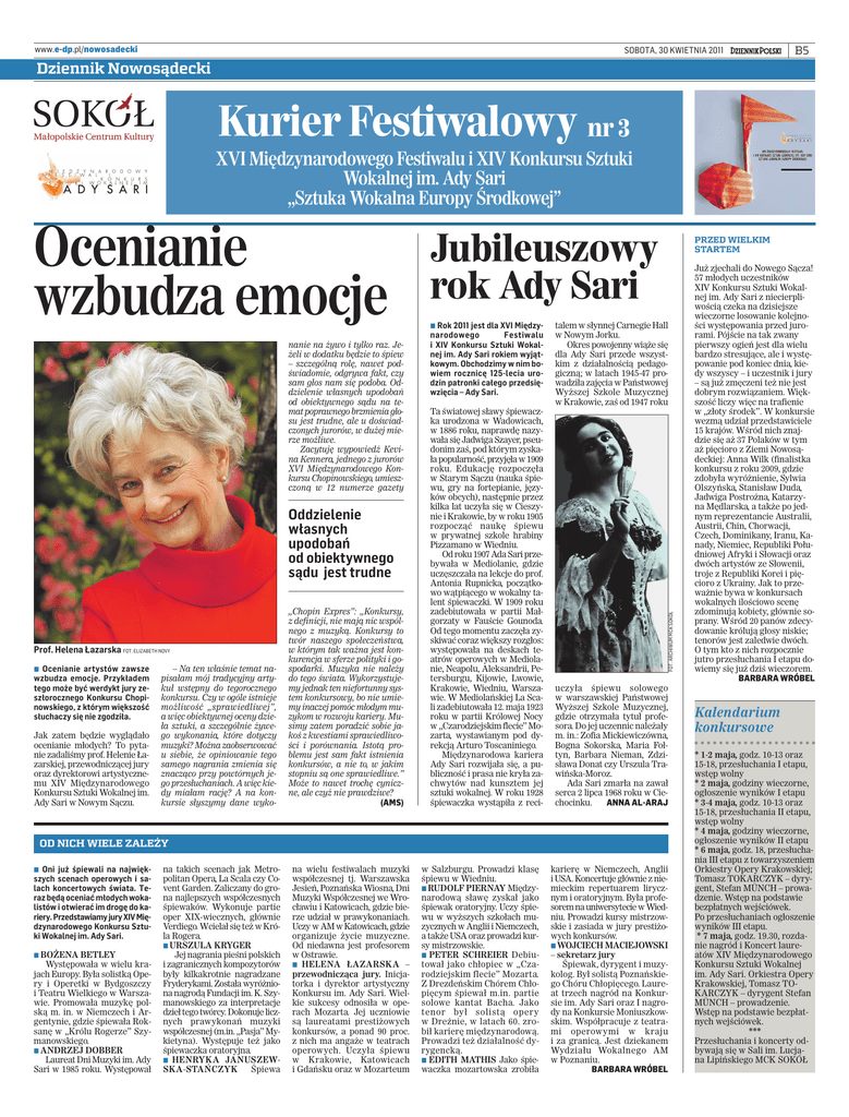 www.e-dp.pl/nowosadecki SOBOTA, 30 KWIETNIA 2011 B5 Dziennik Nowosądecki Kurier Festiwalowy nr 3 XVI Międzynarodowego Festiwalu i XIV Konkursu Sztuki Wokalnej im. Ady Sari „Sztuka Wokalna Europy Środkowej” nanie na żywo i tylko raz. Jeżeli w dodatku będzie to śpiew – szczególną rolę, nawet podświadomie, odgrywa fakt, czy sam głos nam się podoba. Oddzielenie własnych upodobań od obiektywnego sądu na temat poprawnego brzmienia głosu jest trudne, ale u doświadczonych jurorów, w dużej mierze możliwe. Zacytuję wypowiedź Kevina Kennera, jednego z jurorów XVI Międzynarodowego Konkursu Chopinowskiego, umieszczoną w 12 numerze gazety Oddzielenie własnych upodobań od obiektywnego sądu jest trudne Prof. Helena Łazarska FOT. ELIZABETH NOVY ▪ Ocenianie ar tystów zawsze wzbudza emocje. Przykładem tego może być werdykt jury zeszłorocznego Konkursu Chopinowskiego, z którym większość słuchaczy się nie zgodziła. Jak zatem będzie wyglądało ocenianie młodych? To pytanie zadaliśmy prof. Helenie Łazarskiej, przewodniczącej jury oraz dyrektorowi artystycznemu XIV Międzynarodowego Konkursu Sztuki Wokalnej im. Ady Sari w Nowym Sączu. – Na ten właśnie temat napisałam mój tradycyjny artykuł wstępny do tegorocznego konkursu. Czy w ogóle istnieje możliwość „sprawiedliwej”, a więc obiektywnej oceny dzieła sztuki, a szczególnie żywego wykonania, które dotyczy muzyki? Można zaobserwować u siebie, że opiniowanie tego samego nagrania zmienia się znacząco przy powtórnych jego przesłuchaniach. A więc kiedy miałam rację? A na konkursie słyszymy dane wyko- „Chopin Expres”: „Konkursy, z definicji, nie mają nic wspólnego z muzyką. Konkursy to twór naszego społeczeństwa, w którym tak ważna jest konkurencja w sferze polityki i gospodarki. Muzyka nie należy do tego świata. Wykorzystujemy jednak ten niefortunny system konkursowy, bo nie umiemy inaczej pomóc młodym muzykom w rozwoju kariery. Musimy zatem poradzić sobie jakoś z kwestiami sprawiedliwości i porównania. Istotą problemu jest sam fakt istnienia konkursów, a nie to, w jakim stopniu są one sprawiedliwe.” Może to nawet trochę cyniczne, ale czyż nie prawdziwe? (AMS) Jubileuszowy rok Ady Sari ▪ Rok 2011 jest dla XVI Międzyna ro do we go Fe sti wa lu i XIV Konkursu Sztuki Wokalnej im. Ady Sari rokiem wyjątkowym. Obchodzimy w nim bowiem rocznicę 125-lecia urodzin patronki całego przedsięwzięcia – Ady Sari. Ta światowej sławy śpiewaczka urodzona w Wadowicach, w 1886 roku, naprawdę nazywała się Jadwiga Szayer, pseudonim zaś, pod którym zyskała popularność, przyjęła w 1909 roku. Edukację rozpoczęła w Starym Sączu (nauka śpiewu, gry na fortepianie, języków obcych), następnie przez kilka lat uczyła się w Cieszynie i Krakowie, by w roku 1905 rozpocząć naukę śpiewu w prywatnej szkole hrabiny Pizzamano w Wiedniu. Od roku 1907 Ada Sari przebywała w Mediolanie, gdzie uczęszczała na lekcje do prof. Antonia Rupnicka, początkowo wątpiącego w wokalny talent śpiewaczki. W 1909 roku zadebiutowała w partii Małgorzaty w Fauście Gounoda. Od tego momentu zaczęła zyskiwać coraz większy rozgłos: występowała na deskach teatrów operowych w Mediolanie, Neapolu, Aleksandrii, Petersburgu, Kijowie, Lwowie, Krakowie, Wiedniu, Warszawie. W Mediolańskiej La Scali zadebiutowała 12. maja 1923 roku w partii Królowej Nocy w „Czarodziejskim flecie” Mozarta, wystawianym pod dyrekcją Arturo Toscaniniego. Międzynarodowa kariera Ady Sari rozwijała się, a publiczność i prasa nie kryła zachwytów nad kunsztem jej sztuki wokalnej. W roku 1928 śpiewaczka wystąpiła z reci- talem w słynnej Carnegie Hall w Nowym Jorku. Okres powojenny wiąże się dla Ady Sari przede wszystkim z działalnością pedagogiczną; w latach 1945-47 prowadziła zajęcia w Państwowej Wyższej Szkole Muzycznej w Krakowie, zaś od 1947 roku FOT. ARCHIWUM MCK SOKÓŁ Ocenianie wzbudza emocje uczyła śpiewu solowego w warszawskiej Państwowej Wyższej Szkole Muzycznej, gdzie otrzymała tytuł profesora. Do jej uczennic należały m. in.: Zofia Mickiewiczówna, Bogna Sokorska, Maria Fołtyn, Barbara Nieman, Zdzisława Donat czy Urszula Trawińska-Moroz. Ada Sari zmarła na zawał serca 2 lipca 1968 roku w Ciechocinku. ANNA AL-ARAJ OD NICH WIELE ZALEŻY ▪ Oni już śpiewali na największych scenach operowych i salach koncertowych świata. Teraz będą oceniać młodych wokalistów i otwierać im drogę do kariery. Przedstawiamy jury XIV Międzynarodowego Konkursu Sztuki Wokalnej im. Ady Sari. ▪ BOŻENA BETLEY Występowała w wielu krajach Europy. Była solistką Opery i Operetki w Bydgoszczy i Teatru Wielkiego w Warszawie. Promowała muzykę polską m. in. w Niemczech i Argentynie, gdzie śpiewała Roksanę w „Królu Rogerze” Szymanowskiego. ▪ ANDRZEJ DOBBER Laureat Dni Muzyki im. Ady Sari w 1985 roku. Występował na takich scenach jak Metropolitan Opera, La Scala czy Covent Garden. Zaliczany do grona najlepszych współczesnych śpiewaków. Wykonuje partie oper XIX-wiecznych, głównie Verdiego. Wcielał się też w Króla Rogera. ▪ URSZULA KRYGER Jej nagrania pieśni polskich i zagranicznych kompozytorów były kilkakrotnie nagradzane Fryderykami. Została wyróżniona nagrodą Fundacji im. K. Szymanowskiego za interpretacje dzieł tego twórcy. Dokonuje licznych prawykonań muzyki współczesnej (m.in. „Pasja” Mykietyna). Występuje też jako śpiewaczka oratoryjna. ▪ HENRYKA JANUSZEWSKA-STAŃCZYK Śpiewa na wielu festiwalach muzyki współczesnej tj. Warszawska Jesień, Poznańska Wiosna, Dni Muzyki Współczesnej we Wrocławiu i Katowicach, gdzie bierze udział w prawykonaniach. Uczy w AM w Katowicach, gdzie organizuje życie muzyczne. Od niedawna jest profesorem w Ostrawie. ▪ HELENA ŁAZARSKA – przewodnicząca jury. Inicjatorka i dyrektor artystyczny Konkursu im. Ady Sari. Wielkie sukcesy odnosiła w operach Mozarta. Jej uczniowie s