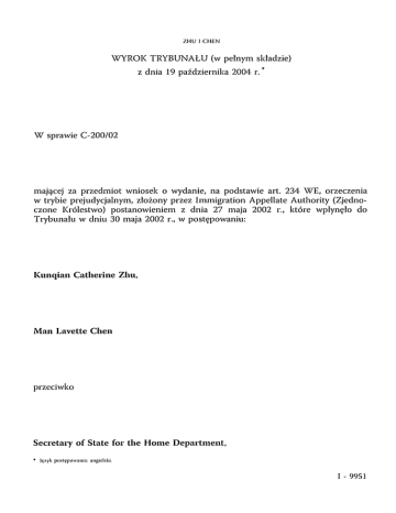 ZHU I CHEN WYROK TRYBUNAŁU (w pełnym składzie) z dnia 19 października 2004 r. * W sprawie C-200/02 mającej za przedmiot wniosek o wydanie, na podstawie art. 234 WE, orzeczenia w trybie prejudycjalnym, złożony przez Immigration Appellate Authority (Zjedno czone Królestwo) postanowieniem z dnia 27 maja 2002 r., które wpłynęło do Trybunału w dniu 30 maja 2002 r., w postępowaniu: Kunqian Catherine Zhu, Man Lavette Chen przeciwko Secretary of State for the Home Department, * Język postępowania: angielski. I - 9951 WYROK Z DNIA 19.10.2004 r. — SPRAWA C-200/02 TRYBUNAŁ (w pełnym składzie), w składzie: V. Skouris, prezes, P. Jann, C. W. A. Timmermans, A. Rosas, R. Silva de Lapuerta i K. Lenaerts, prezesi izb, C. Gulmann, R. Schintgen, N. Cołneric, S. von Bahr i J. N. Cunha Rodrigues (sprawozdawca), sędziowie, rzecznik generalny: A. Tizzano, sekretarz: L. Hewlett, główny administrator, uwzględniając procedurę pisemną i po przeprowadzeniu rozprawy w dniu 11 listopada 2003 r., rozważywszy uwagi przedstawione: — w imieniu Man Lavette Chen przez R. de Mella oraz A. Berry'ego, barristers, wspieranych przez M. Barry'ego, solicitor, — w imieniu rządu irlandzkiego przez D. J. O'Hagana, działającego w charakterze pełnomocnika, wspieranego przez P. Callaghera, S.C., oraz P. McGarry'ego, BL, — w imieniu rządu Zjednoczonego Królestwa przez J. E. Collinsa, R. Plendera, QC, oraz R. Caudwell, działających w charakterze pełnomocników, I - 9952 ZHU I CHEN — w imieniu Komisji Wspólnot Europejskich przez C. O'Reilly, działającą w charakterze pełnomocnika, po zapoznaniu się z opinią rzecznika generalnego na posiedzeniu w dniu 18 maja 2004 r., wydaje następujący Wyrok 1 Wniosek o wydanie orzeczenia w trybie prejudycjalnym dotyczy wykładni dyrektywy Rady 73/148/EWG z dnia 21 maja 1973 r. w sprawie zniesienia ograniczeń w zakresie przemieszczania się i pobytu obywateli Państw Członkowskich w obrębie Wspólnoty, które dotyczą przedsiębiorczości i świadczenia usług (Dz.U. L 172, str. 14), dyrektywy Rady 90/364/EWG z dnia 28 czerwca 1990 r. w sprawie prawa pobytu (Dz.U. L 180, str. 26) oraz art. 18 WE. 2 Wniosek ten został złożony w ramach postępowania w sporze pomiędzy Kunqian Catherine Zhu (zwaną dalej „Catherine"), obywatelką irlandzką, i jej matką, Man Lavette Chen (zwaną dalej „M. N. Chen"), obywatelką chińską, a Secretary of State for the Home Department w związku z odrzuceniem przez tego ostatniego wniosków Catherine oraz M. N. Chen o zezwolenie na długoterminowy pobyt w Zjednoczonym Królestwie. I - 9953 WYROK Z DNIA 19.10.2004 r. — SPRAWA C-200/02 Ramy prawne Uregulowania wspólnotowe 3 Artykuł 1 dyrektywy 73/148 stanowi: „1. Państwa Członkowskie, działając zgodnie z przepisami niniejszej dyrektywy, znoszą ograniczenia w zakresie przemieszczania się i pobytu w stosunku do: a) obywateli Państw Członkowskich, którzy osiedlili się lub zamierzają się osiedlić na terenie innego Państwa Członkowskiego w celu podjęcia działalności na własny rachunek albo zamierzają świadczyć usługi na terenie tego państwa; b) obywateli Państw Członkowskich, którzy pragną udać się do innego Państwa Członkowskiego w charakterze odbiorcy usług; c) współmałżonka i dzieci poniżej dwudziestego pierwszego roku życia tych obywateli, niezależnie od ich obywatelstwa; d) krewnych wstępnych i zstępnych zarówno tych obywateli, jak też współmał żonków tych obywateli, którzy to krewni, niezależnie od obywatelstwa, znajdują się na ich utrzymaniu. I - 9954 ZHU I CHEN 2. Państwa Członkowskie sprzyjają przyjmowaniu każdego członka rodziny obywatela, o którym mowa w ust. 1 lit. a) i b) lub współmałżonka tego obywatela, który pozostaje na utrzymaniu tego obywatela lub który w kraju pochodzenia mieszkał w jednym gospodarstwie domowym z tym obywatelem". 4 Artykuł 4 ust. 2 tej dyrektywy stanowi: „Okres prawa pobytu, przyznawanego osobom świadczącym usługi i korzystającym z usług, będzie równy okresowi świadczenia tych usług. Jeśli okres ten przekracza trzy miesiące, Państwo Członkowskie, na którego terytorium te usługi są świadczone, wydaje zezwolenie na pobyt na potwierdzenie udzielonego prawa pobytu. Jeśli ten okres nie przekracza trzech miesięcy, dowód tożsamości lub paszport, na podstawie którego dana osoba wjechała na terytorium państwa, stanowi wystar czający dokument legalizujący pobyt. Państwo Członkowskie może jednak domagać się od osoby, o której mowa, zgłoszenia swojej obecności na jego terytorium". 5 Zgodnie z art. 1 dyrektywy 90/364: „1. Państwa Członkowskie przyznają prawo pobytu obywatelom innych Państw Członkowskich, którzy nie korzystają z tego prawa na mocy innych przepisów prawa wspólnotowego, oraz członkom ich rodzin określonym w ust. 2, pod warunkiem że oni sami oraz członkowie ich rodzin objęci są ubezpieczeniem chorobowym [zdrowotnym] w odniesieniu do wszelkiego ryzyka w przyjmującym Państwie I - 9955 WYROK Z DNIA 19.10.2004 r. — SPRAWA C-200/02 Członkowskim oraz mają wystarczające środki, by nie stać się obciążeniem dla systemu pomocy społecznej w przyjmującym Państwie Członkowskim w okresie ich pobytu. Środki określone w akapicie pierwszym uważa się za wystarczające, w przypadku gdy są wyższe niż poziom środków, poniżej którego przyjmujące Państwo Członkowskie może przyznać pomoc społeczną własnym obywatelom, uwzględniając sytuację osobistą wnioskodawcy oraz, w odpowiednim przypadku, osoby przyjętej w zastosowaniu ust. 2. W przypadku gdy akapit drugi nie znajduje zastosowania w Państwie Członkow skim, środki, jakimi dysponuje wnioskodawca, uważa się za wystarczające, jeżeli są wyższe niż minimalna renta z zabezpieczenia społecznego w przyjmującym Państwie Członkowskim. 2. Następujące osoby mają prawo osiedlenia się w innym Państwie Członkowskim wraz z posiadaczem 