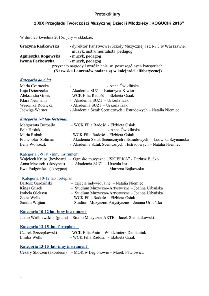 Protokół jury z XIX Przeglądu Twórczości Muzycznej Dzieci i Młodzieży „KOGUCIK 2016” W dniu 23 kwietnia 2016r. jury w składzie: Grażyna Radkowska - dyrektor Państwowej Szkoły Muzycznej I st. Nr 3 w Warszawie, muzyk, instrumentalista, pedagog Agnieszka Rogowska - muzyk, pedagog Iwona Perkowska - muzyk, pedagog przyznało nagrody i wyróżnienia w poszczególnych kategoriach: (Nazwiska Laureatów podane są w kolejności alfabetycznej) Kategoria do 6 lat Maria Czarnecka Kaja Dzierzęcka Aleksandra Grześ Klara Neumann Weronika Rowicka Jadwiga Werner - Anna Ćwiklińska - Akademia SUZI – Katarzyna Kiwior - WCK Filia Radość - Elżbieta Osiak - Akademia SUZI – Urszula Izak - Akademia SUZI – Urszula Izak - Akademia Sztuk Scenicznych i Estradowych – Natalia Niemiec Kategoria 7-9 lat- fortepian Małgorzata Durbajło Pola Hasiuk Maria Robak Franciszka Soliman Lena Wolszczk – WCK Filia Radość - Elżbieta Osiak – - Anna Ćwiklińska – WCK Filia Radość - Elżbieta Osiak – Akademia Sztuk Scenicznych i Estradowych – Ludwika Szymańska - Akademia Sztuk Scenicznych i Estradowych – Natalia Niemiec Kategoria 7-9 lat - inny instrument Wojciech Krupa (keyboard – Ognisko muzyczne „ISKIERKA” - Dariusz Bućko Anna Mazurek (skrzypce) – Akademia SUZI – Urszula Iza Ewa Podgórska (skrzypce) – - Marzena Bajkowska Kategoria 10-12 lat- fortepian Bartosz Gardziński – zajęcia indywidualne – Natalia Niemiec Kinga Guzek – Studium Muzyczno-Artystyczne – Joanna Urbańska Izabela Oleksyn – Studium Muzyczno-Artystyczne – Joanna Urbańska Zosia Wells – WCK Filia Radość - Elżbieta Osiak Sandra Wojtan - Studium Muzyczno-Artystyczne – Joanna Urbańska Kategoria 10-12 lat- inny instrument Jakub Wróblewski i (gitara) - Studio Muzyczne ARTE – Jacek Siemiątkowski Kategoria 13-15 lat- fortepian Czarek Szczepkowski - WCK Filia Anin – Włodzimierz Demianiuk Emilia Wells – WCK Filia Radość - Elżbieta Osiak Kategoria 13-15 lat- inny instrument Cezary Skoczeń (akordeon) – MOK w Legionowie – Marek Pawłowicz 1 Kategoria duety Dominika Łabuz i Krzysztof Byszewski - „Nasz Klub”RSM „Praga” - Beata Grochowska Cezary Skoczeń i Dawid Glinicki - MOK w Legionowie – Marek Pawłowicz Kategoria „ rodzina muzykująca” RUDNICKIE Karolina i Paulina - Akademia SUZI – Urszula Izak W koncercie Galowym wystąpią: 1. Maria Czarnecka - „Mały Chińczyk” - Alec Rowley 2. Kaja Dzierzęcka - „French Children's Song 3. Aleksandra Grześ – utwór do wyboru 4. Klara Neumann - Menuet 1 – Jan Sebastian Bach 5. Franciszka Soliman – Menuet G-dur 6. Małgorzata Durbajło – Scherzino – Kondratij Seliwanow - Jan Sebastian Bach 7. Duet: Dominika Łabuz i Krzysztof Byszewski – „Kołysanka” – 8. Pola Hasiuk – Etiuda C-dur – Marc Frey 9. Ewa Podgórska – „Taniec Hiszpański” - Mirosław Gąsieniec 10. Wojciech Krupa – „Gwiezdne wojny” - John Williams 11. Sandra Wojtan – Walc H-moll - Franciszek Schubert 12. Zosia Wells - Menuet d-moll – Jan Sebastian Bach 13. Izabela Oleksyn - „Pierwsze zmartwienie” - Robert Schumann 14. Duet: Cezary Skoczeń i Dawid Glinicki – Walc „Przyjaźń” - Aram Chaczaturian 15. Jakub Wróblewski - Allegretto - Matteo Carcassi 16. Emilia Wells - „Gaik” - Witold Lutosławski 17. Cezary Skoczeń - Walc francuski „Obojętność” – A Murena KONCERT GALOWY XIX PRZEGLĄDU TWÓRCZOSCI MUZYCZNEJ DZIECI i MŁODZIEŻY „KOGUCIK 2016” ODBĘDZIE SIĘ 22 MAJA 2016R. (NIEDZIELA) miejsce i godzinę koncertu podamy w terminie późniejszym 2
