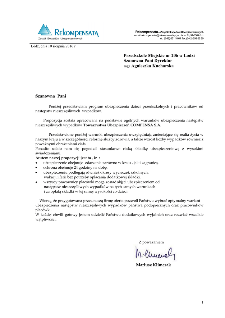 Łódź, dnia 10 sierpnia 2016 r Rekompensata – Zespół Ekspertów Ubezpieczeniowych e-mail: [email protected], ul. Jana 3b, 91-350 Łódź tel. (0-42) 651 10 64 fax. (0-42) 299 66 90 Przedszkole Miejskie nr 206 w Łodzi Szanowna Pani Dyrektor mgr Agnieszka Kucharska Szanowna Pani Poniżej przedstawiam program ubezpieczenia dzieci przedszkolnych i pracowników od następstw nieszczęśliwych wypadków. Propozycja została opracowana na podstawie ogólnych warunków ubezpieczenia następstw nieszczęśliwych wypadków Towarzystwa Ubezpieczeń COMPENSA S.A. Przedstawione poniżej warunki ubezpieczenia uwzględniają zmieniające się realia życia w naszym kraju a w szczególności reformę służby zdrowia, a także wzrost liczby wypadków również z poważnymi obrażeniami ciała. Ponadto udało nam się pogodzić stosunkowo niską składkę ubezpieczeniową z wysokimi świadczeniami. Atutem naszej propozycji jest to , iż : ubezpieczenie obejmuje zdarzenia zarówno w kraju , jak i zagranicą. ochrona obejmuje 24 godziny na dobę. ubezpieczeniu podlegają również okresy wycieczek szkolnych, wakacji i ferii bez potrzeby opłacania dodatkowej składki. wszyscy pracownicy placówki mogą zostać objęci ubezpieczeniem od następstw nieszczęśliwych wypadków na tych samych warunkach i za opłatą składki w tej samej wysokości co dzieci. Wierzę, że przygotowana przez naszą firmę oferta pozwoli Państwu wybrać optymalny wariant ubezpieczenia następstw nieszczęśliwych wypadków państwa podopiecznych oraz pracowników placówki. W każdej chwili gotowy jestem udzielić Państwu dodatkowych wyjaśnień oraz rozwiać wszelkie wątpliwości. Z poważaniem Mariusz Klimczak 1 OFERTA UBEZPIECZENIA NASTĘPSTW NIESZCZĘŚLIWYCH WYPADKÓW DZIECI I MŁODZIEŻY W ROKU SZKOLNYM 2016 / 2017 Ubezpieczenie Następstw Nieszczęśliwych Wypadków zapewnia ochronę: podopiecznym, kadrze dydaktycznej i pozostałym pracownikom placówki dydaktycznej, od.01.09.2016 r. do 31.08.2017 r., na terenie Polski i całego świata. Podstawowa umowa ubezpieczenia obejmuje m.in. następujące świadczenia: 1. świadczenie z tytułu trwałego uszczerbku na zdrowiu - od 1% do 100% sumy ubezpieczenia, zgodnie z tabelą świadczeń stanowiącą załącznik do OWU, 2. świadczenie z tytułu śmierci na skutek NW - 100% sumy ubezpieczenia, 3. świadczenie z tytułu śmierci na skutek NW w środku lokomcji lub w skutek aktów sabotażu i terroru – dodatkowo +50% sumy ubezpieczenia 4. jednorazowe świadczenie z tytułu pogryzienia, ukąszenia, użądlenia 200,00 zł 5. jednorazowe świadczenie z tytułu wystąpienia nieszczęśliwego wypadku w przypadku gdy nie został orzeczony trwały uszczerbek na zdrowiu – 1,5% sumy ubezpieczenia. 6. zwrot kosztów operacji plastycznych w skutek NW – do 40% sumy ubezpieczenia 7. zwolnienie z opłaty składki do 10% ubezpieczonych uczniów. Umowa podstawowa może być rozszerzona o: Limit 40% Klauzula nr 1 – zwrot kosztów leczenia s.u. wskazanej na TU Klauzula nr 2 – dzienne świadczenie szpitalne za pobyt wskutek NW 35 zł za dzień pobytu NW s.u. wskazanej na TU Klauzula nr 3 – jednorazowe świadczenie z tytułu leczenia szpitalnego wskutek Klauzula nr 4 – jednorazowe świadczenie z tytułu poważnego zachorowania Ubezpieczonego Klauzula nr 5 – zasiłek dzienny z tyt. krótkotrwałej niezdolności do nauki Klauzula nr 6 – zwrot kosztów rehabilitacji Klauzula nr 7 – zwrot kosztów naprawy, wypożyczenia lub nabycia środków specjalnych Klauzula nr 8 niepełnosprawnej – zwrot kosztów przeszkolenia zawodowego osoby Klauzula nr 9 – zwrot kosztów pogrzebu prawnego opiekuna Ubezpieczonego Klauzula nr 10 – jednorazowe świadczenia na wypadek śmierci prawnego opiekuna Ubezpieczonego wskutek NW Limit 10% 1 000,00 zł 15,00 zł Limit 40% s.u. wskazanej na TU Limit 40% s.u. wskazanej na TU Limit 50% s.u. wskazanej na TU 1 000,00 zł Limit 15% s.u. wskazanej na śmierć 2 1. TABELA ŚWIADCZEŃ PODSTAWOWYCH Wyszczególnienie wariant A wariant B wariant C 12 000,00 zł 14 000,00 zł 16 000,00 zł Suma ubezpieczenia: Świadczenia: z tytułu trwałego uszczerbku na Zgodnie z Zgodnie z Zgodnie z zdrowiu tabelą w OWU tabelą w OWU tabelą w OWU śmierć na skutek NW 12 000,00 zł 14 000,00 zł 16 000,00 zł śmierć na skutek NW w środku lokomocji lub na skutek aktów sabotażu lub terroru Jednorazowe świadczenie z tytułu zaistnienia NW gdy nie został orzeczony trwały uszczerbek na zdrowiu jednorazowe świadczenie z tytułu pogryzienia, ukąszenia, użądlenia Zwrot kosztów operacji plastycznych w skutek NW SKŁADKA 2. Kl 1 – zwrot kosztów leczenia do 40% su Kl 2 – dzienne świadczenie szpitalne - 35 zł za dobę pobytu w szpitalu na skutek NW Kl 3 – jednorazowe świadczenie z tyt. leczenia szpitalnego na skutek NW – 10% su na NNW Kl 4 – jednorazowe świadczenie z tyt. poważnego zachorowania Kl 5 – zasiłek dzienny z tyt. krótkotrwałej niezdolności do nauki/pracy - 15 zł za dzień Kl 6 – zwrot kosztów rehabilitacji – 40% su na NNW Kl 7 – zwrot kosztów naprawy, wypożyczenia lub zakupu środków specjalnych – 40% su na NNW Kl 8 – zwrot kosztów przeszkolenia zawodowego osoby niepełnosprawnej – 50% su na NNW Kl 9 – zwrot kosztów pogrzebu prawnego opiekuna – 1 000 zł Kl 10 – jednorazowe świadczenie z tyt. śmierci prawnego opiekuna na skutek NW – 15% su na śmierć na skutek NW 21 000,00 zł 24 000,00 zł 180,00 zł 210,00 zł 240,00 zł 200,00 zł 200,00 zł 200,00 zł do 4 800,00 zł do 5 600,00 zł do 6 400,00 zł 12 000,00 zł 14 000,00 zł 34,00 zł TABELA ŚWIADCZEŃ DODATKOWYCH Suma ubezpieczenia NNW Rodzaj świadczenia dodatkowego: 18 000,00 zł 40,00 zł 46,00 zł 16 000,00 zł składka dodatkowa składka dodatkowa składka dodatkowa 11,00 zł 12,00 zł 13,00 zł 2,00 zł 6,00 zł 1,00 zł 2,00 zł 6,00 zł 1,00 zł 2,00 zł 6,00 zł 1,00 zł 6,00 zł 2,00 zł 2,00 zł 1,00 zł 4,00 zł 1,00 zł 6,00 zł 2,00
