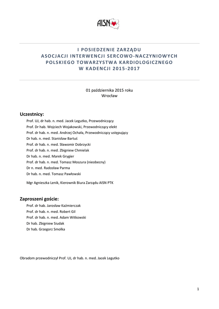 I PO S IE D Z E N IE Z A R Z Ą D U A SO C J A C J I I N T E R W E N C J I SE R C O W O - N A C Z Y N IO W Y C H P O LS K I E G O T O W A R Z Y S T W A K A R D I O LO G IC Z N E G O W K A D E N C J I 2 01 5 - 2 0 17 01 października 2015 roku Wrocław Uczestnicy: Prof. UJ, dr hab. n. med. Jacek Legutko, Przewodniczący Prof. Dr hab. Wojciech Wojakowski, Przewodniczący elekt Prof. dr hab. n. med. Andrzej Ochała, Przewodniczący ustępujący Dr hab. n. med. Stanisław Bartuś Prof. dr hab. n. med. Sławomir Dobrzycki Prof. dr hab. n. med. Zbigniew Chmielak Dr hab. n. med. Marek Grygier Prof. dr hab. n. med. Tomasz Moszura (nieobecny) Dr n. med. Radosław Parma Dr hab. n. med. Tomasz Pawłowski Mgr Agnieszka Lenik, Kierownik Biura Zarządu AISN PTK Zaproszeni goście: Prof. dr hab. Jarosław Kaźmierczak Prof. dr hab. n. med. Robert Gil Prof. dr hab. n. med. Adam Witkowski Dr hab. Zbigniew Siudak Dr hab. Grzegorz Smolka Obradom przewodniczył Prof. UJ, dr hab. n. med. Jacek Legutko 1 Porządek obrad Przyjęto następujący porządek obrad: Spotkanie z zaproszonymi Gośćmi: 1. Spotkanie z Konsultantem Krajowym w dziedzinie kardiologii (omówienie zasad współpracy Zarządu z Konsultantem Krajowym, wycena procedur kardiologii inwazyjnej, wprowadzanie i finansowanie innowacji w kardiologii inwazyjnej, akredytacje ośrodków i operatorów, ORPKI). 2. Omówienie zasad dalszego prowadzenia Ogólnopolskiego Rejestru Procedur Kardiologii Inwazyjnej (Z. Siudak). 3. Omówienie aktualnej sytuacji w zakresie wprowadzania przez Ministra Zdrowia procedur wzorcowych (S. Bartuś, R. Gil, A. Witkowski). 4. Omówienie realizacji programu ZaStawka to Życie – zadania dla Zarządu AISN PTK (A. Witkowski). 5. Omówienie zasad współpracy Zarządu AISN PTK z Radą Konsultacyjną (J. Legutko, R. Gil). 7. Omówienie zasad współpracy Zarządu AISN PTK z Redakcją Postępów w Kardiologii Interwencyjnej (J. Legutko, G. Smolka). 8. Omówienie zasad współpracy Zarządu AISN PTK z Redakcją Kardiologii Inwazyjnej (J. Legutko, R. Gil). Pozostałe punkty porządku obrad omawiane przez Zarząd: 9. Wybór Sekretarza Zarządu AISN PTK w kadencji 2015-2017. 10. Raport Skarbnika poprzedniego Zarządu na temat aktualnego stanu finansów AISN PTK (Z. Chmielak). 11. Wybór Skarbnika Zarządu AISN PTK w kadencji 2015-2017. 12. Omówienie projektu zmian w zasadach certyfikacji operatorów kardiologii inwazyjnej oraz akredytacji ośrodków kardiologii inwazyjnej (J. Legutko). 13. Strona internetowa AISN PTK, biuletyn informacyjny (J. Legutko, R. Parma). 14. Europejski Rejestr STEMI (J. Legutko). 15. ESCel – platforma edukacyjna EAPCI i ESC (W. Wojakowski). 16. Omówienie głównych zadań oraz harmonogramu prac Zarządu AISN PTK w kadencji 2015-2017. 17. Ustalenie terminu kolejnego posiedzenia Zarządu AISN PTK. 18. Wolne wnioski. 19. Zamknięcie posiedzenia. Spotkanie z prof. Jarosławem Kaźmierczakiem, Konsultantem Krajowym w dziedzinie kardiologii. Omówiono aktualny stan prac i ustaleń powołanej przez Ministra Zdrowia Komisji ds. Procedur Wzorcowych. Głos zabrali członkowie Komisji - prof. Adam Witkowski i prof. Robert Gil oraz Przewodniczący Komisji AISN PTK ds. Procedur Obwodowych - doc. Stanisław Bartuś. Przedstawiono stanowisko chirurgów naczyniowych, radiologów i angiologów prezentowane na posiedzeniach Komisji ds. Procedur Wzorcowych, które jest zdecydowanie przeciwne wykonywaniu przez kardiologów inwazyjnych zabiegów na naczyniach obwodowych. Zwrócono uwagę, iż według opinii przedstawicieli tych środowisk medycznych, w obecnym programie specjalizacji z kardiologii problematyka leczenia chorób naczyń zajmuje zbyt mało miejsca. W związku z tym Zarząd AISN PTK zwrócił się ponownie do Konsultanta Krajowego w dziedzinie kardiologii o pilne wprowadzenie zmian do programu specjalizacji z kardiologii, skutkujących rozszerzeniem zakresu szkolenia w zakresie leczenia chorób naczyń, w tym leczenia interwencyjnego. Celem powinno być wprowadzenie minimum 3-miesięcznego szkolenia kardiologów w tym zakresie. Ustalono, że w dalszych pracach nad zmianami programu specjalizacji z kardiologii w tym zakresie uczestniczyli będą prof. Adam Witkowski - członek Komisji ds. programu specjalizacji oraz doc. Stanisław Bartuś – przedstawiciel Zarządu AISN PTK. Opracują oni projekt stosownych zmian w programie specjalizacji z kardiologii i po dyskusji i zatwierdzeniu przez Zarząd AISN PTK prześlą do Konsultanta Krajowego. Omówiono główne założenia projektu Rozporządzenia Ministra Zdrowia o referencyjności w kardiologii. Zarząd AISN PTK wyraził jednomyślnie poparcie dla idei wprowadzenia trzystopniowego systemu 2 referencyjności, jednak z uwagi na brak możliwości wcześniejszego zapoznania się ze szczegółami projektu zwrócił się do konsultanta Krajowego o jego pilne przesłanie do Przewodniczącego AISN. Po zapoznaniu się z projektem dokumentu Zarząd AISN PTK prześle swoje stanowisko w tej sprawie do Konsultanta Krajowego oraz Prezesa PTK. Na zakończenie spotkania z Konsultantem Krajowym przedyskutowano stan zaawansowania prac nad utworzeniem map zapotrzebowania na usługi zdrowotne. Profesor Andrzej Ochała poinformował pozostałych członków Zarządu, iż został zaproszony do udziału w pracach Komisji opracowującej mapy. W związku z tym Zarząd AISN PTK zwrócił się do prof. Andrzeja Ochały o reprezentowanie wspólnego stanowiska Asocjacji w trakcie dalszych prac tej Komisji. Omówienie zasad dalszego prowadzenia Ogólnopolskiego Rejestru Procedur Kardiologii Inwazyjnej Przewodniczący AISN PTK w imieniu Zarządu Asocjacji wyraził uznanie dla doc. Zbigniewa Siudaka oraz prof. Dariusza Dudka za prowadzenie Rejestru ORPKI. Potwierdzono utrzymanie dotychczasowego budżetu na prowadzenie rejestru do czasu oficjalnego zatwierdzenia ORPKI przez Ministra Zdrowia i uzyskania odrębnego finansowania rejestru. Prof. Sławomir Dobrzycki zadał pytanie formalne – po c