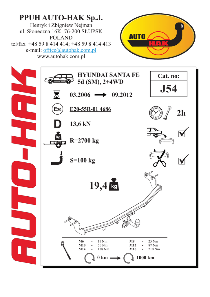 PPUH AUTO-HAK Sp.J. Henryk i Zbigniew Nejman ul. S³oneczna 16K 76-200 S£UPSK POLAND tel/fax +48 59 8 414 414; +48 59 8 414 413 e-mail: [email protected] www.autohak.com.pl AUTO HAK HYUNDAI SANTA FE 5d (SM), 2+4WD 03.2006 E20 E20-55R-01 4686 D 13,6 kN kg J54 09.2012 2h R=2700 kg S=100 kg 19,4 M6 M10 M14 - 11 Nm 50 Nm 138 Nm 0 km kg M8 M12 M16 - 25 Nm 87 Nm 210 Nm 1000 km OD PRODUCENTA: PL Dziêkujemy za wybór produkowanego przez nasz¹ firmê zaczepu kulowego. Jego niezawodnoœæ zosta³a potwierdzona licznymi testami oraz opiniami zadowolonych klientów. Jednak¿e niezawodnoœæ zaczepów kulowych jest zale¿na równie¿ od prawid³owego monta¿u oraz prawid³owej eksploatacji. Z tego powodu prosimy Pañstwa o staranne przeczytanie niniejszej instrukcji monta¿u oraz przestrzeganie w³aœciwych wskazówek. Zaczep nale¿y zamontowaæ w miejscach do tego celu przeznaczonych przez producenta samochodu. FROM MANUFACTURER: GB Thank you for buying our product. Their reliability has been confirmed in many tests. Reliability of towbar depends also on correct assembly and right operation. For this reasons we kindly ask to read carefully this instruction and apply to hints. The towbar should be install in points described by a car producer. VON DEM HERSTELLER: D F Die Zuverlässigkeit der Anhängekupplung ist jedoch auch von der ordnungsgemäßen Montage und der richtigen Nutzung abhängig. Daher werden Sie gebeten, sorgfältig die folgende Montageanleitung zu lesen und sich an die entsprechenden Anweisungen zu halten. Die Anhängekupplung muss an den vom Fahrzeughersteller vorgeschriebenen Befestigungsstellen montiert werden. DE LA PART DU FABRICANT: Merci d'avoir choisi le dispositif d'attelage aÌ boule produit par notre societ́e.́ Sa fiabilite´a et́e´confirmeé par de nombreux tests et a travers l'opinion des clients satisfaits. Toutefois, la fiabilite´des dispositifs d'attelage a`boule deṕend également d'une installation et d'une utilisation correcte. Pour cette raison, nous vous demandons de lire attentivement cette instruction de montage et d'en respecter les consignes. Le dispositif d'attelage a`boule doit et^re monte´dans des emplacements prev́us a cet effet par le fabricant de voiture. FRA PRODUCENTEN: DK Tak fordi De har valgt vores anhængertræk. Dets pålidelighed er blevet bekræftet i mange undersøgelser samt af tilfredse kunder. Vores anhængertræks pålidelighed er også afhængig af korrekt montering og korrekt betjening. Af denne grund beder vi Dem at læse denne instruktion grundigt og overholde de korrekte anvisninger. DE PRODUCTOR: E Gracias por la elección del enganche de bola producido por nuestra empresa. Su fiabilidad fue confirmada por numerosos testos y opiniones de los clientes quienes estuvieron contentos. Sin embargo la fiabilidad de enganche de bola depende también de un montaje adecuado y su explotación adecuada. Por esa causa por favor leer atentamente la instrucción del montaje y observar adecuadas indicadoras. VAN DE FABRIKANT: NL Bedankt voor de aanschaf van onze kogeltrekhaak. Hoe betrouwbaar die is blijkt wel uit vele tests en meningen van tevreden klanten. Toch is de betrouwbaarheid van een kogeltrekhaak er mede van afhankelijk dat deze correct gemonteerd is en op de juiste manier wordt gebruikt. Daarom wordt u verzocht deze montagehandleiding zorgvuldig te lezen en de aanwijzingen te volgen. FRA PRODUSENTEN: N Takk for at dere har valgt kulefestet produsert av vårt firma. Driftssikkerheten på kulefestet har blitt bekreftet av flere tester og tilbakemeldinger fra fornøyde kunder. Allikevel er driftssikkerheten også avhengig av en korrekt montering og riktig bruk. Derfor ber vi dere om å lese denne monteringsinstruksen nøye og anbefaler at dere følger veiledningen. ETT BUDSKAP FRÅN TILLVERKAREN: S Vi skulle vilja tacka er för ert val och inköp. Våra dragkrokars pålitlighet har bevisats av olika tester samt referenser från nöjda kunder. Man får inte glömma att dragkrokars pålitlighet beror också på rätt installation och rätt bruk. Därför skulle vi vilja be att ni läser noga denna installationsanvisning och följer alla regler och tips som den anger. Dragkroken ska installeras i ett ställe som blivit påpekade av biltillverkaren. DAL FABBRICANTE: IT -2- Vi ringraziamo per aver scelto il gancio di traino a sfera prodotto dalla nostra azienda. La sua affidabilità è stata confermata da numerosi test e dalle opinioni positive dei clienti. Tuttavia, il perfetto funzionamento dei ganci di traino a sfera dipende anche dalla correttezza del montaggio e dall'utilizzo appropriato. Per questo motivo, Vi preghiamo di leggere attentamente le presenti istruzioni di montaggio e di attenervi alle indicazioni in esse contenute. Il gancio di traino deve essere montato nei punti predisposti a tal fine dal fabbricante del veicolo. PL GB D F A-A DK E NL The clearance specified in appendix VII, diagram 25a/b of Regulation No. 55.01 UN EU must be guaranteed at laden weight of the vehicle. Der Freiraum nach Anhang VII, Abbildung 25a/b der Vorschriften 55.01 EG ist zu gewährleistenbei zulässigem Gesamtgewichtdes Fahrzeuges. L’espace libre doit etre garanti conformément a l’annexe VII, illustration 25a/b de la reglements 55.01 CE pour un poids total en charge autorisé du véhicule. I overensstemmelse med bilag VII, figur 25a/b til forordninger 55.01 EF for køretøjets tilladte totalvægt skal der garanteres en friplads. Hay que garantizar un espacio suelto según archivo adjunto VII, ilustración 25a/b regulaciones 55.01 UN EU de peso admisible y total del vehículo. De in bijlage VII afbeelding 25a/b vanreglement 55.01 UN EU gespecificeerde vrije ruimte moet bij een maximale gewichtsbelasting van het voertuig gegarandeerd zijn. N Det skal sørges for fritt rom ifølge vedlegget VII, illustrasjon 25a/b forskrifter 55.01 UN EU ved den tillatte totale vekten av fartøyet. S Man ska garantera ett fritt tillgängligt utrymme - se bila