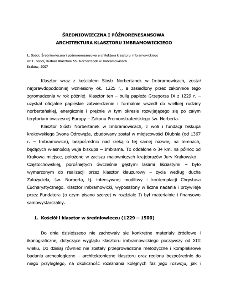 ŚREDNIOWIECZNA I PÓŹNORENESANSOWA ARCHITEKTURA KLASZTORU IMBRAMOWICKIEGO L. Sobol, Średniowieczna i późnorenesansowa architektura klasztoru imbramowickiego w: L. Sobol, Kultura Klasztoru SS. Norbertanek w Imbramowicach Kraków, 2007 Klasztor wraz z kościołem Sióstr Norbertanek w Imbramowicach, został najprawdopodobniej wzniesiony ok. 1225 r., a zasiedlony przez zakonnice tego zgromadzenia w rok później. Klasztor ten – bullą papieża Grzegorza IX z 1229 r. – uzyskał oficjalne papieskie zatwierdzenie i formalnie wszedł do wielkiej rodziny norbertańskiej, energicznie i prężnie w tym okresie rozwijającego się po całym terytorium ówczesnej Europy – Zakonu Premonstrateńskiego św. Norberta. Klasztor Sióstr Norbertanek w Imbramowicach, z woli i fundacji biskupa krakowskiego Iwona Odrowąża, zbudowany został w miejscowości Dłubnia (od 1367 r. – Imbramowice), bezpośrednio nad rzeką o tej samej nazwie, na terenach, będących własnością wuja biskupa – Imbrama. To oddalone o 34 km. na północ od Krakowa miejsce, położone w zaciszu malowniczych krajobrazów Jury Krakowsko – Częstochowskiej, porośniętych ówcześnie gęstymi lasami liściastymi – było wymarzonym do realizacji przez klasztor klauzurowy – życia według ducha Założyciela, św. Norberta, tj. intensywnej modlitwy i kontemplacji Chrystusa Eucharystycznego. Klasztor imbramowicki, wyposażony w liczne nadania i przywileje przez Fundatora (o czym pisano szerzej w rozdziale I) był materialnie i finansowo samowystarczalny. 1. Kościół i klasztor w średniowieczu (1229 – 1500) Do dnia dzisiejszego nie zachowały się konkretne materiały źródłowe i ikonograficzne, dotyczące wyglądu klasztoru imbramowickiego począwszy od XIII wieku. Do dzisiaj również nie zostały przeprowadzone metodyczne i kompleksowe badania archeologiczno – architektoniczne klasztoru oraz regionu bezpośrednio do niego przyległego, na okoliczność rozeznania kolejnych faz jego rozwoju, jak i przemian przestrzenno – architektonicznych całego zespołu, od momentu jego powstania, do końca XVIII wieku. Dlatego brak tej wiedzy w sposób zasadniczy uniemożliwia wysunięcie jakiejkolwiek prawdopodobnej hipotezy, bliskiej prawdy historycznej o jego wyglądzie, rozplanowaniu przestrzennym, architekturze, jego gabarytach i detalu architektonicznym. Korzystając z informacji, jakie pozostawił nam ks. Władysław Knapiński, historyk zakonu norbertańskiego w swoim opracowaniu, pochodzącym z końca XIX wieku – możemy jedynie prześledzić konieczne i wymagane regułą św. Norberta funkcje użytkowe klasztoru, jakie winny być w nim zlokalizowane. 1 W klasztorze norbertańskim winny być rozmieszczone następujące funkcje użytkowe, a to: oficyny klasztorne z kaplicą domową (oratorium), sypialnie (dormitorium), kuchnia, jadalnia (refektarz), pokoje gościnne, sala chorych (infirmeria), rozmównica (auditorium), sala rekreacyjna (locutorium), biblioteka, pomieszczenie do nauki, pomieszczenia nowicjatu oraz część gospodarcza. Natomiast jeśli chodzi o rozplanowanie i wygląd samego kościoła klasztornego, w regule brak jest jakichkolwiek na ten temat wskazówek lub wytycznych. Jedynym, najstarszym zachowanym dokumentem źródłowym, informującym zresztą w formie lakonicznej o wyglądzie klasztoru i kościoła imbramowickiego – jest pochodzący z 1460 r. jego opis, sporządzony ręką ks. kanonika krakowskiego Jana Długosza w Liber Beneficiorum2, w którym daje on wyraz swego wyjątkowego zatroskania stanem jego dotychczasowego zachowania (ks. Jan Długosz wizytował klasztor ok. 1460 r.). Klasztor był wtedy opustoszały, mieszkało w nim 2 – 3 braci Norbertanów, gdyż siostry Norbertanki już od przeszło 45 lat przebywały – zgodnie z postanowieniem Soboru w Konstancji z 1415 r. – w klasztorze w Busku. Dalej J. Długosz pisze: „kościół zbudowany jest z cegły, ale niedokończony, oficyny i mieszkania zakonnic otoczone murem i nim zamknięte. Obok kościoła, po jego przeciwnej stronie, za murem – klasztor męski norbertanów z ich probostwem.” 3 Nadmienić należy, iż w okresie, kiedy siostry norbertanki przebywały Imbramowicach – sprawowali oni opiekę duszpasterską nad nimi oraz parafią. 1 2 3 Knapiński, Św. Norbert, s. 74 Długosz, Liber beneficiorum, t. 3, s. 88 – 89, 104–106 Tamże, s. 109 w Zatem ten niezwykle lakoniczny i powierzchowny opis klasztoru i kościoła sióstr norbertanek w Imbramowicach, jest jedyną zachowaną relacją naocznego świadka o stanie klasztoru w połowie XV wieku, w przeszło 200 lat od jego powstania. W ślad za tą informacją historyczną, dr H. Pieńkowska w trakcie swych wstępnych badań architektonicznych (i dotychczas jedynych) wykonywanych w klasztorze w latach 1971 – 1975, przy okazji prowadzonych w nim prac remontowo – modernizacyjnych i konserwatorskich przy współpracy z mgr Andrzejem Krupińskim ustaliła, że „... w kościele w obrębie prezbiterium i nawie na wysokości parteru występuje w ścianach wątek ceglany. Jest to cegła czerwona, palcówka, o strukturze drobnoziarnistej i średnich wymiarach 14,6 x 10,5 x 28,1 cm. Występuje ona w wątku o układzie „polskim” lub nieregularnym, o trójkątnej spoinie twardej, gruboziarnistej o czerwonym zabarwieniu 4. Ten sam wątek i cegła występują w oratorium zakonnym, zlokalizowanym przy południowej ścianie prezbiterium kościoła, a jego nikłe fragmenty występują wewnątrz przybudowanej do prezbiterium, północnej klatki schodowej. Natomiast ściana północna kościoła była wielokrotnie przebudowywana w przeszłości i nie zachowała w sobie żadnych pierwotnych wątków...” Z analizy tych faktów oraz szeregu innych, takich jak przemurowania wtórne w okresie baroku otworów okiennych – dr H. Pieńkowska autorytatywnie stwierdza, iż zabudowa ta pochodzi najwcześniej z XIV wieku. 5 Tak więc nasuwa się w tej kwestii drugi wniosek. Zabudo