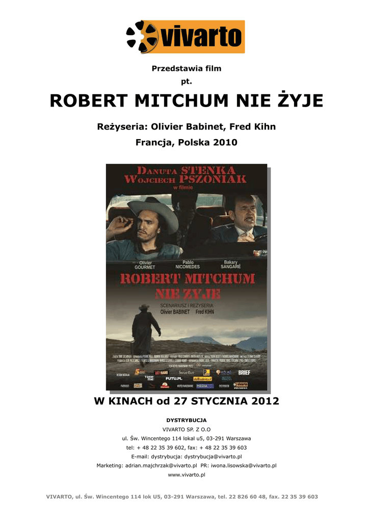 Przedstawia film pt. ROBERT MITCHUM NIE ŻYJE Reżyseria: Olivier Babinet, Fred Kihn Francja, Polska 2010 W KINACH od 27 STYCZNIA 2012 DYSTRYBUCJA VIVARTO SP. Z O.O ul. Św. Wincentego 114 lokal u5, 03-291 Warszawa tel: + 48 22 35 39 602, fax: + 48 22 35 39 603 E-mail: dystrybucja: [email protected] Marketing: [email protected] PR: [email protected] www.vivarto.pl VIVARTO, ul. Św. Wincentego 114 lok U5, 03-291 Warszawa, tel. 22 826 60 48, fax. 22 35 39 603 VIVARTO SP. z o.o. przedstawia produkcję Ferris & Brockman, Studio Agart, Panache Productions, Sweet Films, TPS Star, CinéCinéma, Liberty TV Europe, Centre National de la Cinématographie (CNC), Tranquille Le Chat, Trois Lignes, Irène Production, La Compagnie Cinématographique Européenne pt. ROBERT MITCHUM NIE ŻYJE TYTUŁ ORYGINALNY:ROBERT MITCHUM EST MORT TWÓRCY m.in.: Scenariusz i reżyseria: Olivier Babinet, Fred Kihn Zdjęcia: Timo Salminen Muzyka: Étienne Charry Montaż: Yann Dedet Thomas Marchand Scenografia: Pierre Pell WYSTĘPUJĄ m.in.: Olivier Gourmet ....... Arsène Pablo Nicomedes ...... Franky Bakary Sangaré ........ Douglas Danuta Stenka .......... Katia Wojciech Pszoniak .... rektor Ewelina Walendziak .. studentka VIVARTO, ul. Św. Wincentego 114 lok U5, 03-291 Warszawa, tel. 22 826 60 48, fax. 22 35 39 603 NAGRODY / FESTIWALE m.in.: Sekcja Acid Festiwal Filmowy w Cannes Film otwarcia Międzynarodowego Festiwalu Filmowego w Mediolanie Sekcja Wolny Duch Warszawski Festiwal Filmowy Sekcja Panorama Senses of Humor Mar Del Plata Best First Film Raindance London Panorama Polonica Festiwal Filmowy w Gdyni Sekcja Emile Cantillon Międzynarodowy Festiwal Filmowy w Namur Festiwal Filmowy Cleveland Open Horizons Thessaloniki O FILMIE Franky Pastor jest bezrobotnym aktorem. Cierpi na bezsenność, nic mu się nie udaje, nie potrafi już nawet kleptomanem. Też marzyć. Arsène, jego menadżer, jest byłym wokalistą rockowym i nic mu się w życiu nie udało. Dla zaspokojenia swoich niezrealizowanych ambicji postanawia zaryzykować wszystko: kradnie samochód i zabiera swojego „protegowanego” na rzekomo umówione spotkanie ze słynnym reżyserem. Franky ślepo podąża za swoim menadżerem, łykając na przemian witaminy i tabletki nasenne. Franky i Arsène przez pół Europy gonią marzenia, zmierzając w kierunku Bieguna Północnego, gdzie ma odbyć się spotkanie ostatniej szansy dla nich obu. VIVARTO, ul. Św. Wincentego 114 lok U5, 03-291 Warszawa, tel. 22 826 60 48, fax. 22 35 39 603 KOMENTARZ DUETU REŻYSERSKIEGO Oficjalne materiały producenta Jak sam tytuł sugeruje, “Robert Mitchum nie żyje”, jest filmem zawieszonym gdzieś pomiędzy mitem a rzeczywistością. Mitem, o którym mowa jest amerykańskie kino, a konkretnie kino lat 50tych i 60tych. Współistniejącą rzeczywistością jest świat Franky'ego, aktora u kresu możliwości, którego menadżer, Arsene, stara się chorobliwie zmotywować do pracy. Ta granica pomiędzy mitem i rzeczywistością zostaje rozbita w drobny pył, kiedy Arsene, w przypływie desperacji, wyjmuje swój pistolet, który trzyma w łazience i postanawia pojechać za koło polarne, do Finlandii. Niezależnie od ceny, którą przyjdzie mu zapłacić, musi spotkać George'a Sarrinef'a, słynnego europejskiego reżysera, który przygotowuje się właśnie do swojej pierwszej amerykańskiej produkcji. Razem z Frankym, wyrusza w drogę, w rytmie brit-punkowych kapeli. W ten sposób rozpoczynają swoją zwariowaną przejażdżkę po Europie. Opowieść ta zdaje się być filmem drogi, zawiera jednak elementy slapsticku, filmu noir, a nawet westernu. Zostało to podyktowane przez różne okoliczności. Mit zajmuje tak ważne miejsce w filmie, bo ponad wszystko, jest odpowiedzią na daremny cynizm niektórych postaci. Do tego jest też mocną siłą napędzającą akcję filmu. Mit złotej ery amerykańskich filmów ma w ten sposób zasadniczy wpływ na całość fabuły. Decydując się na walkę o swoje ideały, Franky i Arsene dochodzą do sedna prawdy leżącej u podstaw tego mitu: akcja! U kresu swej drogi, obaj mężczyźni jednak odkrywają, że mit, z którym utożsamiają Mitchuma, naprawdę nie żyje. Słynny reżyser nie nakręci swojego filmu, a koło podbiegunowe jest tylko narysowaną, białą linią po środku miasteczka przypominającego okropny ośrodek narciarski, zbudowany wokół betonowej choinki, które odtwarza świąteczne melodie grane na gitarze elektrycznej. Stając twarzą w twarz z wynaturzeniem swoich ideałów, Franky rozumie, że jego prawdziwą drogą jest podróżowanie w nieznane, poznanie czegoś, choćby trywialnego, o sobie i świecie. VIVARTO, ul. Św. Wincentego 114 lok U5, 03-291 Warszawa, tel. 22 826 60 48, fax. 22 35 39 603 DUET REŻYSERSKI – OLIVIER BABINET I FRED KIHN Olivier Babinet to uzdolniony reżyser, który już jako nastolatek pisał i produkował dramaty radiowe i realizował nowele fotograficzne. W wieku 18 lat został redaktorem kreatywnym i współpracował z wieloma agencjami reklamowymi, oraz z Raymondem Depardonem i magazynem “Liberation”. Przez lata współpracował z firmami takimi jak: Mercedes, Mikli, Volvic oraz tworzył krótkie filmy i teledyski emitowane przez: Canal+, MTV, MCM, M6. W 2008 amerykański magazyn “Boards” umieścił Oliviera Babinet na liście trzydziestu światowych reżyserów, którym należy się przyglądać. Jego ostatni film krótkometrażowy “C’est plutot gentre Johnny Walker” został wielokrotnie nagrodzony na festiwalach w Europie. FILMOGRAFIA 2010 2008 2007 2006 2004 2003 2002 Robert Mitchum nie żyje C’est plutot gentre Johnny Walker Specjalna Nagroda Jury: “Clermont-Ferrand Short Film Festival 2009” Grand Prox: “Festiwal filmów krótkometrażowych w Nicei, 2009” Angers Prix CCAS et Meilleure Creation Musicale, 2009 Toyboy (teledysk “Stuck in the Sound”) Nagroda od magazynów: “Boards”, “Les Inrockuptibles” and “The Reel” Siliguri (teledysk Mathi