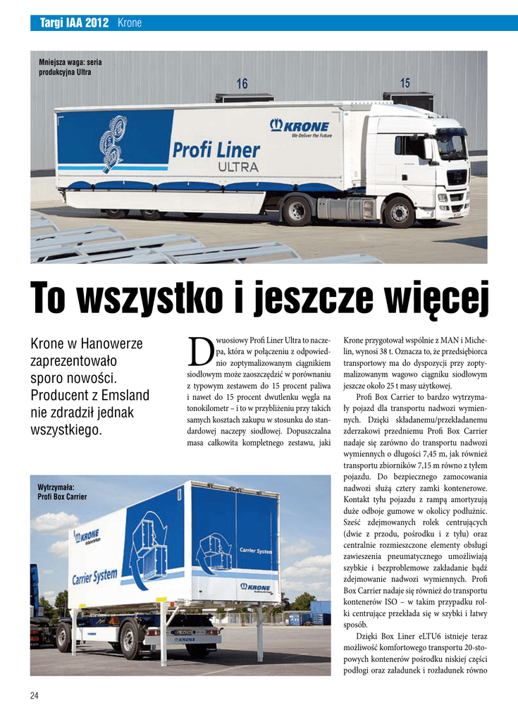 Targi IAA 2012 Krone Mniejsza waga: seria produkcyjna Ultra To wszystko i jeszcze więcej Krone w Hanowerze zaprezentowało sporo nowości. Producent z Emsland nie zdradził jednak wszystkiego. Wytrzymała: Profi Box Carrier 24 D wuosiowy Profi Liner Ultra to naczepa, która w połączeniu z odpowiednio zoptymalizowanym ciągnikiem siodłowym może zaoszczędzić w porównaniu z typowym zestawem do 15 procent paliwa i nawet do 15 procent dwutlenku węgla na tonokilometr – i to w przybliżeniu przy takich samych kosztach zakupu w stosunku do standardowej naczepy siodłowej. Dopuszczalna masa całkowita kompletnego zestawu, jaki Krone przygotował wspólnie z MAN i Michelin, wynosi 38 t. Oznacza to, że przedsiębiorca transportowy ma do dyspozycji przy zoptymalizowanym wagowo ciągniku siodłowym jeszcze około 25 t masy użytkowej. Profi Box Carrier to bardzo wytrzymały pojazd dla transportu nadwozi wymiennych. Dzięki składanemu/przekładanemu zderzakowi przedniemu Profi Box Carrier nadaje się zarówno do transportu nadwozi wymiennych o długości 7,45 m, jak również transportu zbiorników 7,15 m równo z tyłem pojazdu. Do bezpiecznego zamocowania nadwozi służą cztery zamki kontenerowe. Kontakt tyłu pojazdu z rampą amortyzują duże odboje gumowe w okolicy podłużnic. Sześć zdejmowanych rolek centrujących (dwie z przodu, pośrodku i z tyłu) oraz centralnie rozmieszczone elementy obsługi zawieszenia pneumatycznego umożliwiają szybkie i bezproblemowe zakładanie bądź zdejmowanie nadwozi wymiennych. Profi Box Carrier nadaje się również do transportu kontenerów ISO – w takim przypadku rolki centrujące przekłada się w szybki i łatwy sposób. Dzięki Box Liner eLTU6 istnieje teraz możliwość komfortowego transportu 20-stopowych kontenerów pośrodku niskiej części podłogi oraz załadunek i rozładunek równo z obrysem tyłu pojazdu. Taką możliwość oraz równoczesną optymalizację rozkładu obciążenia podczas transportu daje regulacja rozstawu osi. Hit całości: podwozie jest wysuwane lub nasuwane na ciągnik po wykonaniu pneumatycznego odryglowania. QuickLock i Duoplex Steel Krone oferuje serię Box Liner także z zamknięciem QuickLock. Pod wpływem wagi kontenera mechanizm QuickLock rygluje się samodzielnie, w ten sposób kontener jest zabezpieczony na podwoziu. W porównaniu z powszechnie stosowanym TwistLock praktycy mówią o możliwości zaoszczędzenia do godziny w ciągu dnia. System QuickLock oferowany jest dla obciążeń do 34000 kg; zamknięcie jest certyfikowane zgodnie z TÜV ADR 2009 i DIN EN 283. Cool Box w wersji Duoplex Steel firmy Krone to nadwozie wymienne dostosowane konsekwentnie do wysokich wymagań transportu w kontrolowanej temperaturze. Nadwozie z możliwością rozbudowy wykonane jest z modyfikowanych paneli Duoplex Steel umożliwiających transport ładunku ze stałą, żądaną temperaturą. Panele boczne o grubości 60 mm i panele dachowe o grubości 85 mm posiadają wkład z pianki PU (twarda pianka poliuretanowa) o niezwykle wysokiej gęstości oraz metalową warstwę wierzchnią odporną na uderzenia; kryteria te zapewniają wysoką izolacyjność i doskonałą odporność na starzenie. Cztery okucia narożne kontenera na podstawie 20-stopowej oraz cztery mocne listwy z uchwytami zaciskowymi i znajdującym się nad nimi odbojem ściany bocznej zapewniają bezproblemowy załadunek na wagony kolejowe. Zespół podłogowy o wysokości 260 mm posiada dźwiękoszczelną aluminiową podłogę typu Low Noise. Podłogę zaprojektowano na obciążenia osi wózka widłowego do 5460 kg. Maksymalnie do pięciu rzędów szyn mocujących dowolnie ustawianych o typowych wysokościach montażowych zapewnia liczne możliwości mocowania i zabezpieczenia transportowanego ładunku. Izolowane nadwozie wymienne dostępne jest również z szynami podwójnej podłogi. Cool Box po- Cool Liner Duoplex Steel siada certyfikat zgodny z EN 12642 Code XL oraz świadectwo ATP. Na życzenie dostępne jest również zamknięcie celne, jak również system Krone Telematics, za pomocą którego dyspozytor może monitorować lokalizację, urządzenie chłodnicze oraz stan drzwi przy pomocy przesyłu satelitarnego danych. 25 Targi IAA 2012 Krone Detale Profi Liner TIR Poprzez Cool Liner Duoplex Steel Krone pokazuje, jak fachowo zabezpieczyć ładunek przy załadunku dwupoziomowym. Jest to możliwe dzięki zastosowaniu zespolonych listw mocujących w dolnym obszarze pojazdu i dzielonych listw mocujących między szynami prowadnicy dwupiętrowej. Szyny prowadnicy dwupiętrowej są dostępne w dwóch wariantach długości: 1600 i 1900 mm. Dolly, Carbofont i Variofloor Firma Krone stworzyła nowy wózek z aktywnym układem skrętu, przeznaczony specjalnie dla długich pojazdów ciężarowych. Dzięki niemu długie pojazdy bez problemu pokonują określony promień zawracania, ponieważ aktywny układ skrętu sprawia, że zestaw płynnie przejeżdża pierścień o promieniu 7,20 m. Wózek Dolly marki Krone dostępny jest w wersji standardowej oraz w wersji Mega w wykonaniu ze sprzęgiem wysokim bądź niskim. Mniejsza masa własna, większa ładowność – takie cechy posiada nadwozie furgonowe Krone Dry Liner Carbofont. Tutaj nazwa staje się programem, ponieważ nadwozie furgonowe jest wykonane z paneli bocznych Carbofont, dzięki czemu pojazd posiada masę własną wynoszącą zaledwie ok. 7300 kg – a więc jest o ok. 300 kg, bądź 600 kg lżejszy od typoszeregu Dry Liner Plywood lub Dry Liner Steel. Dry Liner Carbofont 26 Firma Krone posiada w ofercie nadwozie Mega Liner Variofloor pozwalające na elastyczne wykorzystanie przestrzeni ładunkowej z wyłączną możliwością załadunku i rozładunku bocznego. Cechą szczególną tej naczepy siodłowej jest konstrukcja z trzema poziomami z elastyczną regulacją wysokości, dzięki którym liczbę miejsc na palety można zwiększyć do 66. Każdy z poziomów o długości 4,4 m jest przystosowany do 