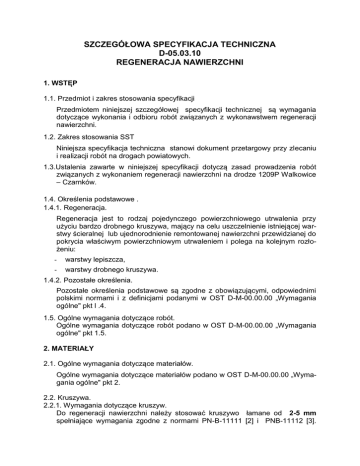 SZCZEGÓŁOWA SPECYFIKACJA TECHNICZNA D-05.03.10 REGENERACJA NAWIERZCHNI 1. WSTĘP 1.1. Przedmiot i zakres stosowania specyfikacji Przedmiotem niniejszej szczegółowej specyfikacji technicznej są wymagania dotyczące wykonania i odbioru robót związanych z wykonawstwem regeneracji nawierzchni. 1.2. Zakres stosowania SST Niniejsza specyfikacja techniczna stanowi dokument przetargowy przy zlecaniu i realizacji robót na drogach powiatowych. 1.3.Ustalenia zawarte w niniejszej specyfikacji dotyczą zasad prowadzenia robót związanych z wykonaniem regeneracji nawierzchni na drodze 1209P Walkowice – Czarnków. 1.4. Określenia podstawowe . 1.4.1. Regeneracja. Regeneracja jest to rodzaj pojedynczego powierzchniowego utrwalenia przy użyciu bardzo drobnego kruszywa, mający na celu uszczelnienie istniejącej warstwy ścieralnej lub ujednorodnienie remontowanej nawierzchni przewidzianej do pokrycia właściwym powierzchniowym utrwaleniem i polega na kolejnym rozłożeniu: - warstwy lepiszcza, - warstwy drobnego kruszywa. 1.4.2. Pozostałe określenia. Pozostałe określenia podstawowe są zgodne z obowiązującymi, odpowiednimi polskimi normami i z definicjami podanymi w OST D-M-00.00.00 „Wymagania ogólne" pkt l .4. 1.5. Ogólne wymagania dotyczące robót. Ogólne wymagania dotyczące robót podano w OST D-M-00.00.00 „Wymagania ogólne" pkt 1.5. 2. MATERIAŁY 2.1. Ogólne wymagania dotyczące materiałów. Ogólne wymagania dotyczące materiałów podano w OST D-M-00.00.00 „Wymagania ogólne" pkt 2. 2.2. Kruszywa. 2.2.1. Wymagania dotyczące kruszyw. Do regeneracji nawierzchni należy stosować kruszywo łamane od 2-5 mm spełniające wymagania zgodne z normami PN-B-11111 [2] i PNB-11112 [3]. Do wykonania regeneracji nawierzchni nie dopuszcza się kruszywa pochodzącego ze skał wapiennych. 2.2.2. Składowanie kruszyw. Wykonawca zapewni składowanie kruszyw na składowiskach zlokalizowanych jak najbliżej wykonywanego odcinka regeneracji nawierzchni. Podłoże składowiska powinno być równe, dobrze odwodnione, czyste, o twardej powierzchni zabezpieczającej przed zanieczyszczeniem kruszywa w czasie jego składowania i poboru. 2.3. Lepiszcza. 2.3.1. Wymagane dla lepiszczy Do regeneracji nawierzchni należy stosować drogowe emulsje asfaltowe modyfikowane SBS K1-65 w ilości 1,20 l/m2 spełniające wymagania zgodnie z opracowaniem „Warunki techniczne. Drogowe kationowe emulsje asfaltowe Em-94" - IBDiM - 1994 [6]. 2.3.2. Składowanie lepiszczy Do składowania lepiszczy Wykonawca użyje cystern, które powinny być czyste i nie powinny zawierać resztek innych lepiszczy. Przy przechowywaniu asfaltowej emulsji Wykonawca jest zobowiązany przestrzegać następujących zasad: - czas składowania emulsji nie powinien przekraczać 3 m-cy od daty jej wyprodukowania, - temperatura przechowywania emulsji nie powinna być niższa niż +5°C. 3. SPRZĘT 3.1. Ogólne wymagania dotyczące sprzętu. Ogólne wymagania dotyczące sprzętu podano w OST D-M-00.00.00 „Wymagania ogólne" pkt 3. 3.2. Sprzęt do wykonania regeneracji nawierzchni Wykonawca przystępując do wykonania regeneracji nawierzchni powinien wykazać się możliwością korzystania z następującego sprzętu: - szczotek mechanicznych – do oczyszczenia nawierzchni i usuwania niezwiązanych ziarn po wykonaniu powierzchniowego utrwalenia, - skrapiarek lepiszcza - do rozłożenia lepiszcza na nawierzchni, - rozsypywarek kruszywa - do rozłożenia kruszywa na nawierzchni, - walców drogowych-do przywałowania rozłożonego kruszywa. 3.3. Wymagania dla sprzętu 3.3.1.Szczotki mechaniczne Zaleca się stosowania urządzeń dwuszczotkowych, w skład których wchodzi szczotka wykonana z twardych elementów czyszczących, służących do zdrapywania i usuwania zanieczyszczeń, oraz szczotka miękka służąca do zamiatania i usuwania niezwiązanych ziarn kruszywa. 3.3.2.Skrapiarka lepiszcza. Wykonawca robót jest zobowiązany do użycia tylko takiej skrapiarki, która zapewni rozłożenie na jezdni przewidzianej ilości lepiszcza równomiernie, zarówno w kierunku podłużnym jak i poprzecznym. Dla zapewnienia równomiernego rozłożenia przewidzianej ilości lepiszcza na nawierzchni, skrapiarka powinna być wyposażona w urządzenie pomiarowokontrolne oraz mechanizmy regulacyjne, pozwalające na sprawdzenie i regulowanie parametrów takich jak: - temperatury rozkładanego lepiszcza, - ciśnienia lepiszcza w kolektorze, - obrotów pompy dozującej lepiszcze, - prędkości poruszania się skrapiarki (szczególnie dokładny pomiar i wskazanie w zakresie zwykle od 3 do 6 km/h), - wysokość i długość kolektora do rozkładania lepiszcza. Dla zachowania niezmiennej temperatury rozkładanego lepiszcza, skrapiarka powinna posiadać zbiornik izolowany termicznie. Kolektor skrapiarki powinien być wyposażony w dysze szczelinowe oraz posiadać regulacje wysokości swojego położenia nad powierzchnią jezdni, dla zapewnienia równomiernego pokrycia nawierzchni lepiszczem z dwóch lub trzech dysz. Nie dopuszcza się stosowania skrapiarek, których kolektor jest wyposażony w dysze stożkowe. Zależność między wydatkiem lepiszcza a nastawieniami regulowanych parametrów takich jak: ciśnienie, obroty pompy, prędkość jazdy skrapiarki i temperatura lepiszcza powinny być zawarte w aktualnych wynikach cechowania skrapiarki. Skrapiarkę można uznać za przydatną do wykonania powierzchniowego utrwalenia, jeżeli odchylenia rozkładanego lepiszcza od ilości założonych mieszczą się w przedziale 10% w kierunku podłużnym i poprzecznym. 3.3.3.Rozsypywarka kruszywa Do wykonania powierzchniowego utrwalenia Wykonawca zapewni jeden z poniższych typów rozsypywarek kruszywa: - doczepną do skrzyni samochodu z kruszywem, - pchaną przez samochód z kruszywem, - samojezdną, - doczepną do skrapiarki. Ze względu na konieczność uzyskania dużej dokładności dozowania kruszywa preferuje się użycie rozsypywarek samojezdnych. Rozsypywarkę mo