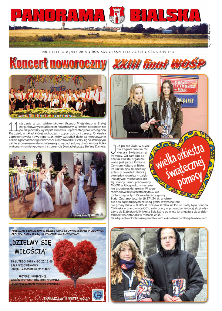 zdj. Rafał Hajewski NR 1 (241) • styczeń 2015 • ROK XXV • ISSN 1232-73-528 • CENA 2,50 zł • Koncert noworoczny XXIII finał WOŚP 11 stycznia w sali widowiskowej Urzędu Miejskiego w Białej zorganizowany został koncert noworoczny. W dwóch odsłonach nie po raz pierwszy wystąpiła Orkiestra Reprezentacyjna Euroregionu Pradziad, w skład której wchodzą muzycy polscy i czescy. Orkiestra zaprezentowała nowy repertuar, który wzbudził duże zainteresowanie licznie zgromadzonej publiczności. Orkiestra od lat cieszy się niesłabnącym zainteresowaniem widzów. Interesująco wypadł solowy utwór Ambos Polka wykonany na nietypowym instrumencie (kowadle) przez Stefana Daniela. ciąg dalszy na str. 3 J uż po raz XXIII w styczniu zagrała Wielka Orkiestra Świątecznej Pomocy. Od samego początku kwesta organizowana jest przez Gminne Centrum Kultury w Białej. Po raz kolejny miejscowy sztab prowadził zbiórkę pieniędzy również – dzięki inicjatywie mieszkanki Białej Joanny Baran, pracownicy MGOK w Głogówku – na terenie głogóweckiej gminy, W tegorocznej kweście uczestniczyło 37 wolontariuszy, w tym 22 na obszarze gminy Biała. Zebrano łącznie 16.274,34 zł. w obrębie obu sąsiadujących ze sobą gmin, w tym na terenie gminy Biała – 8.205 zł. Szefem sztabu WOŚP w Białej była Joanna Chilińska – pracownica GCK, a do pracy w prowadzeniu całej akcji włączyły się Elżbieta Malik i Anita Bąk, które od wielu lat angażują się w działalność wolontariatu w ramach WOŚP. Na zdjęciach wolontariusze przed bialskim kościołem i pod Urzędem Miejskim. PANORAMA BIALSKA • STYCZEŃ • 2015 2 Rada powołała komisje 18 grudnia 2014 r. na sesji Rady Miejskiej powołane zostały komisje problemowe. Radny Leonard Peszel zaproponował (w imieniu grupy radnych) powołanie pięcioosobowych składów poszczególnych komisji. Przewodniczącymi komisji zostali: –– Gabriela Neugebauer – przewodnicząca komisji gospodarczej, –– Elżbieta Malik – przewodnicząca komisji oświaty, kultury, zdrowia, spraw socjalnych i porządku publicznego, –– Alfred Krupa – przewodniczący komisji rolnictwa, gospodarki żywnościowej, leśnictwa i ochrony środowiska, –– Maria Moszczeńska – przewodnicząca komisji rewizyjnej. Wymienione kandydatury zostały przyjęte jednogłośnie w głosowaniu jawnym. Składy poszczególnych komisji: –– Komisja gospodarcza: Lidia Cziomer, Jacek Czerwiński, Robert Roden, Joanna Słowińska, –– Komisja oświaty, kultury, zdrowia, spraw socjalnych i porządku publicznego: Maria Moszczeńska, Aneta Płachta, Leonadr Peszel, Damian Tarnowski, –– Komisja rolnictwa, gospodarki żywnościowej, leśnictwa i ochrony środo- wiska: Adrian Harnys, Karol Biskup, Roman Barysz, Monika Wollna, –– Komisja rewizyjna: Maria Moszczeńska, Lidia Cziomer, Gabriela Neugebauer, Joanna Słowińska. Zaproponowano wybór przedstawicieli bialskiej gminy do Związku Gmin Aqua Silesia. Z mocy prawa jego członkiem jest nowo wybrany burmistrz Edward Plicko. Pozostałymi członkami związku zostali wybrani Robert Roden i Leonard Peszel. W imieniu klubu koalicyjnego w dalszej części obrad radny Leonard Peszel zaproponował wysokość wynagrodzenia dla burmistrza Edwarda Plicko w wysokości: –– wynagrodzenie zasadnicze – 5.000 zł –– dodatek funkcyjny – 1.300 zł –– dodatek specjalny – 1.890 zł –– dodatek stażowy – 1.000 zł Łączne wynagrodzenie burmistrza wynosić będzie 9.190 zł miesięcznie (brutto). Na zakończenie obrad burmistrz Edward Plicko złożył uczestnikom sesji życzenia świąteczne. Przewodniczący Robert Roden odczytał list gratulacyjny z życzeniami dla radnych w ystosowany przez Ryszarda Wilczyńskiego – wojewodę opolskiego. W końcowej części sesji grupa uczniów ze Szkoły Podstawowej w Białej przedstawiła program kolędniczy. Ostatnia, grudniowa sesja Na IV sesji Rady Miejskiej w nowej kadencji, która odbyła się 30 grudnia 2014 r., podjęta została uchwała w sprawie zmiany uchwały dotyczącej wieloletniej prognozy finansowej gminy Biała na lata 2014-2028. Zmiany te wynikają z uchwalenia zmian w budżecie gminy na 2014 r. oraz dotyczą zwiększenia i zmniejszenia dochodów oraz wydatków budżetowych. Wieloletnia Prognoza Finansowa skorygowana została również o aktualne dane wynikające z wytycznych przekazanych przez Ministerstwo Finansów. W zakresie przedsięwzięć wprowadzono dwa zadania, na które gmina posiada dokumentację, a kosztorysy opracowane zostały w 2014 r. Dotyczą one: –– budowy oświetlenia ulicznego na ulicach: Asnyka, św. Kamila i Eichendorfa w Białej – koszt 120.000 zł. Planowana realizacja zadania w 2016 r., –– rozbudowy oświetlenia ulicznego na ul. Oświęcimskiej w Białej – koszt zadania: 146.000 zł. Planowana realizacja w 2017 r. Podjęta została uchwała w sprawie niewygasania wydatków bieżących w 2014 roku. Dotyczy to zadań, które zostaną rozliczone w pierwszych czterech miesiącach 2015 r. Chodzi o rozliczenia przebudowy budynku komunalnego w Białej przy ul. Moniuszki 3 i planu zagospodarowania przestrzennego wsi Chrzelice. Uchwalony został Gminny Program Profilaktyki i Rozwiązywania Problemów Alkoholowych oraz Przeciwdziałania Narkomanii. Podjęto uchwałę w sprawie przeprowadzenia w I kwartale 2015 r. wyborów sołtysów i rad sołeckich na kadencję 2014-2018. Wybory zostaną przeprowadzone na zebraniach wiejskich, których harmonogram zamieszczamy w tym wydaniu gazety. Uchwalony został ramowy plan pracy Rady Miejskiej na 2015 r. Na zakończenie obrad przewodniczący Robert Roden i burmistrz Edward Plicko złożyli uczestnikom życzenia noworoczne. Nie zabrakło życzeń i kwiatów dla radnej Elżbiety Malik obchodzącej rocznicę urodzin. Była to również pierwsza sesja, która została w całości nagrana kamerą filmową. (n) Gminna profilaktyka G minny Program Profilaktyki i Rozwiązywania Prob