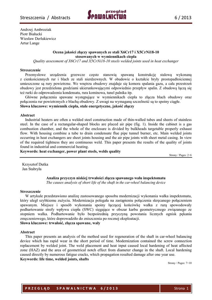 Streszczenia / Abstracts 6 / 2013 Andrzej Ambroziak Piotr Białucki Wiesław Derlukiewicz Artur Lange Ocena jakości złączy spawanych ze stali X6Cr17 i X5CrNi18-10 stosowanych w wymiennikach ciepła Quality assessment of X6Cr17 and X5CrNi18-10 steels welded joints used in heat exchanger Streszczenie Przemysłowe urządzenia grzewcze często stanowią spawaną konstrukcję stalową wykonaną z cienkościennych rur i blach ze stali nierdzewnych. W obudowie o kształcie bryły prostopadłościennej umieszczone są rury powietrzne. We wnętrzu obudowy znajduje się komora spalania gazu, a cała przestrzeń obudowy jest przedzielona grodziami ukierunkowującymi odpowiednio przepływ spalin. Z obudową łączą się też rurki do odprowadzenia kondensatu, rura kominowa, tunel palnika itp. Główne połączenia spawane występujące w wymiennikach ciepła to złącza blach obudowy oraz połączenia rur powietrznych z blachą obudowy. Z uwagi na wymaganą szczelność są to spoiny ciągłe. Słowa kluczowe: wymiennik ciepła, stale energetyczne, jakość złączy Abstract Industrial heaters are often a welded steel construction made of thin-walled tubes and sheets of stainless steel. In the case of a rectangular-shaped blocks are placed air pipe (fig. 1). Inside the cabinet is a gas combustion chamber, and the whole of the enclosure is divided by bulkheads targetable properly exhaust flow. With housing combine a tube to drain condensate flue pipe tunnel burner, etc. Main welded joints occurring in heat exchangers are sheet joints housing and the air pipe joints with sheet metal casing. In view of the required tightness they are continuous weld. This paper presents the results of the quality of joints found in industrial and commercial heating. Keywords: heat exchanger, power plant steels, welds quality Strony / Pages: 2÷6 Krzysztof Dutka Jan Stabryła Analiza przyczyn niskiej trwałości złącza spawanego wału inspektomatu The causes analysis of short life of the shaft in the car-wheel balancing device Streszczenie W artykule przedstawiono analizę zastosowanego sposobu modernizacji wykonania wałka inspektomatu, który uległ szybkiemu zużyciu. Modernizacja polegała na zastąpieniu połączenia skręcanego połączeniem spawanym. Miejsce i sposób wykonania spoiny łączącej końcówkę wałka z rurą spowodowały podhartowanie strefy wpływu ciepła (SWC) sięgające w obszar karbu geometrycznego związanego ze stopniem wałka. Podhartowanie było bezpośrednią przyczyną powstania licznych ognisk pękania zmęczeniowego, które doprowadziło do zniszczenia po rocznej eksploatacji. Słowa kluczowe: trwałość, złącza spawane, wały Abstract This paper presents an analysis of the method used for regeneration of the shaft in car-wheel balancing device which has rapid wear in the short period of time. Modernization contained the screw connection replacement by welded joint. The weld placement and heat input caused local hardening of heat affected zone (HAZ) and the area of geometrical notch effect from diameter change in the shaft. Local hardening caused directly by numerous fatigue cracks, which propagation resulted damage after one year use. Keywords: life time, welded joints, shafts Strony / Pages: 7÷10 PRZEGLĄD SPAWALNICTWA 6/2013 Strona 1 Streszczenia / Abstracts 6 / 2013 Andrzej Ambroziak Piotr Białucki Wiesław Derlukiewicz Artur Lange Leszek Łatka Badania połączeń elektrotechnicznych lutowanych na miękko Study of soldered electrotechnical joints Streszczenie Przedmiotem badań były złącza elektrotechniczne przewodów miedzianych do miedzianej ścieżki płytki obwodu drukowanego lutowanych lutem miękkim bezołowiowym na osnowie cyny. Zakres badań obejmował określenie wytrzymałości złączy lutowanych na ścinanie przy siłach rozciągających złącze oraz wykonanie badań makro- i mikroskopowych. Słowa kluczowe: złącza lutowane, lutowanie miękkie, mikrostruktura, właściwości mechaniczne Abstract The electrotechnical soldered joints of copper wires to copper track printed circuit board were the object of investigations. The scope of research included determining the shear strength of soldered joints and macro- and microscopic investigations. Keywords: soldered joints, soldering, microstructure, mechanical properties Strony / Pages: 11÷14 Sylwia Mosińska Andrzej Ambroziak Artur Lange Piotr Białucki Wpływ przygotowania powierzchni na lutowność stali austenitycznych Influence of surface preparation on the solderability of austenitic steels Streszczenie W artykule przedstawiono techniki oczyszczania powierzchni z tlenków oraz zanieczyszczeń (smarów, olejów, zadziorów, opiłków i innych) powierzchni obrabianego metalu. Przedstawiono również trudności występujące przy lutowaniu stali austenitycznej. Słowa kluczowe: lutowność, stale austenityczne, właściwości powierzchni Abstract The paper presents techniques for cleaning the surface to elimination of oxides and contaminants (grease, oil, burrs, chips and other) from the surface of the machined metal piece. It also presents difficulties of soldering austenitic steel. Keywords: solderability, austenitic steels, surface properties, Strony / Pages: 15÷19 PRZEGLĄD SPAWALNICTWA 6/2013 Strona 2 Streszczenia / Abstracts 6 / 2013 Sven Selling Ronald Steusloff Wpływ płomienia acetylenu, propanu i metanu do podgrzewania wstępnego na właściwości stali drobnoziarnistej Effect of acetylene, propane and methane flame for preheating on the fine-grained steel properties Streszczenie Wykonano próby podgrzewania kilku gatunków stali do różnych wartości temperatury, mające na celu określenie skuteczności i wydajności ww. paliw gazowych oraz rozpoznanie ich potencjalnie szkodliwych skutków dla właściwości materiału. Badano możliwość wykorzystania poszczególnych gazów do ogrzewania, suszenia i podgrzewania wstępnego. Omówiono wpływ gazów na tworzenie się wody kondensacyjnej n