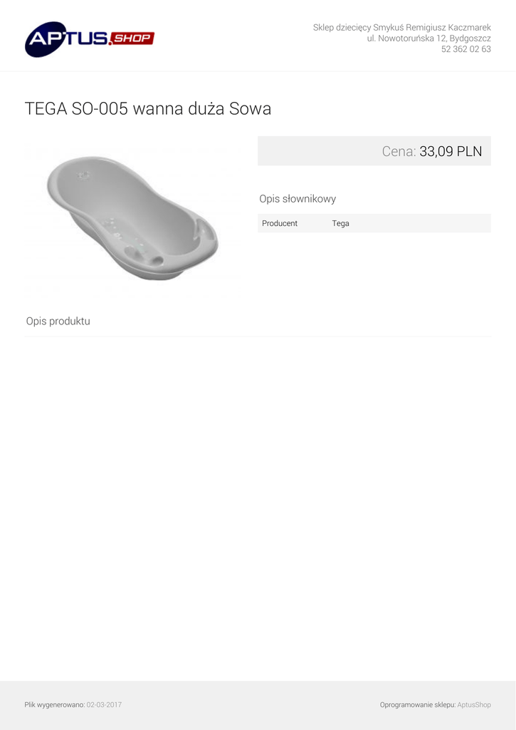 Sklep dziecięcy Smykuś Remigiusz Kaczmarek ul. Nowotoruńska 12, Bydgoszcz 52 362 02 63 TEGA SO-005 wanna duża Sowa Cena: 33,09 PLN Opis słownikowy Producent Tega Opis produktu Plik wygenerowano: 02-03-2017 Powered by TCPDF (www.tcpdf.org) Oprogramowanie sklepu: AptusShop
