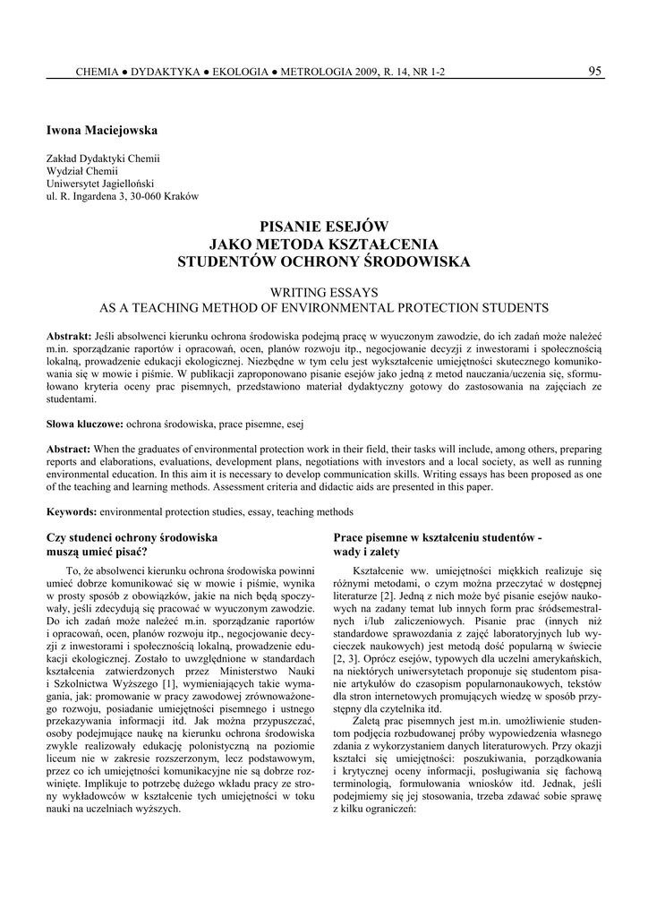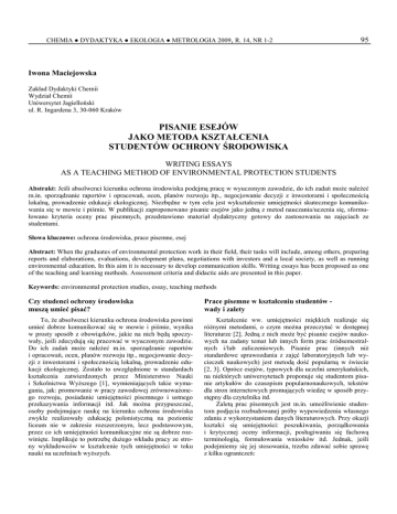 CHEMIA ● DYDAKTYKA ● EKOLOGIA ● METROLOGIA 2009, R. 14, NR 1-2 95 Iwona Maciejowska Zakład Dydaktyki Chemii Wydział Chemii Uniwersytet Jagielloński ul. R. Ingardena 3, 30-060 Kraków PISANIE ESEJÓW JAKO METODA KSZTAŁCENIA STUDENTÓW OCHRONY ŚRODOWISKA WRITING ESSAYS AS A TEACHING METHOD OF ENVIRONMENTAL PROTECTION STUDENTS Abstrakt: Jeśli absolwenci kierunku ochrona środowiska podejmą pracę w wyuczonym zawodzie, do ich zadań moŜe naleŜeć m.in. sporządzanie raportów i opracowań, ocen, planów rozwoju itp., negocjowanie decyzji z inwestorami i społecznością lokalną, prowadzenie edukacji ekologicznej. Niezbędne w tym celu jest wykształcenie umiejętności skutecznego komunikowania się w mowie i piśmie. W publikacji zaproponowano pisanie esejów jako jedną z metod nauczania/uczenia się, sformułowano kryteria oceny prac pisemnych, przedstawiono materiał dydaktyczny gotowy do zastosowania na zajęciach ze studentami. Słowa kluczowe: ochrona środowiska, prace pisemne, esej Abstract: When the graduates of environmental protection work in their field, their tasks will include, among others, preparing reports and elaborations, evaluations, development plans, negotiations with investors and a local society, as well as running environmental education. In this aim it is necessary to develop communication skills. Writing essays has been proposed as one of the teaching and learning methods. Assessment criteria and didactic aids are presented in this paper. Keywords: environmental protection studies, essay, teaching methods Czy studenci ochrony środowiska muszą umieć pisać? Prace pisemne w kształceniu studentów wady i zalety To, Ŝe absolwenci kierunku ochrona środowiska powinni umieć dobrze komunikować się w mowie i piśmie, wynika w prosty sposób z obowiązków, jakie na nich będą spoczywały, jeśli zdecydują się pracować w wyuczonym zawodzie. Do ich zadań moŜe naleŜeć m.in. sporządzanie raportów i opracowań, ocen, planów rozwoju itp., negocjowanie decyzji z inwestorami i społecznością lokalną, prowadzenie edukacji ekologicznej. Zostało to uwzględnione w standardach kształcenia zatwierdzonych przez Ministerstwo Nauki i Szkolnictwa WyŜszego [1], wymieniających takie wymagania, jak: promowanie w pracy zawodowej zrównowaŜonego rozwoju, posiadanie umiejętności pisemnego i ustnego przekazywania informacji itd. Jak moŜna przypuszczać, osoby podejmujące naukę na kierunku ochrona środowiska zwykle realizowały edukację polonistyczną na poziomie liceum nie w zakresie rozszerzonym, lecz podstawowym, przez co ich umiejętności komunikacyjne nie są dobrze rozwinięte. Implikuje to potrzebę duŜego wkładu pracy ze strony wykładowców w kształcenie tych umiejętności w toku nauki na uczelniach wyŜszych. Kształcenie ww. umiejętności miękkich realizuje się róŜnymi metodami, o czym moŜna przeczytać w dostępnej literaturze [2]. Jedną z nich moŜe być pisanie esejów naukowych na zadany temat lub innych form prac śródsemestralnych i/lub zaliczeniowych. Pisanie prac (innych niŜ standardowe sprawozdania z zajęć laboratoryjnych lub wycieczek naukowych) jest metodą dość popularną w świecie [2, 3]. Oprócz esejów, typowych dla uczelni amerykańskich, na niektórych uniwersytetach proponuje się studentom pisanie artykułów do czasopism popularnonaukowych, tekstów dla stron internetowych promujących wiedzę w sposób przystępny dla czytelnika itd. Zaletą prac pisemnych jest m.in. umoŜliwienie studentom podjęcia rozbudowanej próby wypowiedzenia własnego zdania z wykorzystaniem danych literaturowych. Przy okazji kształci się umiejętności: poszukiwania, porządkowania i krytycznej oceny informacji, posługiwania się fachową terminologią, formułowania wniosków itd. Jednak, jeśli podejmiemy się jej stosowania, trzeba zdawać sobie sprawę z kilku ograniczeń: 96 □ □ □ □ CHEMIA ● DYDAKTYKA ● EKOLOGIA ● METROLOGIA 2009, R. 14, NR 1-2 W dobie Internetu najwaŜniejszą trudnością jest konieczność ustalenia autorstwa pracy (a przynajmniej własnego wkładu danego studenta), w czym mogą pomóc programy typu plagiat.pl oraz porównanie stylu innych wypowiedzi studenta (zwykle dość „chropowatych”) ze stylem reprezentowanym w ocenianej pracy (w przypadku plagiatu znacznie bardziej „gładkim”). Jeśli chce się podejść rzetelnie do oceny tego typu prac, na wpisanie uwag i komentarzy trzeba poświęcić kaŜdej z nich (zakładając objętość pracy studenta ok. 6-8 stron) co najmniej 30 min, co przy duŜych grupach kumuluje się w całkiem pokaźną liczbę godzin. Nie do zaniedbania jest nakład pracy nauczyciela związany z przygotowaniem jasnych kryteriów oceny, co nie jest tak proste jak w przypadku egzaminu testowego, ale porównywalne z egzaminem pisemny o pytaniach otwartych. Nie wystarczy „zadać” studentom napisania pracy. Jeśli chce się wymagać jakiejś umiejętności, trzeba jej najpierw nauczyć. W tym przypadku oznacza to, Ŝe trzeba poświęcić część bardzo cennego czasu wykładowego lub seminaryjnego (zwykle jest go za mało, by omówić związane z tematyką przedmiotu zagadnienia) na przekazanie wiedzy na temat zasad pisania eseju lub rozprawy naukowej. Dlaczego esej? Na potrzeby nauk przyrodniczych definicję eseju moŜna podać studentom, korzystając z najchętniej wykorzystywanego przez nich źródła, czyli Wikipedii, następująco [4]: • „Esej (fr. essai - próba, essayer - próbować) - forma literacka lub literacko-naukowa, prezentująca punkt widzenia autora.” Lub teŜ czerpiąc z poradników literackich [5]: • „Esej kwalifikuje się do wypowiedzi o charakterze informacyjno-refleksyjnym […], wyróŜnia go podmiotowa perspektywa, z której zaprezentowane zostają jego treści […], ujawnia on zaangaŜowanie autora w rozwaŜaną problematykę, odwołuje się do jego doświadczeń, skali wartości.” Zastosowanie właśnie takiej f